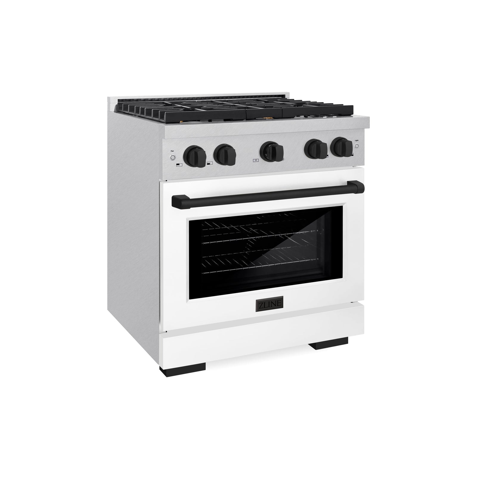 ZLINE Autograph 30" 4.2 cu. ft. Paramount Dual Fuel Range with 4 Burners in DuraSnow® with White Matte Door and Matte Black Accents, SDRSZ-WM-30-MB