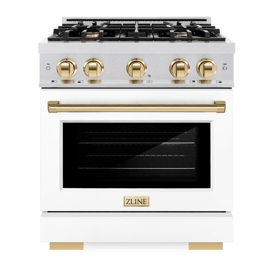 ZLINE Autograph 30" 4.2 cu. ft. Paramount Dual Fuel Range with 4 Burners in DuraSnow® with White Matte Door and Polished Gold Accents, SDRSZ-WM-30-G