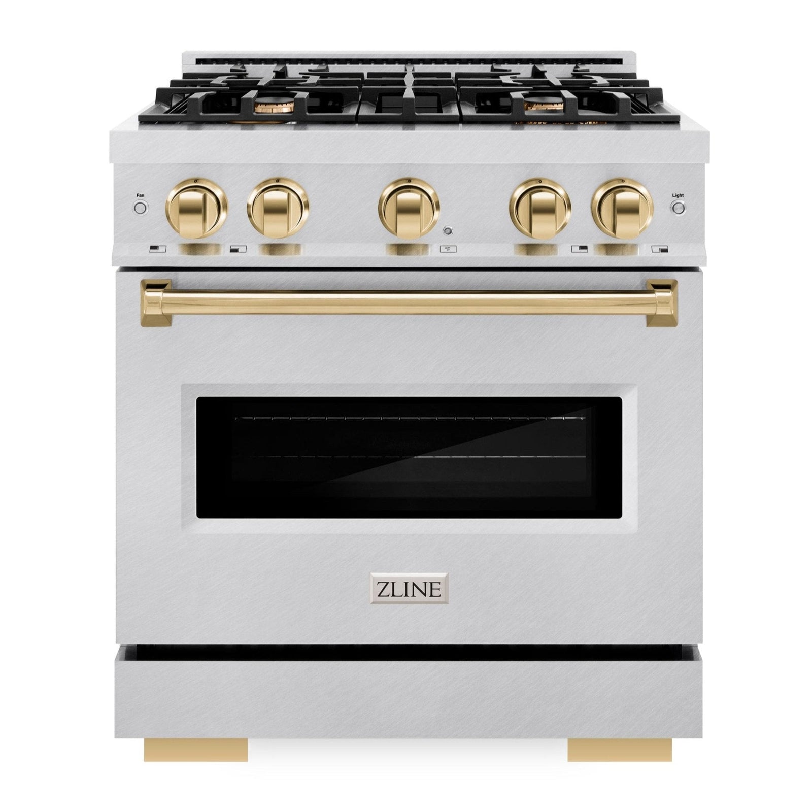 ZLINE Autograph 30" 4.2 cu. ft. Paramount Gas Range with Convection Gas Oven in DuraSnow® Stainless Steel and Gold Accents, SGRSZ-30-G