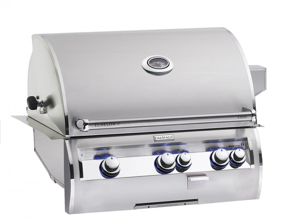 Exclusive Features of The ECHELON DIAMOND E660 are a double wall teardrop style seamless hood with integrated warming rack, backlit safety knobs,analog thermometer, contoured control panel, watertight woodchip smoker drawer with dedicated burner, recessed all stainless rotisserie back burner, manual ignition tubes and stainless steel valve manifold. One of the largest cooking surfaces available in a gas grill today! This grill offers a true 30" across the cooking surface, not the FRAME of the grill like others measure. A total whopping BTU rating of 78,000 on the main cooking surface and a 19,000 BTU rotisserie backburner for a combined total of 97,000 BTU's. The total cooking area is 660 sq. inches so it can hold just about anything you want to load up! Built-in halogen cooking lights. This grill is equipped with heat"zoned cooking" separators, allowing foods to be cooked at different temperatures. The ECHELON DIAMOND E660 also features 110 volt electric ignition.