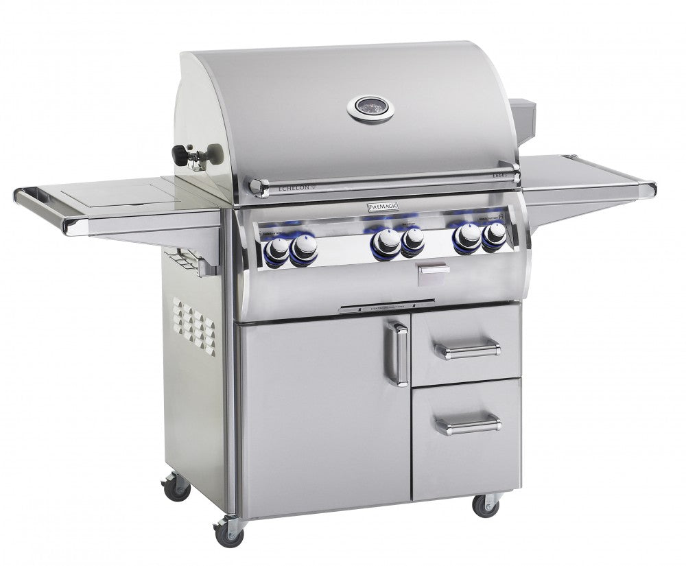 Exclusive Features of The ECHELON DIAMOND E790 include a builtin paper towel holder, backlit safety knobs, contoured control panel, heat zone separators, hot surface electronic ignition, cart has two 110V plug-in electrical outlets with 12V transformer (builtin requires hard wire, cart requires extension cord), dual internal halogen lamps in hood for easier evening grilling, manual tubes for match lighting, builtin analog meat and grill thermometer, water tight wood chip smoker drawer with dedicated burner, new cast stainless steel "E" burners and stainless steel valve manifold. The newest addition to the Firemagic line. The second largest cooking surface across the line! This grill offers a true 36" across the cooking surface, not the FRAME of the grill like others measure. A total whopping BTU rating of 99,000 on the main cooking surface and a full-length backburner rated at 23,000 BTU's. The total cooking area is almost 800 sq. inches so it can hold just about anything you want to load up!The stainless steel cart features dual storage doors below, a stainless steel prep shelf on the right side, and heavy-duty cart casters for ease of portability. This unit also includes a single side burner on the left side. Echelon Slide Show.