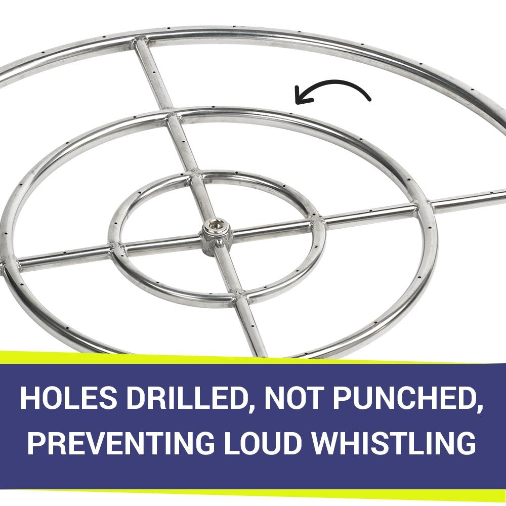 Our high quality 30" fire pit ring burner is designed to delight all onlookers with its amazing flame. The double concentric ring design increases the overall diameter of the burner, allowing for a truly realistic and evenly distributed flame. Furthermore, the burner holes have been drilled, not punched, which means no whistling noises are produced. Our burner also comes with a convenient ¾ inch gas inlet for easy connection to a natural or propane gas supply.