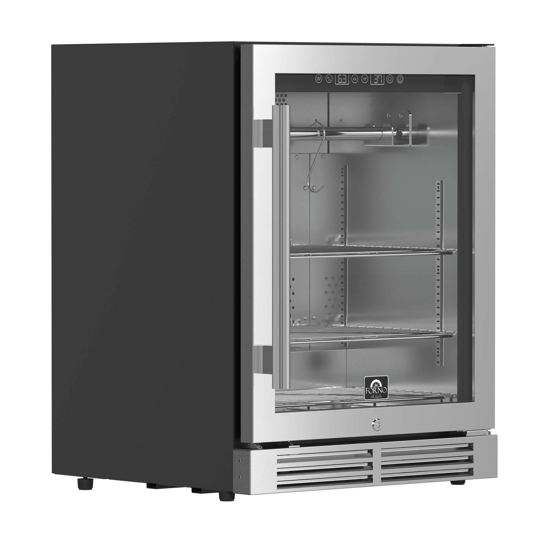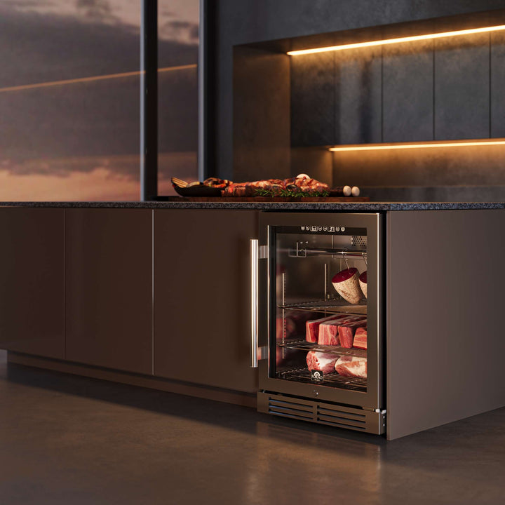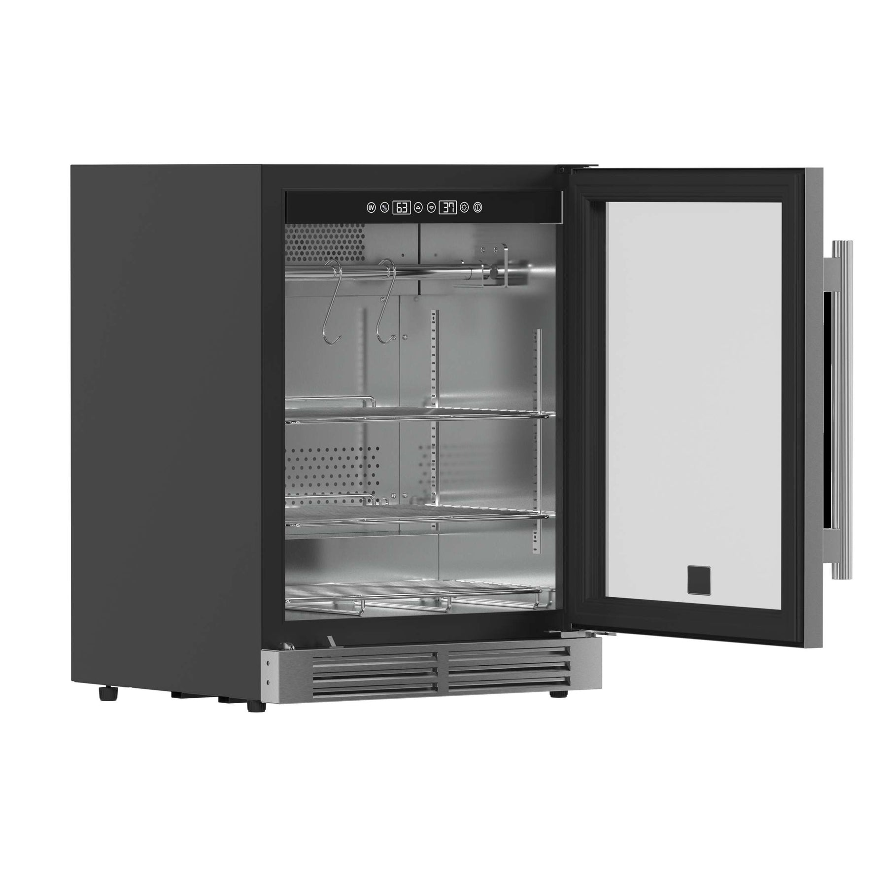The Forno Asciutto 24" Dry Ager delivers precision aging with dual evaporators and airflow, ensuring consistent temperature and humidity control. The energy-efficient inverter compressor runs quietly while maintaining ideal conditions, while the automatic defrost system eliminates manual maintenance. UVC sterilization effectively eliminates bacteria, including resistant strains, while the charcoal filter neutralizes odors for a fresh interior. The UV-protected glass door prevents harmful light exposure, preserving meat quality. A spacious 4.41 cu. ft. stainless steel 304 interior provides long-lasting durability. Customize storage two adjustable stainless steel shelves, two stainless steel hooks, and one stainless steel hanger for efficient, organized storage. The LED light strip enhances visibility, and the smart door alarm prevents temperature fluctuations, ensuring flawless aging results.