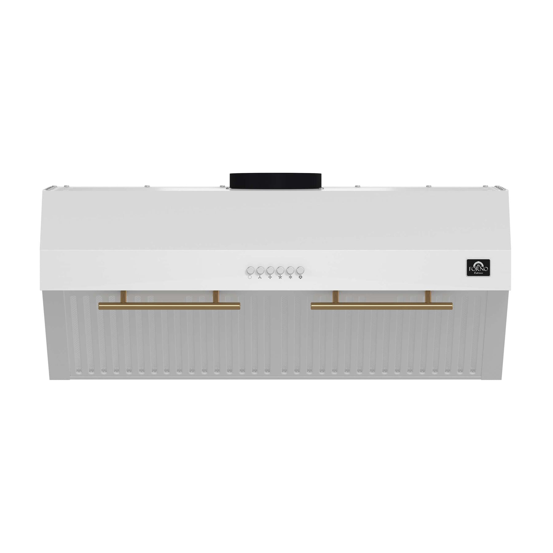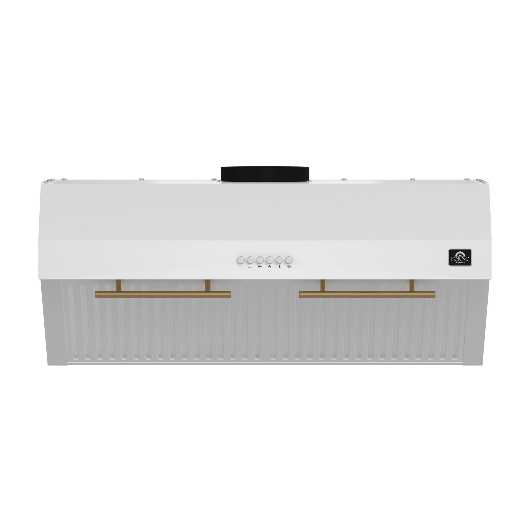 Forno presents the Bari 30 Inch Espresso Range Hood, an exceptional under cabinet range hood that boasts an elegant white finish, adding a touch of sophistication to your kitchen space. With its powerful 400 CFM airflow, this range hood efficiently eliminates cooking odours, smoke, and airborne grease, ensuring a fresh and clean environment. The user-friendly 4 speed push button control allows you to adjust the ventilation settings effortlessly, providing optimal performance tailored to your needs. Illuminate your cooking area with two built-in LED surface lights, offering bright and even lighting for a delightful culinary experience. Equipped with a durable hybrid filters, this range hood effectively traps grease and debris, ensuring easy maintenance and prolonging the lifespan of the appliance. Choose between the provided antique brass or stainless steel handles to customize the filters. Upgrade your kitchen with the versatile and high-performing under cabinet range hood from Forno, where style meets functionality.