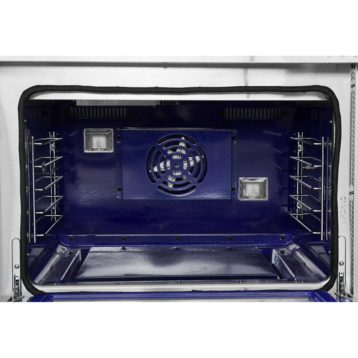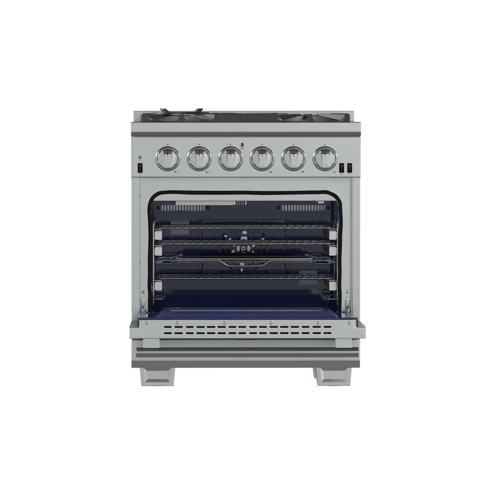 The Forno Capriasca 30 Inch Gas Range enhances your home kitchen with professional styling and performance through its durable and beautiful 304-grade stainless-steel design. The cooking surface features 5 sealed dual-ring brass burners, totaling 100,000 BTU. All burners, each at 20,000 BTU, can simmer precisely at 1,000 BTU. Continuous heavy-duty cast-iron grates facilitate easy sliding of pots or pans off heat over the enamel cooktop cavity, simplifying spill cleanup. The 4.32 cu. ft. gas oven, with a 30,000 BTU output and infrared red mesh broiler, enclosed in a blue enamel interior, offers optional convection for precise, and consistent cooking on multiple levels. For convenient viewing, a 3-layer glass oven door window is included. The package includes 3 telescopic stainless-steel oven racks, wok support, and an LP conversion kit. Additionally, zinc-coated illuminated metal knobs with bezel rings ensure enduring beauty.
