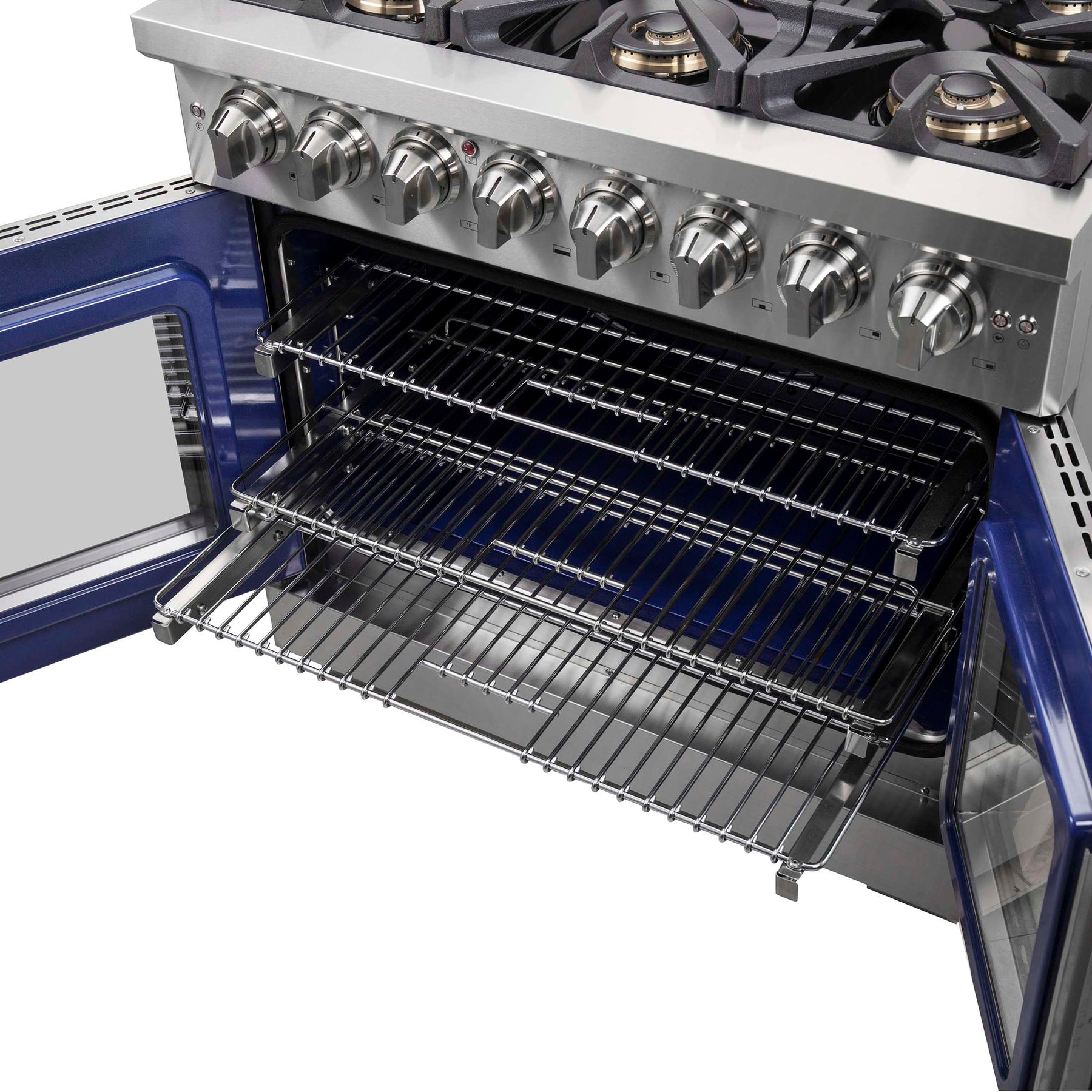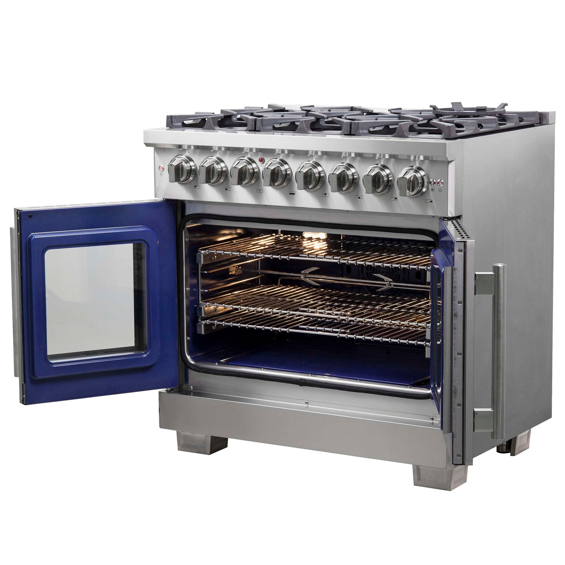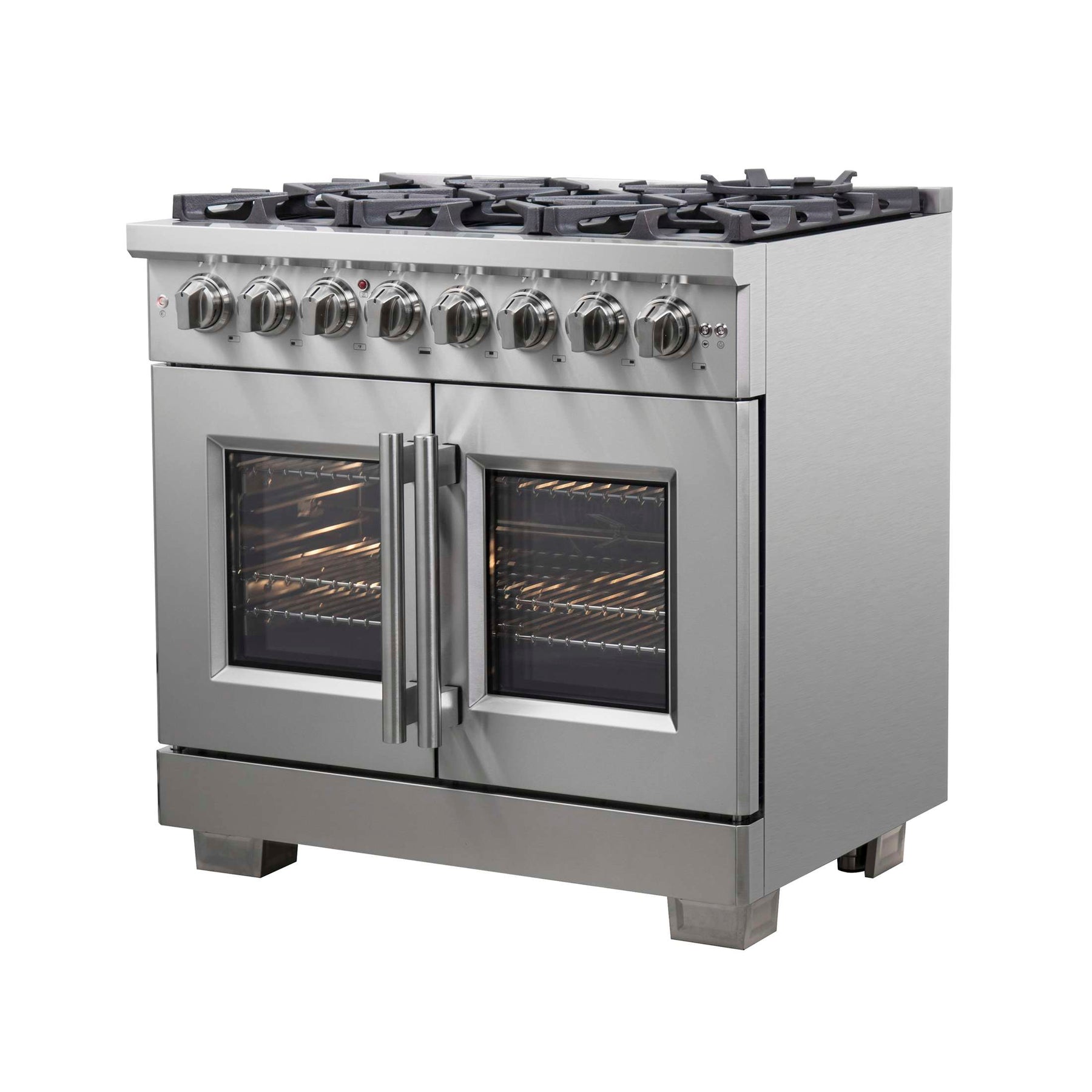 The Forno Capriasca 36-Inch french door dual fuel range harmonizes professional styling and performance into your home kitchen with its durable stainless-steel design. Unique french doors mean open doors allow up to 12 Inch of more space to access your oven. The gas rangetop has 6 sealed dual-ring brass burners with a total output of 120,000 BTU for simmering melting chocolate or simmering sauces. The heavy-duty continuous cast iron grates allow maximum stability of cookware and mobility over a recessed enamel Cooking Surface cavity which keeps spills and splashes contained and easy to clean. The 5.36 cu. ft. true convection oven with a total output of 6,300 Watts is encased in a speckled blue enamel interior, ensures fast, precise and consistent cooking along for easy viewing is a 3-layer glass oven door window. Included is an LP conversion kit, 3 stainless steel telescopic oven racks, wok support, reversible griddle, rotisserie kit and skewers forks, air fry basket with rack and drip pan. Additionally, zinc coated metal knobs with bezel rings will maintain their beauty for years.