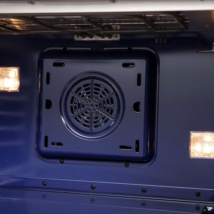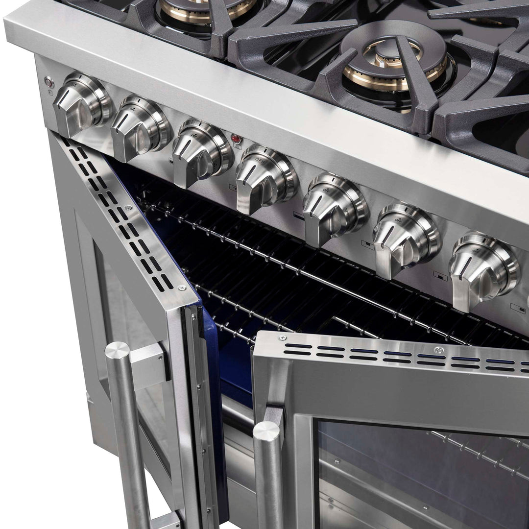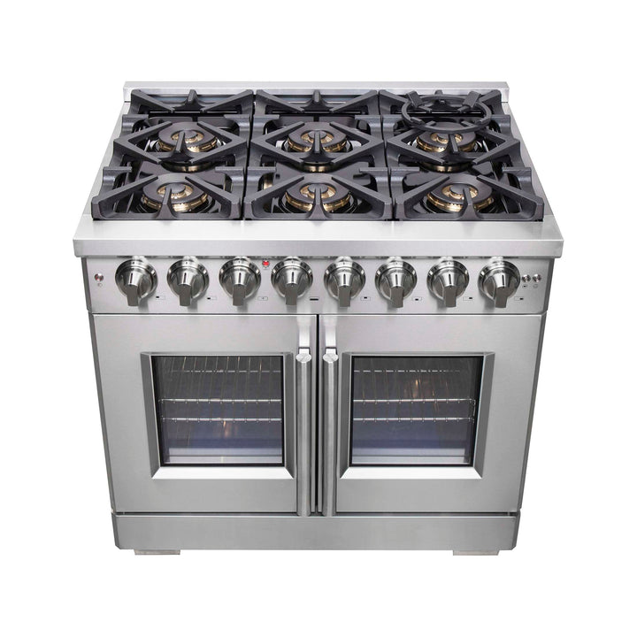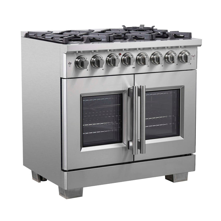 The Forno Capriasca 36-Inch french door dual fuel range harmonizes professional styling and performance into your home kitchen with its durable stainless-steel design. Unique french doors mean open doors allow up to 12 Inch of more space to access your oven. The gas rangetop has 6 sealed dual-ring brass burners with a total output of 120,000 BTU for simmering melting chocolate or simmering sauces. The heavy-duty continuous cast iron grates allow maximum stability of cookware and mobility over a recessed enamel Cooking Surface cavity which keeps spills and splashes contained and easy to clean. The 5.36 cu. ft. true convection oven with a total output of 6,300 Watts is encased in a speckled blue enamel interior, ensures fast, precise and consistent cooking along for easy viewing is a 3-layer glass oven door window. Included is an LP conversion kit, 3 stainless steel telescopic oven racks, wok support, reversible griddle, rotisserie kit and skewers forks, air fry basket with rack and drip pan. Additionally, zinc coated metal knobs with bezel rings will maintain their beauty for years.