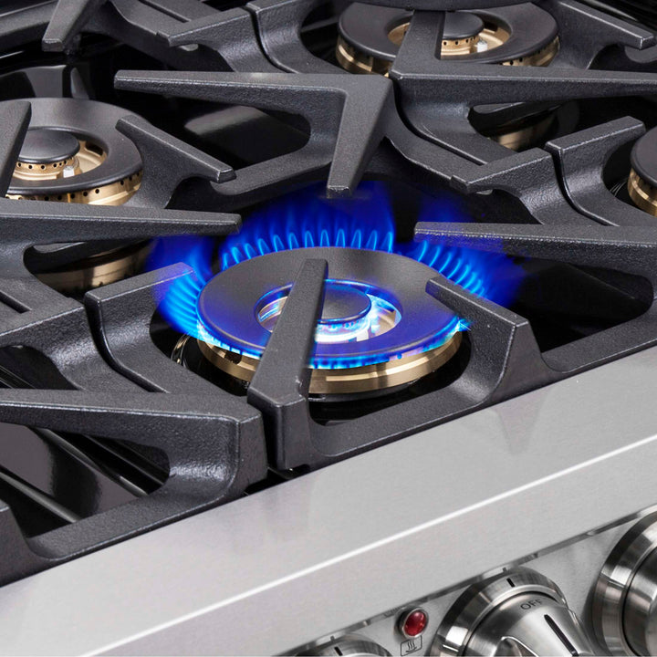 * 6 sealed dual-ring brass burners combine a total rangetop power of 120,000 BTU