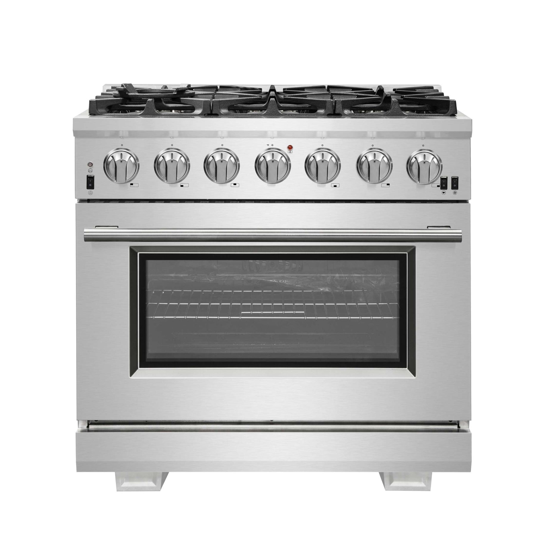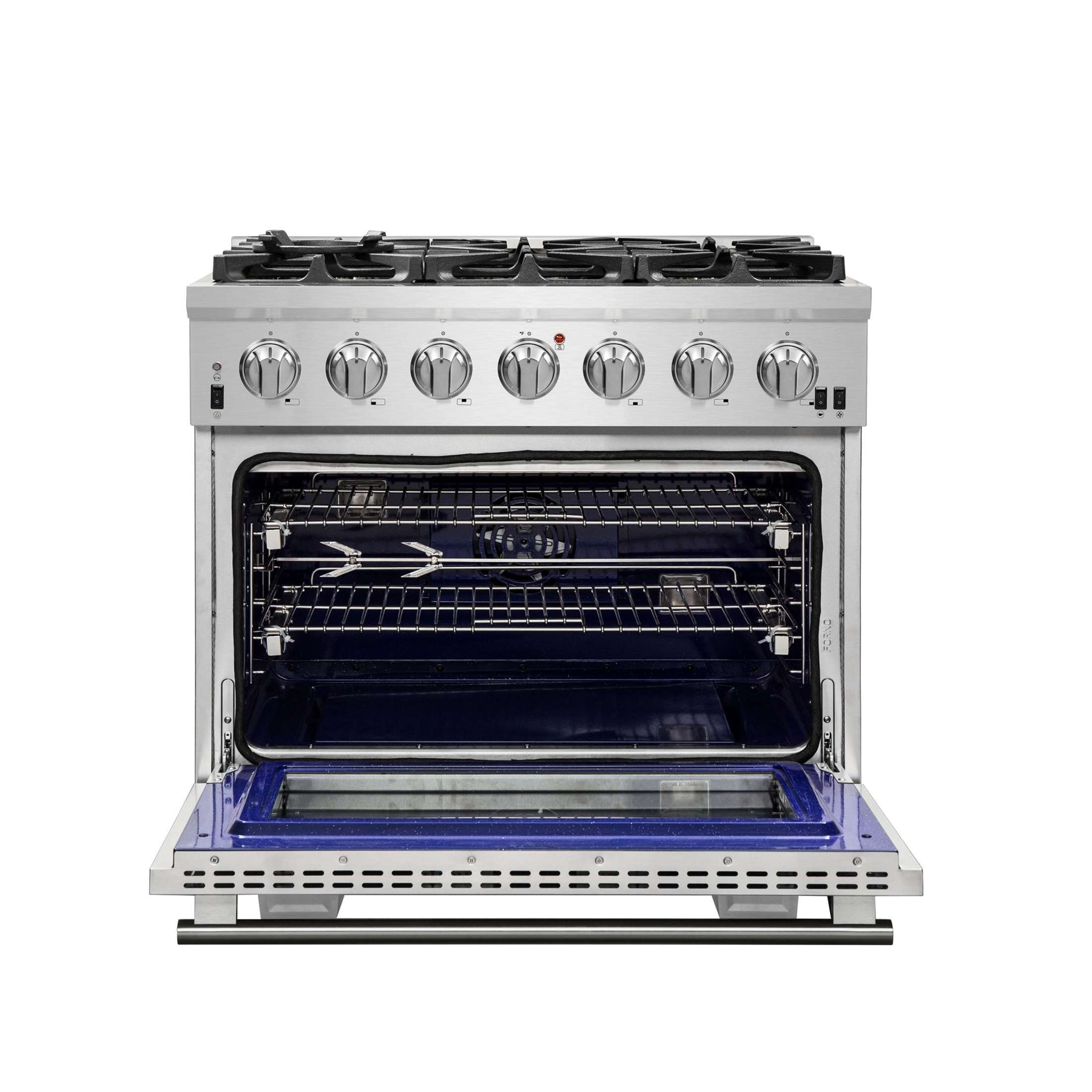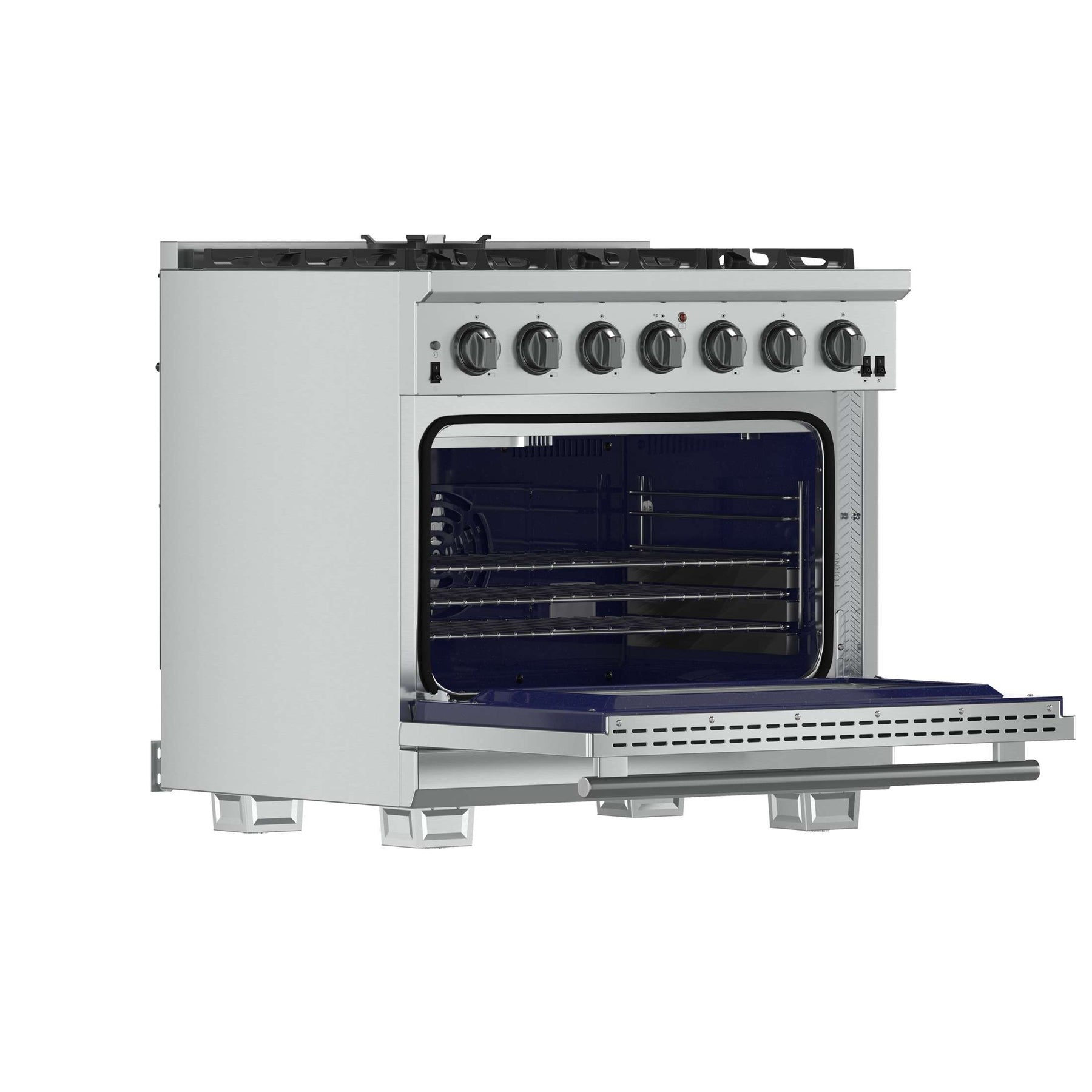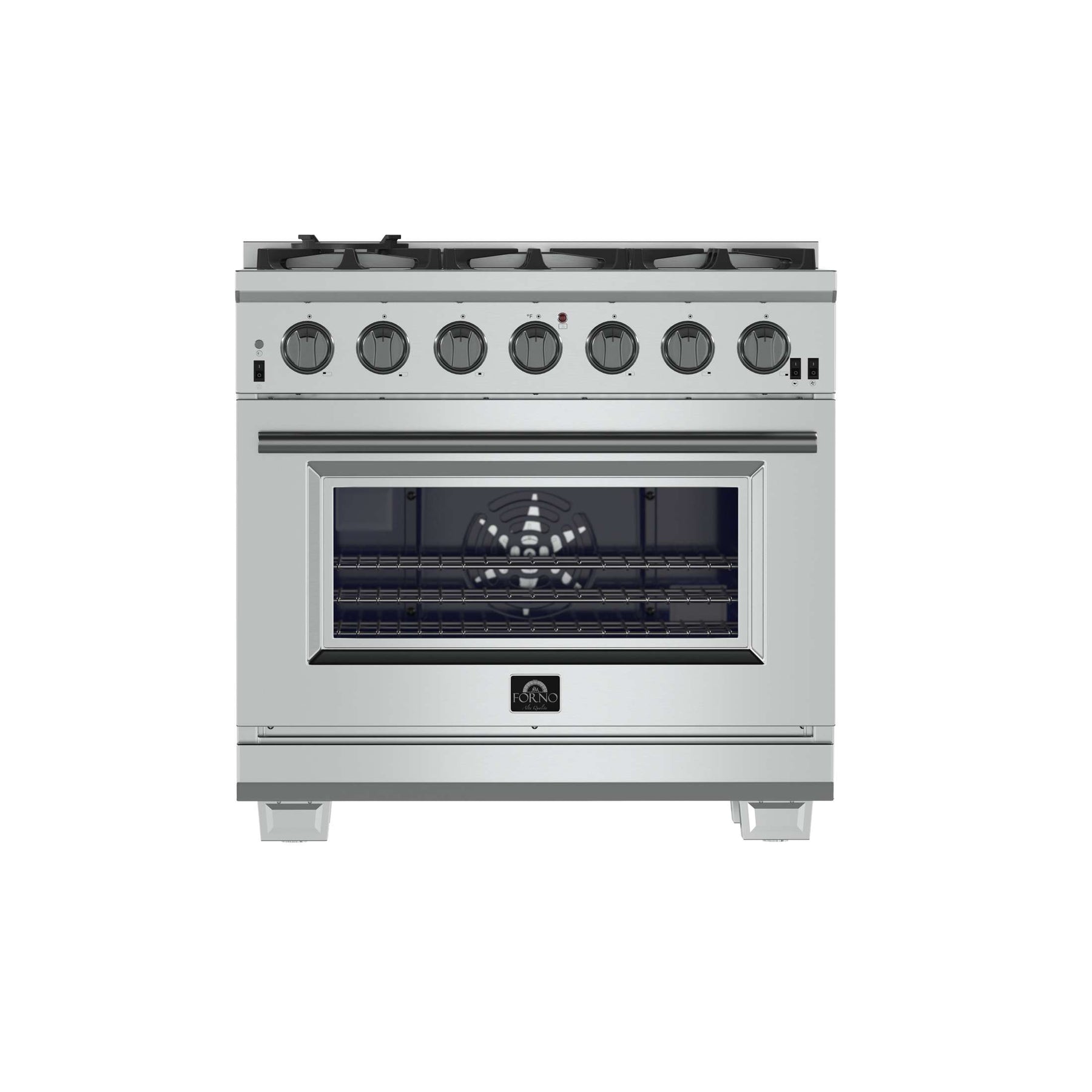 The Forno Capriasca 36 Inch Gas Range enhances your home kitchen with professional styling and performance through its durable and beautiful 304-grade stainless-steel design. The cooking surface features 6 sealed dual-ring brass burners, totaling 120,000 BTU. All burners, each at 20,000 BTU, can simmer precisely at 1,000 BTU. Continuous heavy-duty cast-iron grates facilitate easy sliding of pots or pans off heat over the enamel cooktop cavity, simplifying spill cleanup. The 5.36 cu. ft. gas oven, with a 30,000 BTU output and infrared red mesh broiler, enclosed in a blue enamel interior, offers optional convection for precise, and consistent cooking on multiple levels. For convenient viewing, a 3-layer glass oven door window is included. The package includes 3 telescopic stainless-steel oven racks, wok support, and an LP conversion kit. Additionally, zinc-coated illuminated metal knobs with bezel rings ensure enduring beauty.