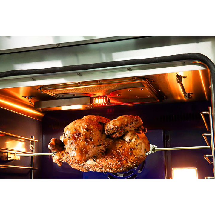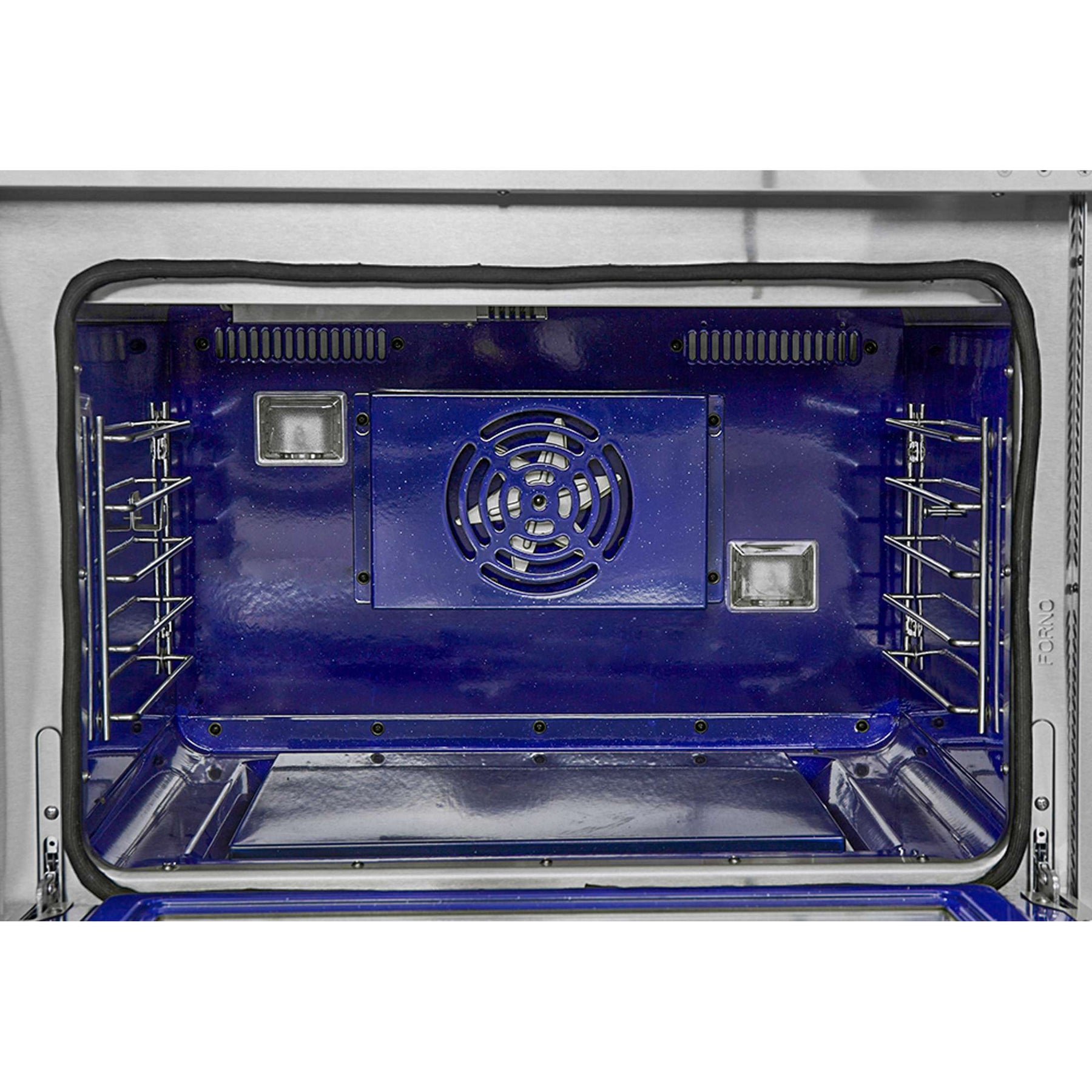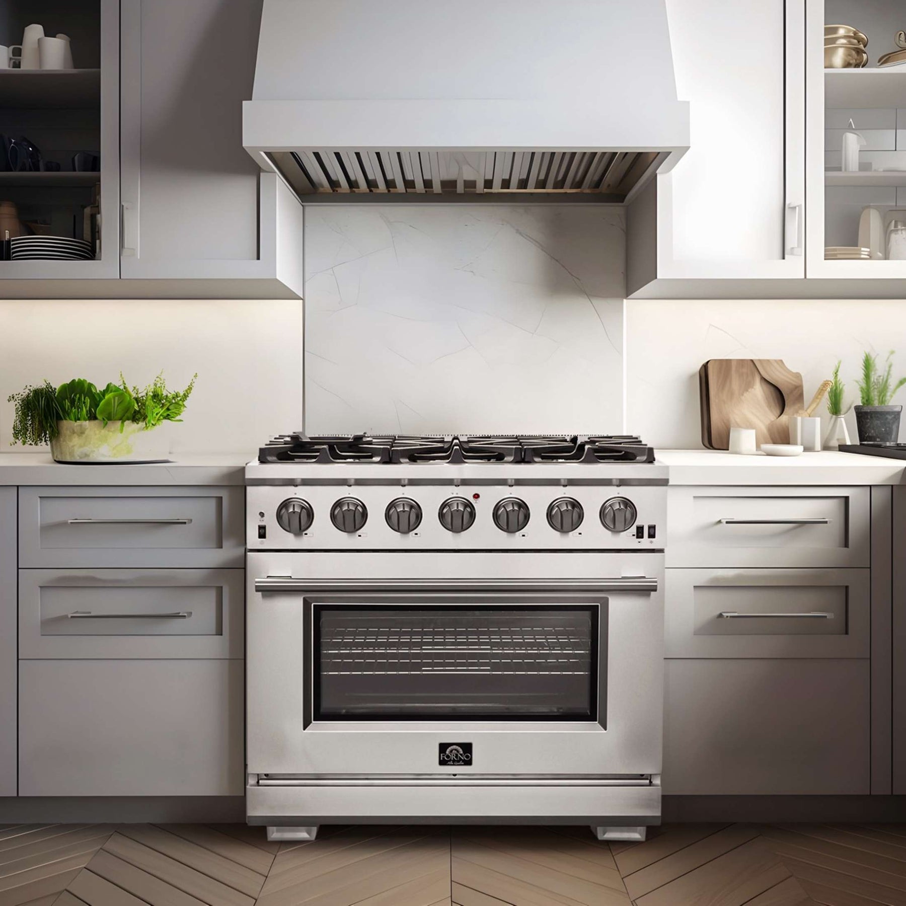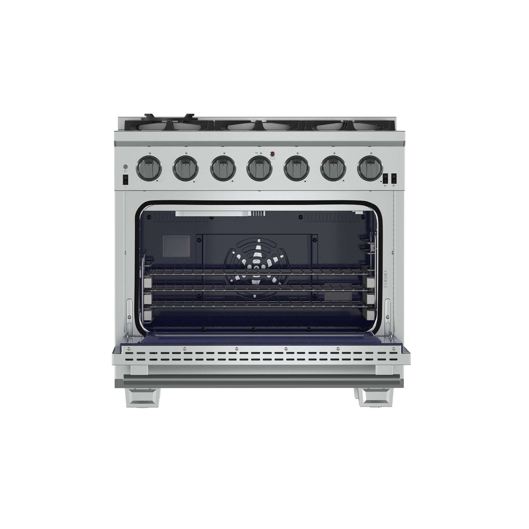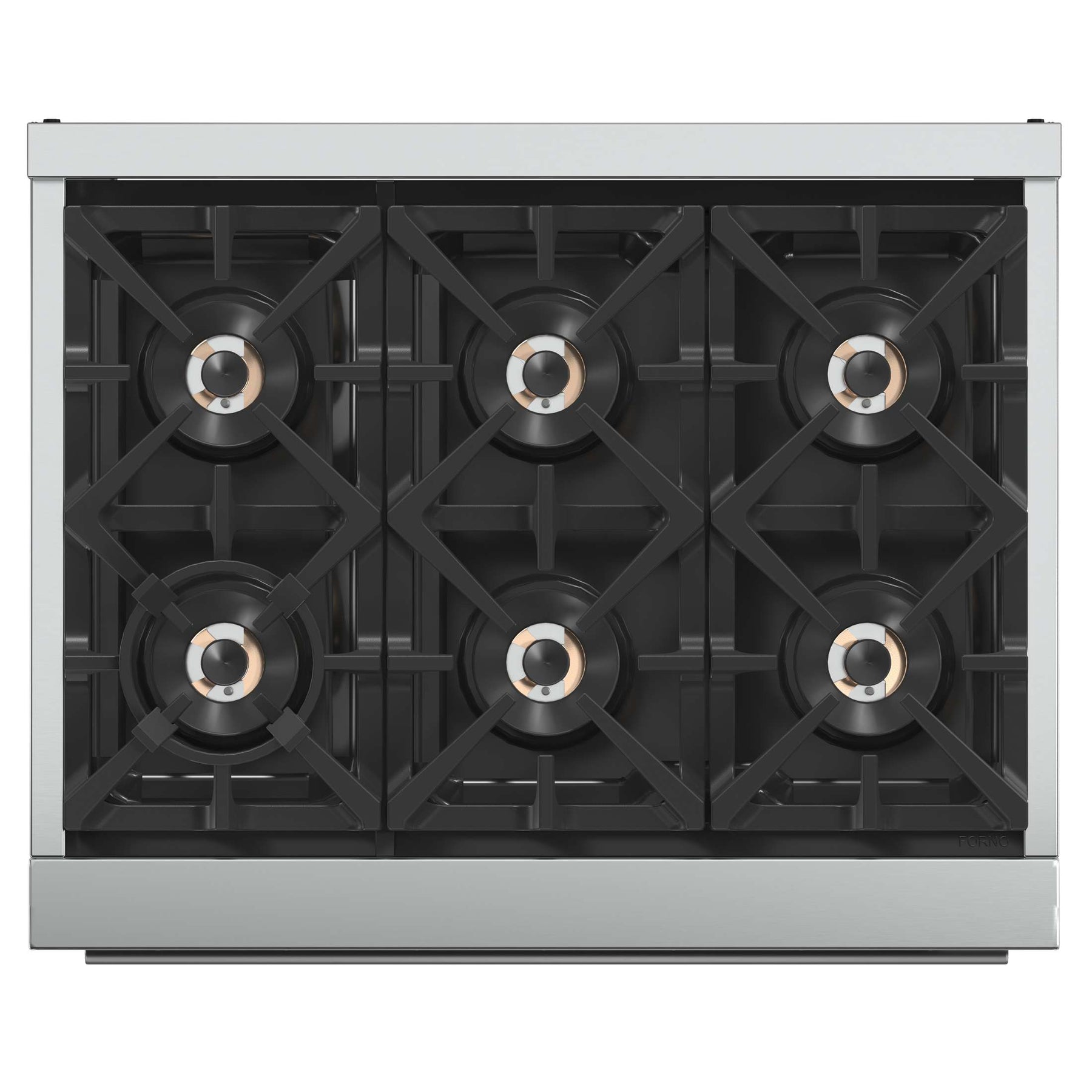 The Forno Capriasca 36 Inch Gas Range enhances your home kitchen with professional styling and performance through its durable and beautiful 304-grade stainless-steel design. The cooking surface features 6 sealed dual-ring brass burners, totaling 120,000 BTU. All burners, each at 20,000 BTU, can simmer precisely at 1,000 BTU. Continuous heavy-duty cast-iron grates facilitate easy sliding of pots or pans off heat over the enamel cooktop cavity, simplifying spill cleanup. The 5.36 cu. ft. gas oven, with a 30,000 BTU output and infrared red mesh broiler, enclosed in a blue enamel interior, offers optional convection for precise, and consistent cooking on multiple levels. For convenient viewing, a 3-layer glass oven door window is included. The package includes 3 telescopic stainless-steel oven racks, wok support, and an LP conversion kit. Additionally, zinc-coated illuminated metal knobs with bezel rings ensure enduring beauty.