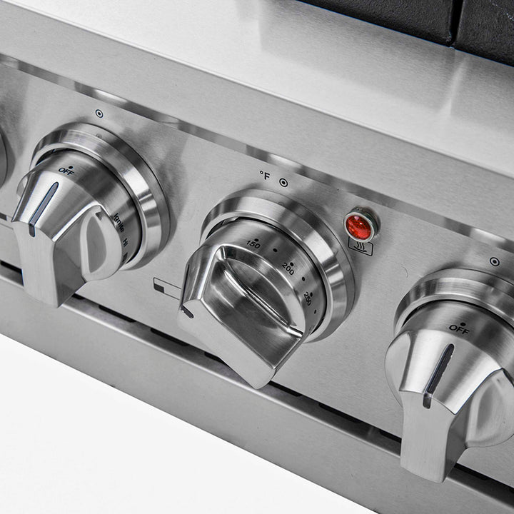 * Continuous cast iron grates ensure even heat, providing cookware stability and mobility off the source.