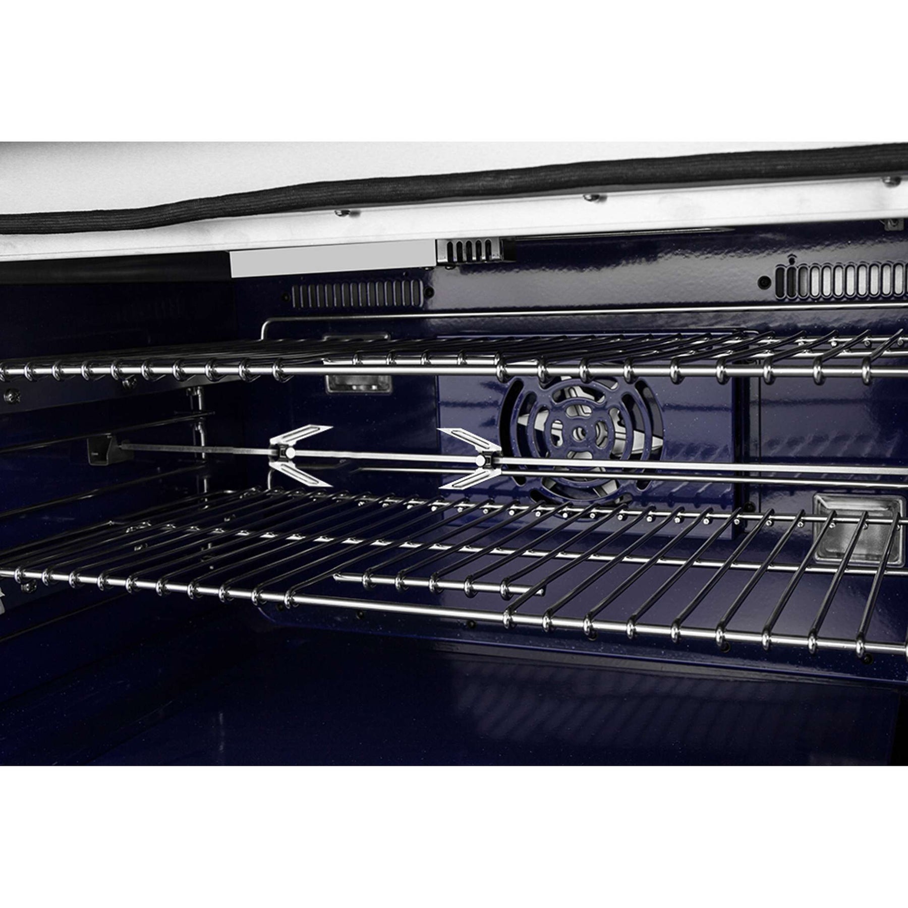 The Forno Capriasca 48 Inch dual fuel range brings professional styling and performance into your home kitchen with its durable and beautiful 304 grade stainless steel design. The cooking surface features 8 sealed dual-ring brass burners with a total output of 160,000 BTU. The 20,000 BTU dual-ring burners are perfect for boiling or searing and can also handle tasks like melting chocolate or simmering sauces. Continuous heavy-duty cast-iron grates allow for easy sliding of pots or pans off heat when desired. The two ovens have a combined capacity of 6.58 cu.ft. and boast a total output of 9,700 Watts, providing ample power for baking, roasting, and broiling. The blue enamel interiors make cleaning a breeze, while the 3-layer glass oven door window provides both heat retention and an unobstructed view. The right-side oven features a true convection fan function. Included are 6 fully telescopic easy-access stainless steel oven racks, reversible grill/griddle, complete rotisserie kit including skewer and forks, concave wok ring, an LP conversion kit and a NEMA 14-50P power cord. Additionally, zinc-coated metal knobs with bezel rings will maintain their beauty for years.