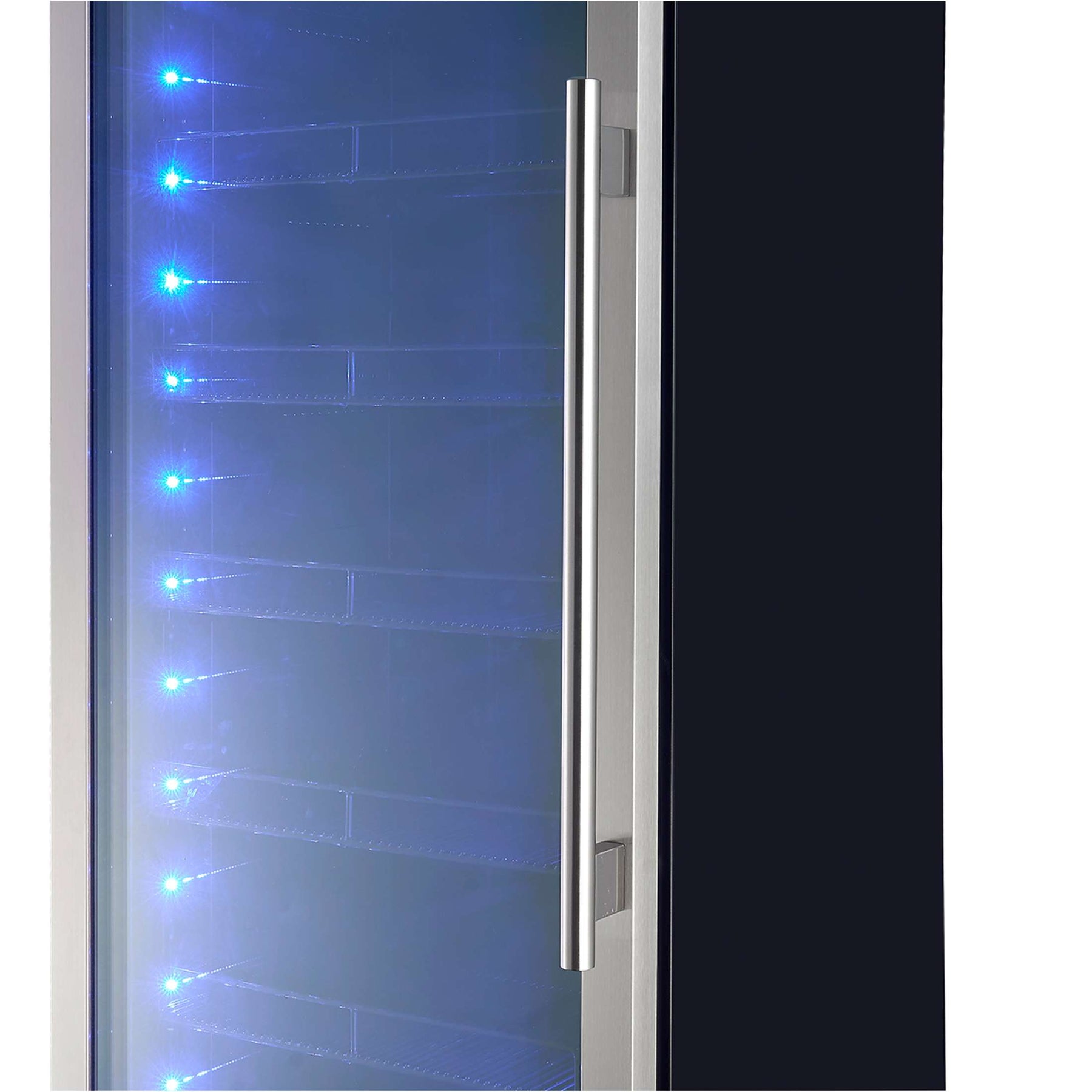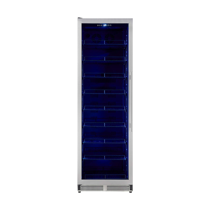 The Forno Cesinali 24" Beverage Cooler offers a spacious 15.8 cu. ft. single cooling zone, ensuring precise temperature control for optimal beverage storage. The stainless steel door frame and triple-layer glass with UV protection prevent condensation while preserving drink quality. With nine telescopic metal shelves, this cooler securely holds up to 49 cans per shelf, accommodating a total of 427 beverage cans for maximum storage. Blue vertical LED lighting on both sides enhances visibility and presentation. The touch screen control panel provides precise temperature adjustments, while a charcoal air filter neutralizes odors, keeping your beverages fresh. A high-efficiency compressor ensures reliable cooling, and the reversible door allows for flexible installation to suit any space.