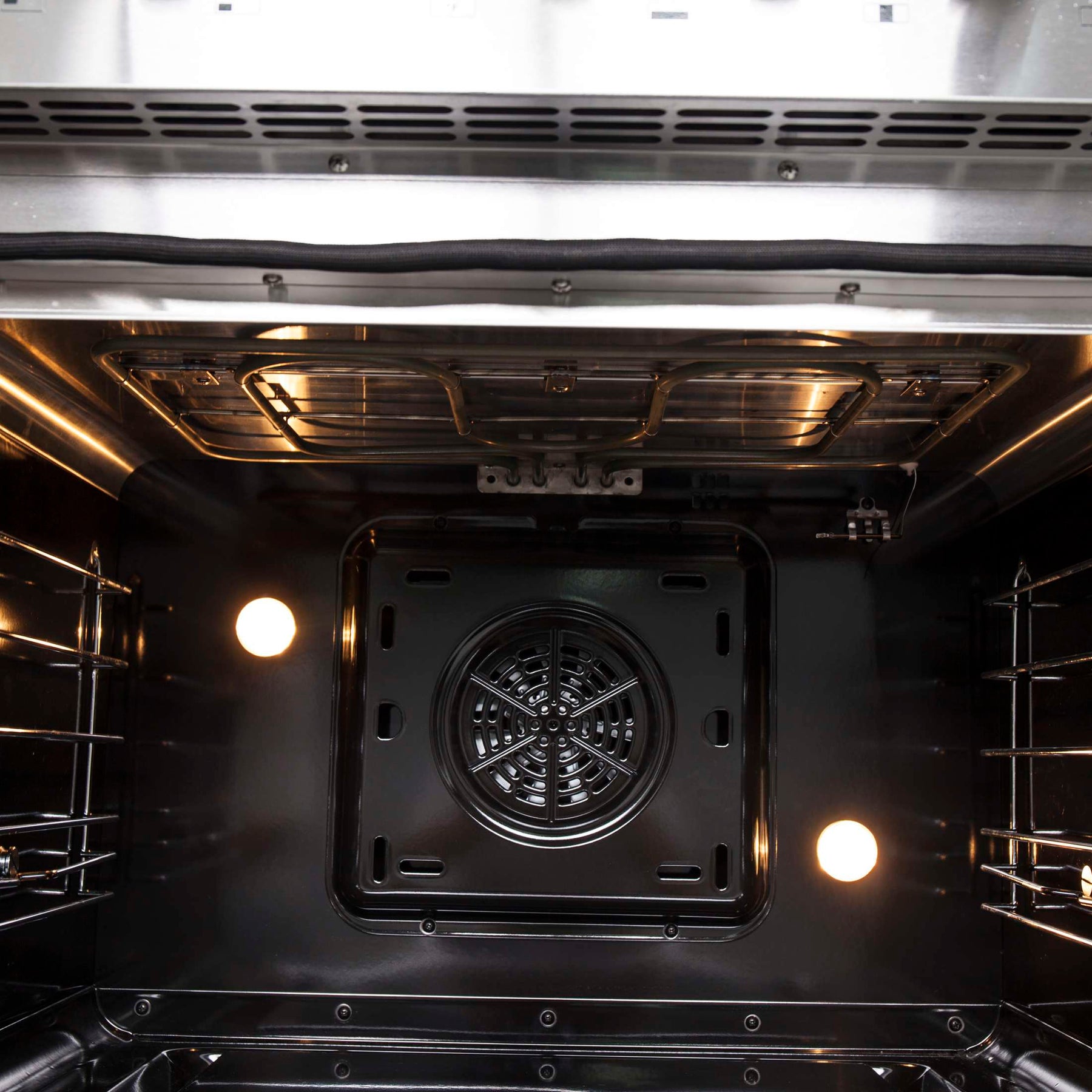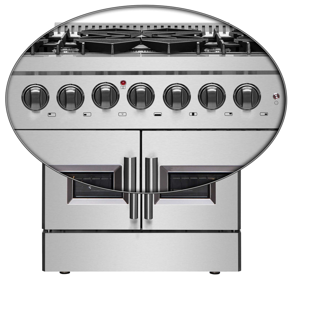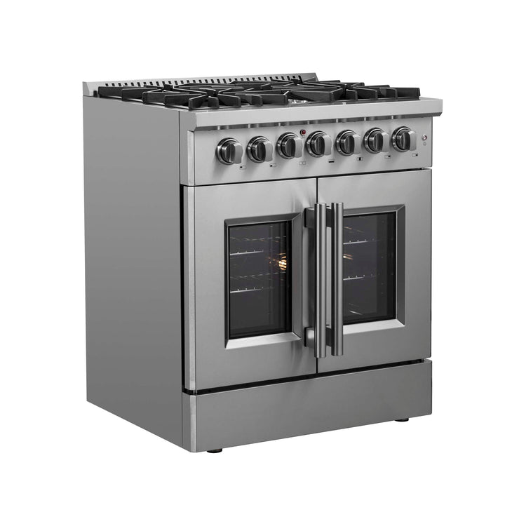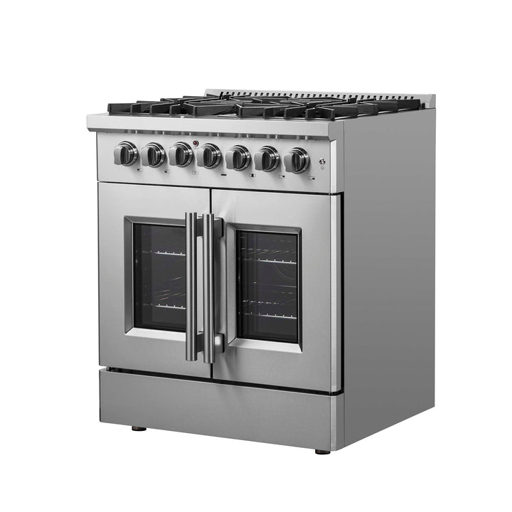 Our 30" Galiano Dual Fuel French Door Range blends timeless design and high performance. This range adds sophistication to any kitchen at an affordable price. The cooktop boasts five sealed burners with a total output of 68,000 BTU, including a 20,000 BTU dual-ring burner ideal for boiling, searing, or simmering delicate sauces. The heavy-duty cast iron grates provide a stable surface and allow you to slide cookware effortlessly across the cooktop. Its spacious 4.32 cu.ft. true convection oven delivers even heat distribution, powered by 6,300 watts, for perfectly baked and roasted dishes. Easy-to-clean black enamel interiors, French door convenience, and included electroplated racks make this range as practical as it is beautiful. Complete with an LP conversion kit and NEMA 14-50 power cord, the Galiano Range is built for both style and efficiency.
