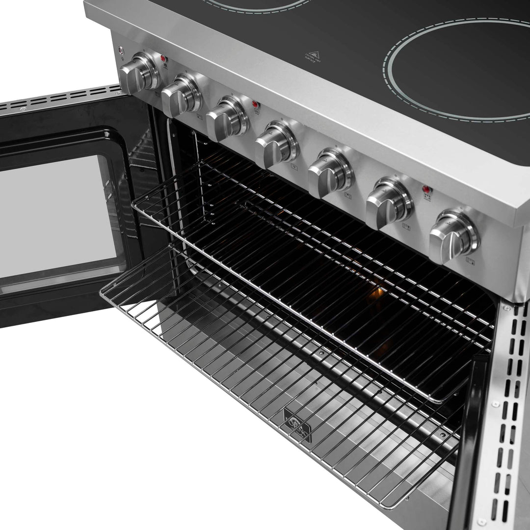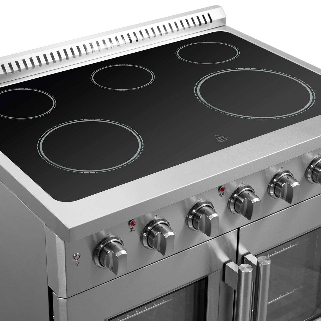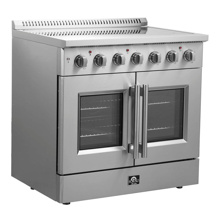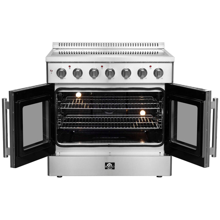 The Forno Galiano 36 Inch French Door Alta Qualita Pro-Style Freestanding Electric Range elevates your home kitchen with professional styling and enduring quality, featuring a robust stainless-steel design. The french door design will make your everyday cooking task easier allowing up to 12 Inch opening for an easy access of your oven. Boasting 5 radiant elements, the cooking surface delivers a total output of 7,700 watts. The 5.36 cu. ft. capacity oven enhances cooking flexibility with a combined broil and bake output of 4,800 watts, complemented by a 1,500 watts true convection fan for precision. This unit includes 2 chromed oven racks, an Air Fryer kit, and a 4-prong power cord (NEMA 14-50P), providing both versatility and convenience.