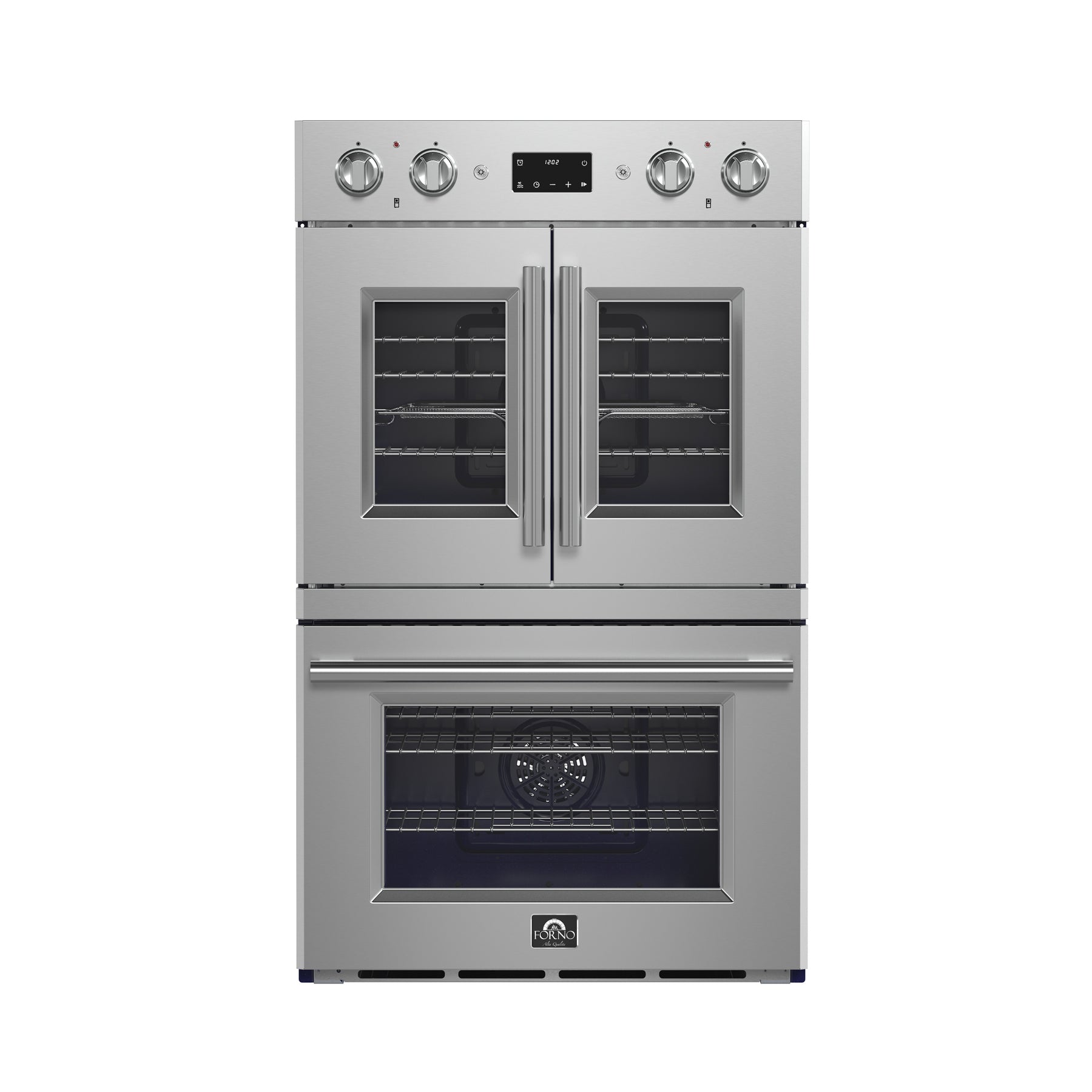 The Forno Gallico 30" Electric French-door top oven allows effortless, one-handed access, while both ovens provide a combined 7.36 cu. ft. capacity for versatile cooking. Equipped with sous vide, true convection, and multiple bake functions, it ensures precision and even heat distribution for perfect results. Stainless steel telescopic racks offer easy access, enhancing convenience and safety. Designed for efficiency, the sleek blue-speckled interior adds a stylish touch, while advanced features optimize your cooking experience.