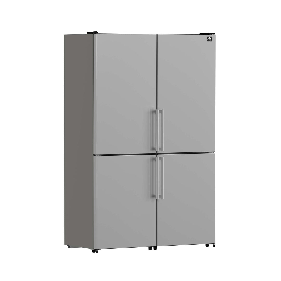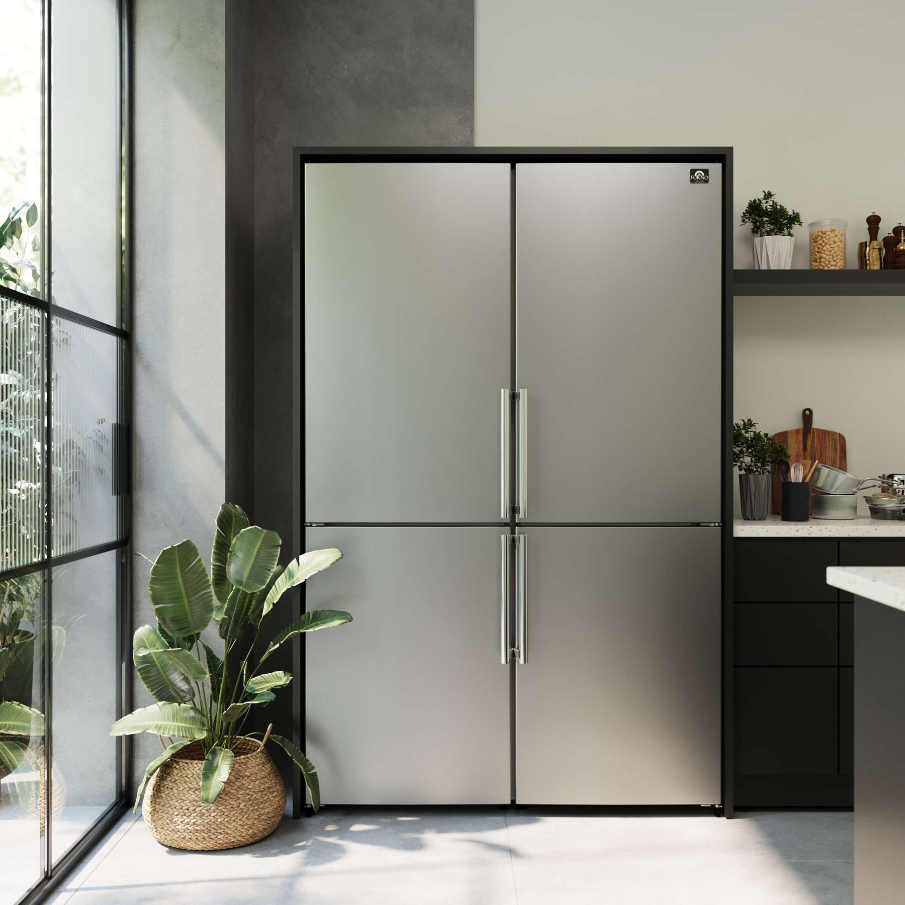 The Forno Guardia 46.8" Side-by-Side Refrigerator combines two 23.4" units to deliver an expansive 21.6 cu. ft. of total storage—ideal for large households or busy kitchens. The fresh food section offers 14.8 cu. ft. of space with six adjustable glass shelves, two deli drawers, and two humidity-controlled crispers to preserve produce and deli items. The 6.8 cu. ft. freezer features six removable drawer baskets for organized frozen storage. A Super Freeze function quickly locks in freshness while maximizing energy efficiency. With a sleek stainless steel finish, high-efficiency LED lighting, and Energy Star Certification, this refrigerator provides premium performance with reduced energy costs.