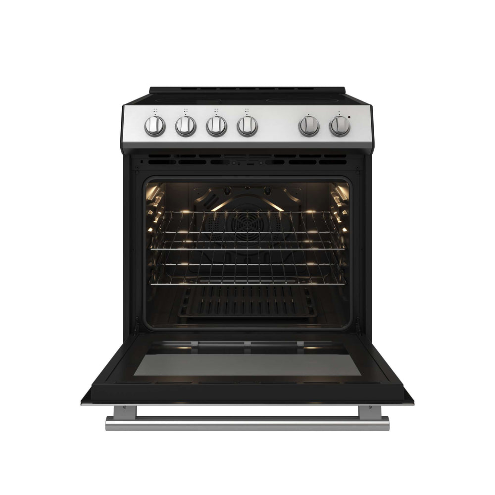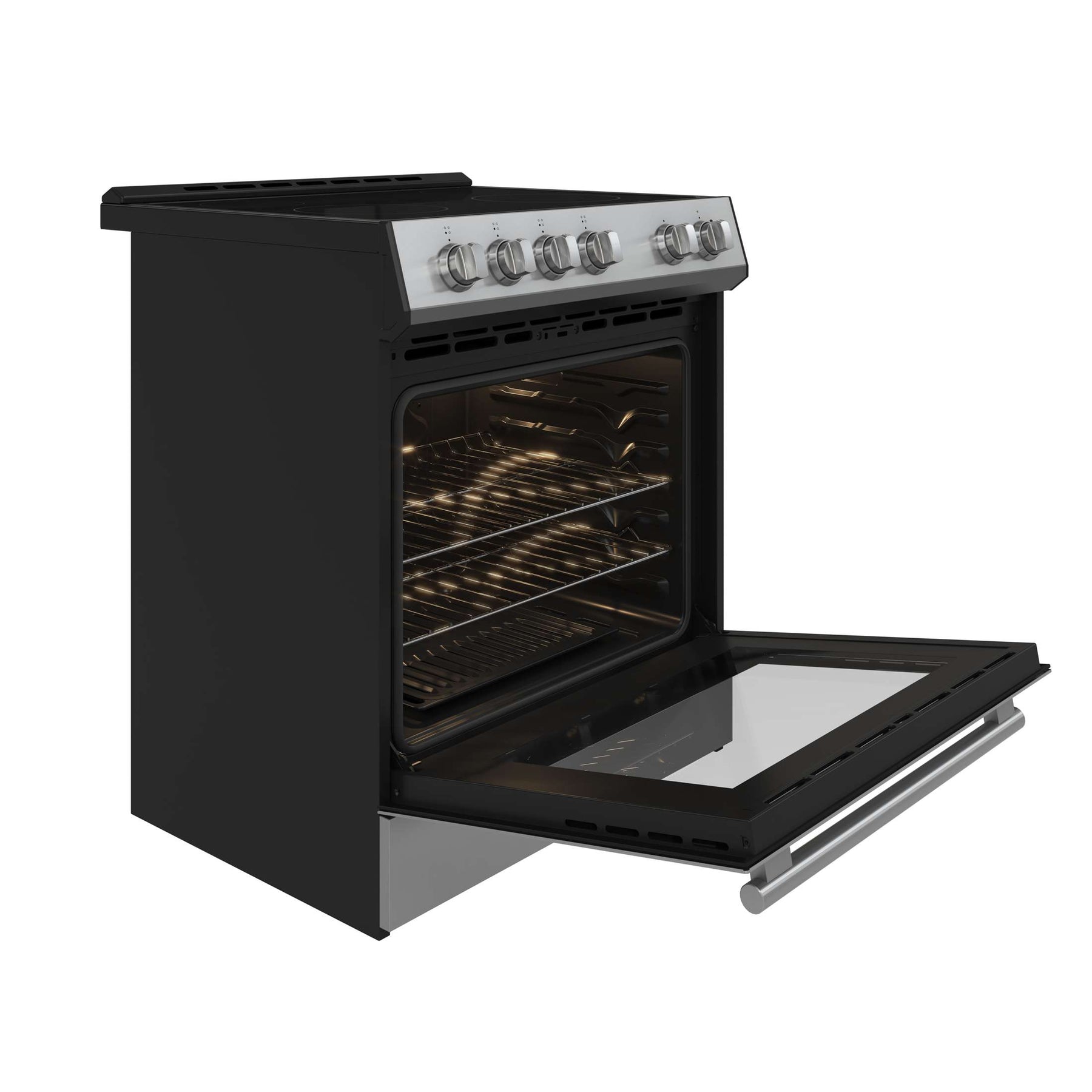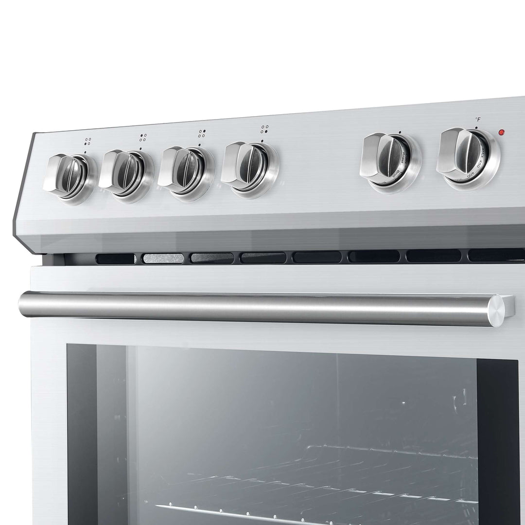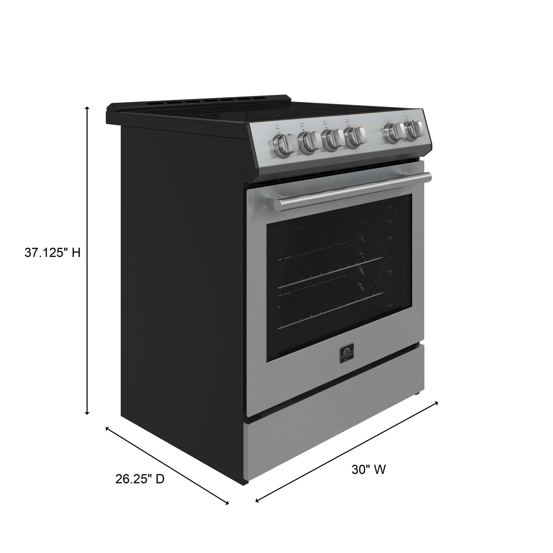 Introducing the Forno Leonardo Espresso 30 Inch 5.0 cu. Ft. Stainless-Steel Electric Range, a true kitchen game-changer. This stunning range combines style and top-notch performance with its stainless steel trim around the ceramic glass, ensuring even heat distribution across its 4 radiant elements. The powerful 5,500-watt convection oven elevates your cooking experience, providing faster and more even cooking results. The hidden bake element simplifies maintenance by preventing spills and odors, making cleanup effortless. Elevate your kitchen with this timeless, user-friendly range that marries durability with sophistication. Cook with confidence and embrace efficiency and style with every use.