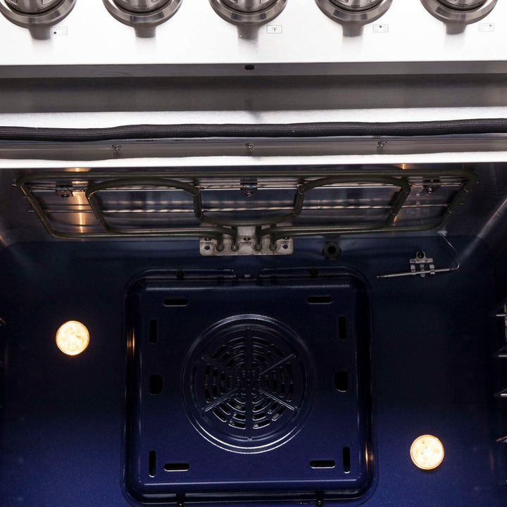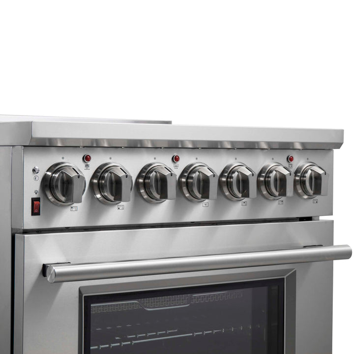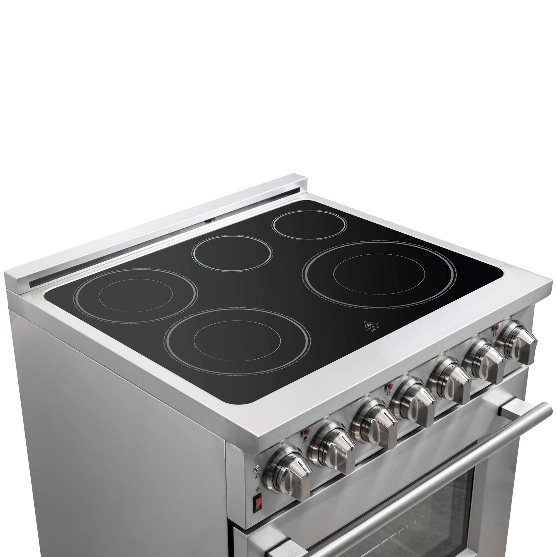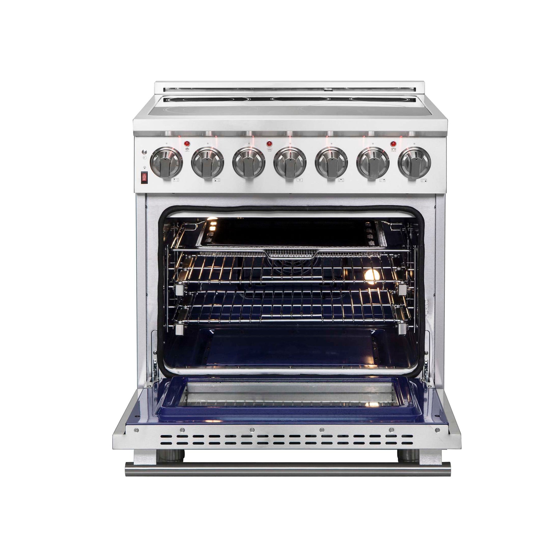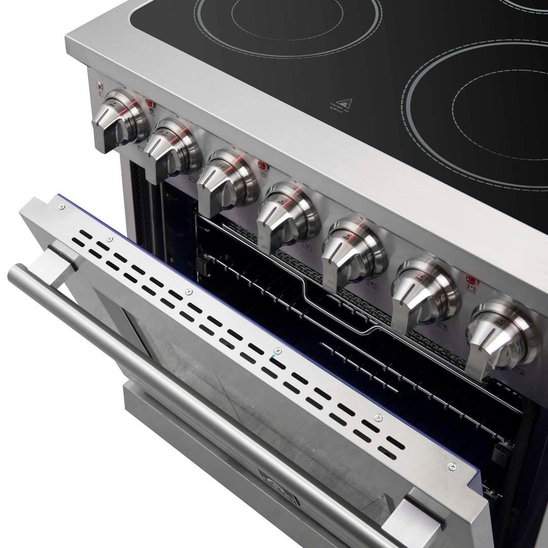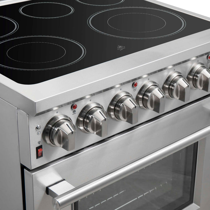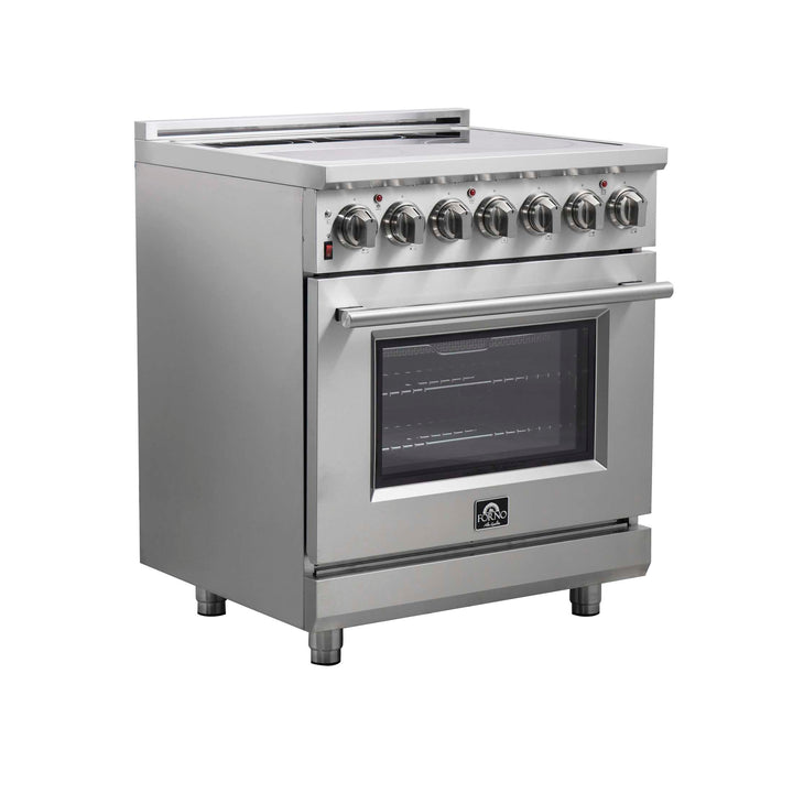 The Forno Massimo 30 Inch Freestanding Electric Range combines professional style and quality in a durable stainless-steel design. The black ceramic glass cooktop features 5 radiant elements with a total 9,500 watts output, including a 100-watt Warmer Zone. The stainless steel surface ensures lasting durability. The 4.32 cu. ft. oven has a combined 4,800 watts broil and bake output, and a 1,500 watt true convection fan. Includes Air Fryer Basket, Drip Pan, 2 telescopic oven racks, and a 4-prong power cord. Housed in high-grade stainless steel with zinc-coated metal knobs for lasting elegance. Enjoy style and durability at an affordable cost with Forno.