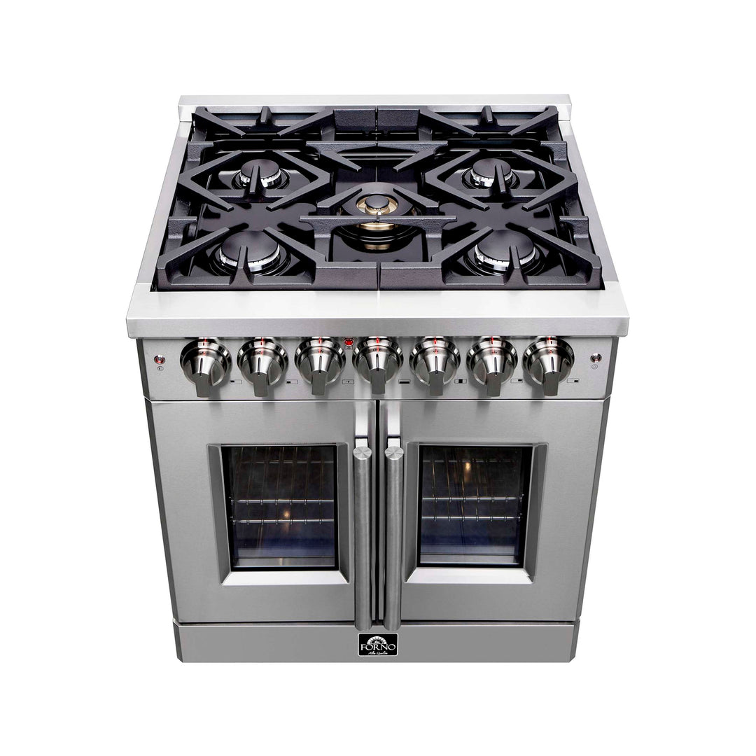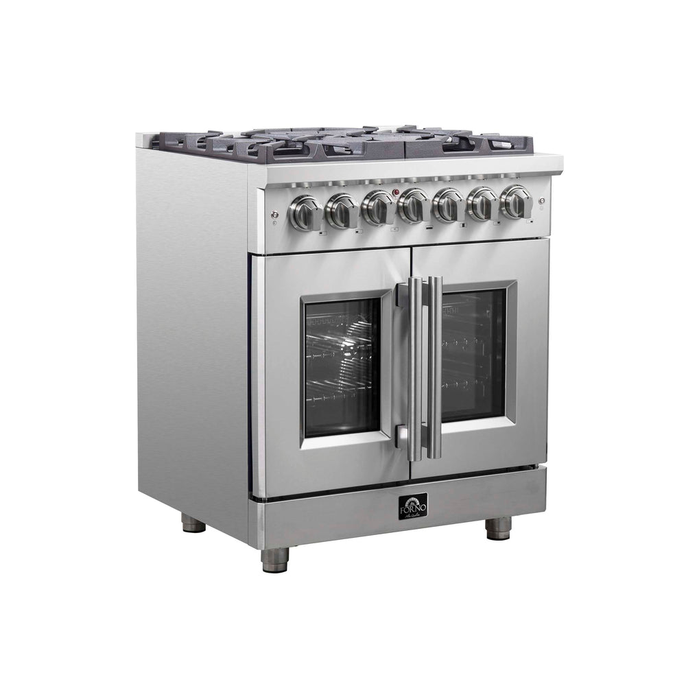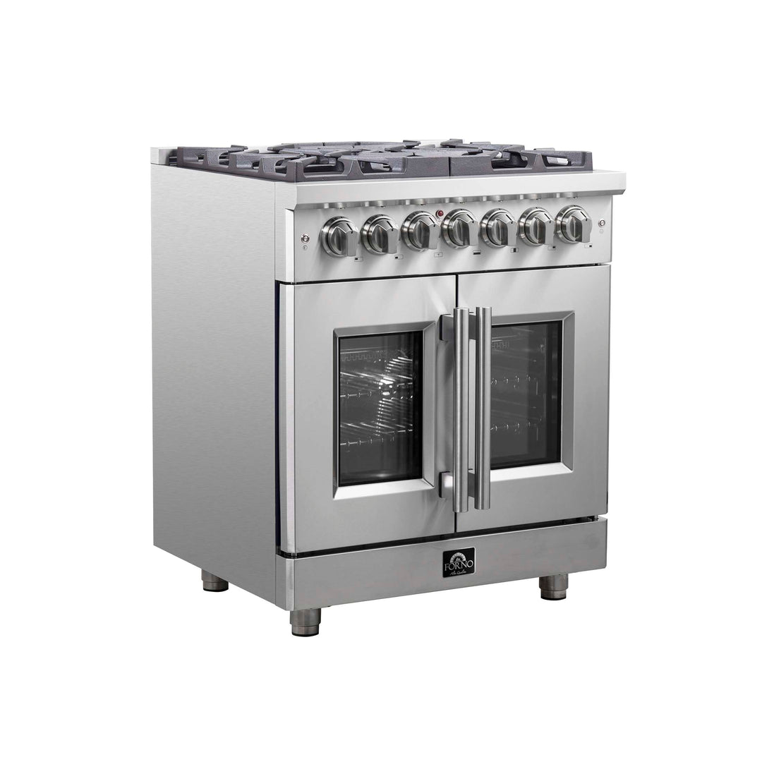 The Forno Massimo 30 Inch french door dual fuel range brings professional styling and Performance into your home kitchen with its durable stainless-steel design. Unique French doors offer generous clearance of up to 12 Inch or more, ensuring effortless access to your oven. The range top has 5 sealed burners, totaling 68,000 BTU, of which one is a 20,000 BTU dual-ring brass burner that can simmer at 1,000 BTU. The heavy-duty continuous cast iron grates allow maximum stability of cookware and mobility over a recessed enamel cooking surface, which keeps spills and splashes contained and easy to clean. The 4.32 cu.ft. true convection fan oven boasts a blue enamel interior, making cleaning a breeze. The 3-layer glass oven door window retains heat and provides a clear view. With a powerful 6,300 Watts output, this oven excels in baking, roasting, and broiling. Included are 2 telescopic oven racks, wok support, griddle, air-fryer kit with drip pan, a NEMA 14-50P power cord and an LP conversion kit. Housed in a high-grade stainless steel body with illuminated zinc knobs, the Massimo offers a stylish, long-lasting addition to your kitchen