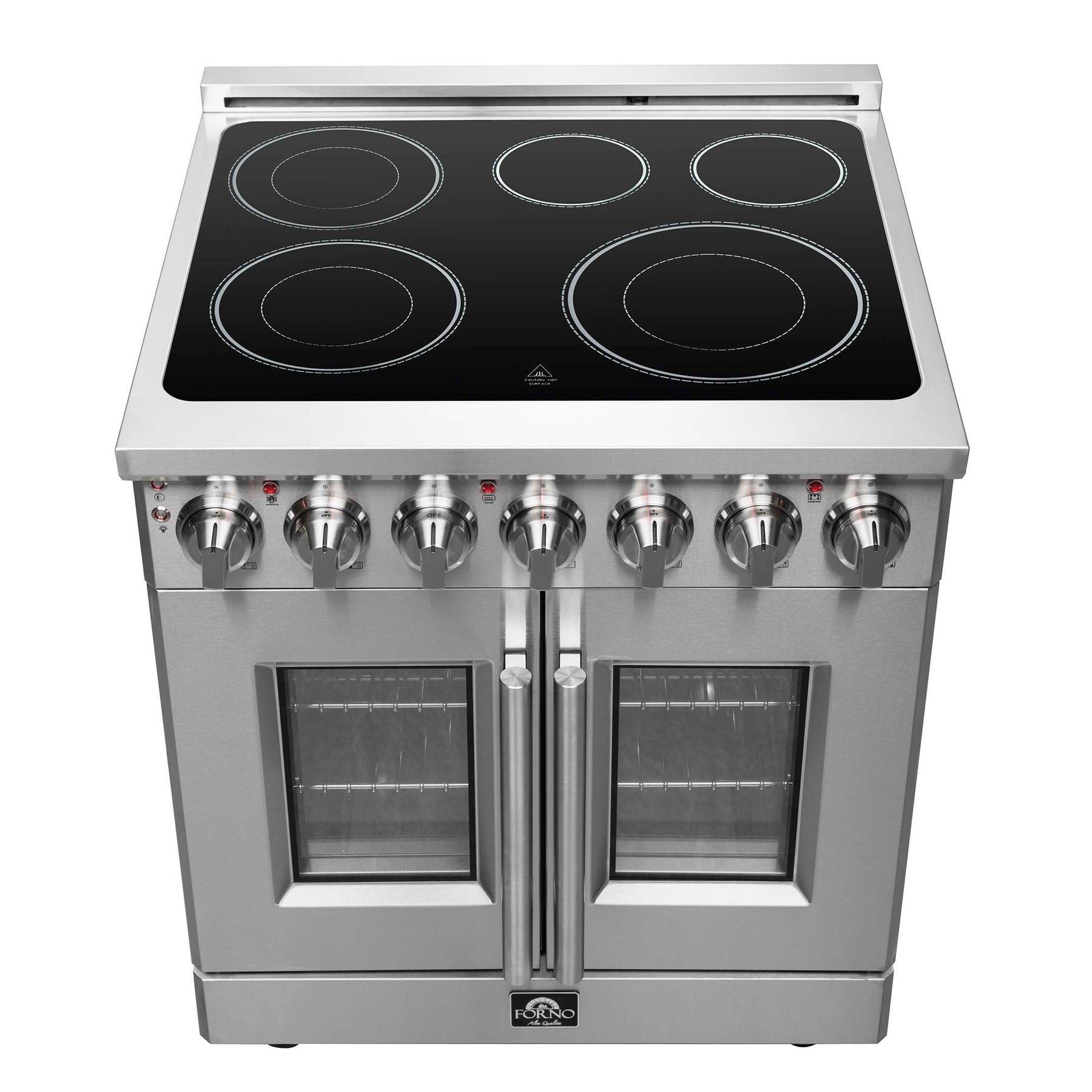 The Forno 30? Massimo French Door Freestanding Electric Range brings professional styling and quality into your home kitchen with its durable stainless-steel design. The unique french doors allow up to 12 Inch opening to easily access your oven.The cooking surface has 5 radiant elements with a total output of 9,500 watts that features a Warmer Zone of 100 watts that will always keep your dishes at the ideal temperature. The cooktop surface benefits from a stainless steel surrounding to ensure long-lasting durability. The 4.32 cu. ft. capacity oven has a combined broil and bake output of 4800 watts and 1500 watt true convection fan. Includes Air Fryer Basket, Rack and Drip Pan, 2 telescopic oven racks and 4-prong power cord. Housed in a high-grade stainless steel body and zinc coated metal knobs with bezels. This unit sports a stylish look that is built to last. Skip the high price tags without sacrificing quality and performance. Lower the cost of living with Forno.