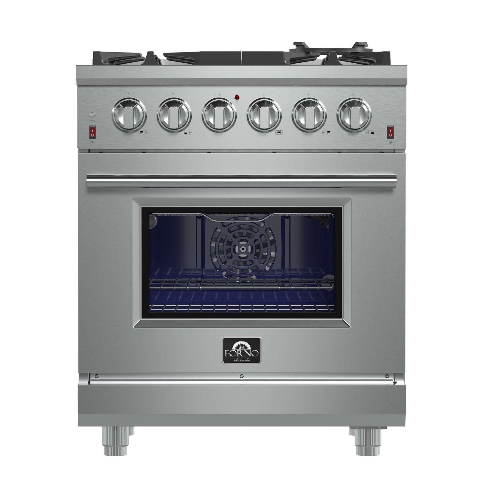 The Forno Massimo 30 Inch Gas Range harmonizes professional style and 304-grade stainless steel durability. Its 5 sealed burners, totaling 68,000 BTU, include a precision 20,000 BTU dual-ring burner that can simmer at 1,000 BTU. Continuous cast iron grates ensure stability on the enamel surface. The 4.32 cu.ft. convection oven, with a blue enamel interior and 3-layer glass window, reaches 30,000 BTU for versatile cooking. It features 2 telescopic racks, an air fryer kit, a wok support, a reversible griddle, an LP conversion kit, and durable zinc-coated metal knobs. Elevate your kitchen with performance, convenience, and enduring elegance.