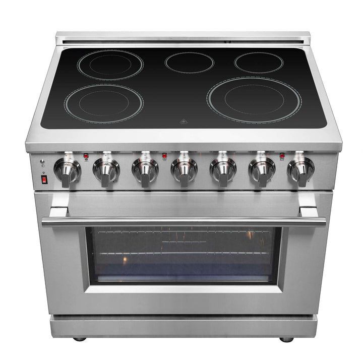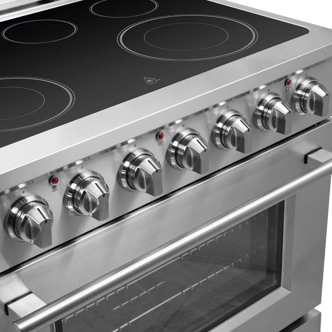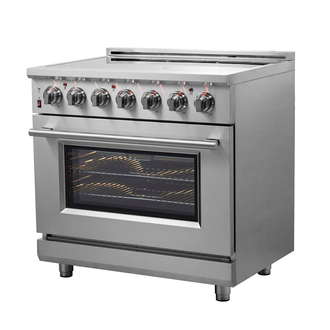 The Forno Massimo 36 Inch Freestanding Electric Range brings professional styling and quality into your home kitchen with its durable stainless-steel design. The cooking surface has 5-radiant elements with a total output of 9,500-watts that features a Warmer Zone of 100-Watt that will always keep your dishes at the ideal temperature. The cooktop surface benefits from a stainless steel surrounding to ensure long-lasting durability. The 5.36 cu. ft. capacity oven has a combined broil and bake output of 4800-Watt and 1500-Watt true convection fan. Includes Air Fryer Basket, Rack and Drip Pan, 2-telescopic oven racks and 4-prong power cord. Housed in a high-grade stainless steel body and zinc coated metal knobs with bezels. This unit sports a stylish look that is built to last.