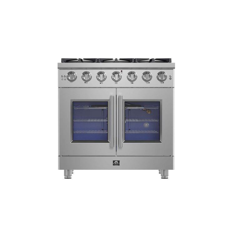 The Forno Massimo 36 Inch French Door Gas Range brings professional styling and performance into your home kitchen with its durable stainless-steel design. Unique french doors mean open doors allow up to 12 Inch or more space to access your oven. The range top has 6 sealed burners totaling 83,000 BTU, of which one is a 20,000 BTU dual-ring brass burner that can simmer at 1,000 BTU. The continuous cast iron grates ensure stability and mobility over the enamel surface that will contain any spills. The 5.36 cu. ft. convection oven with a total output of 30,000 BTU is encased in a speckled blue enamel interior fitted with a convection fan, ensures to achieve fast and precise oven cooking along for easy viewing is a 3-layer glass oven door window. Included is an LP conversion kit, 2 telescopic oven racks, wok support, reversible griddle, air fry basket kit and drip pan. Additionally, zinc coated illuminated metal knobs with bezel rings will maintain their beauty for years.