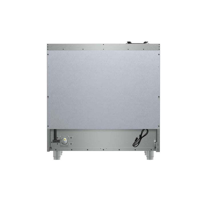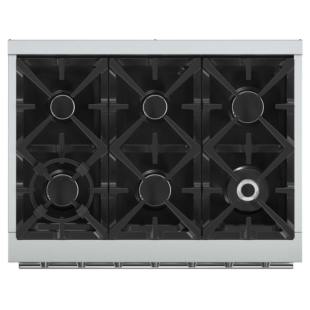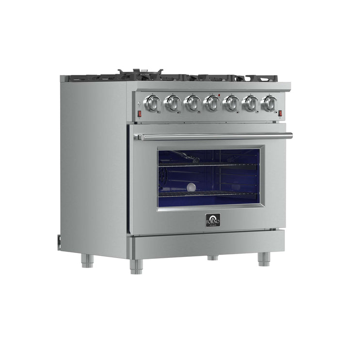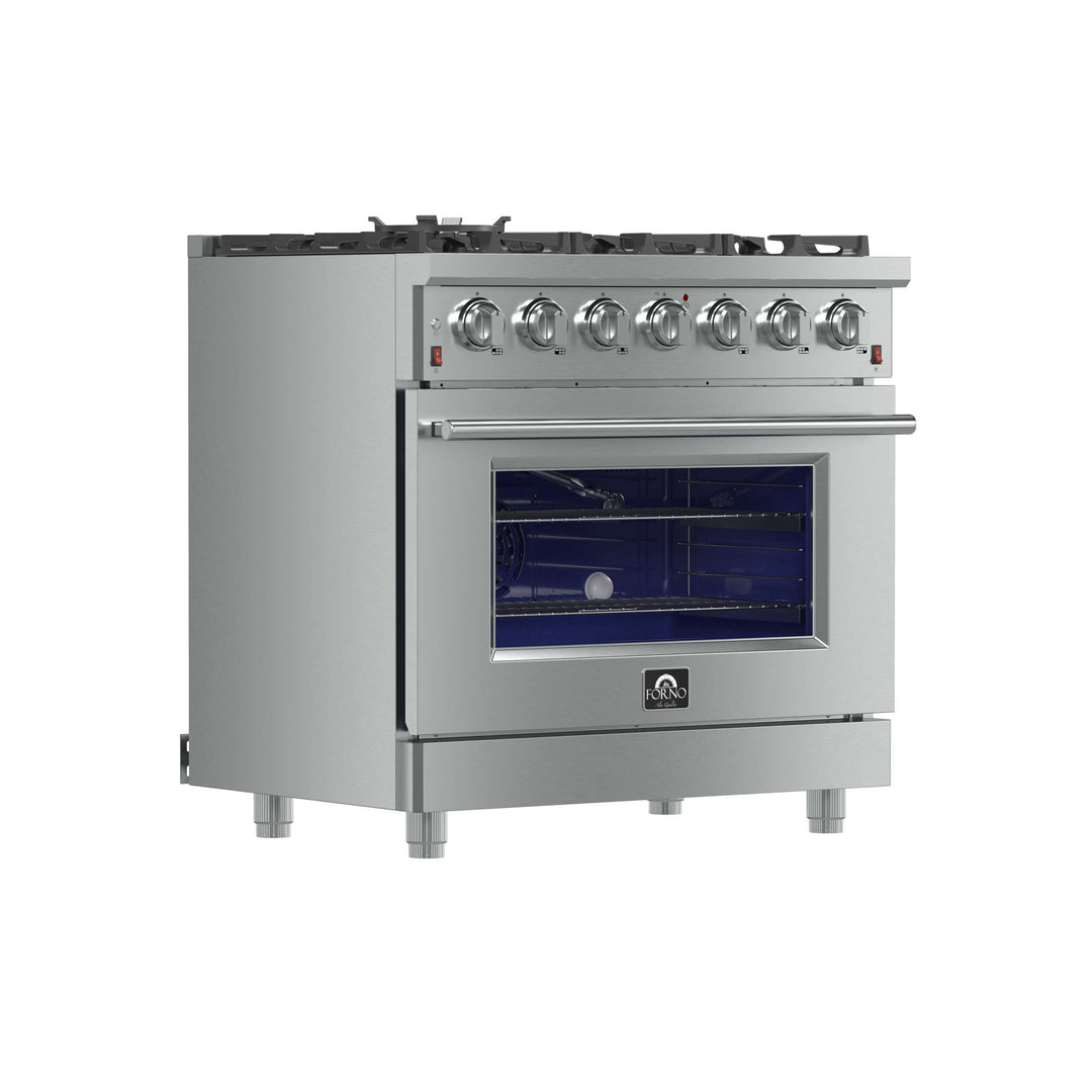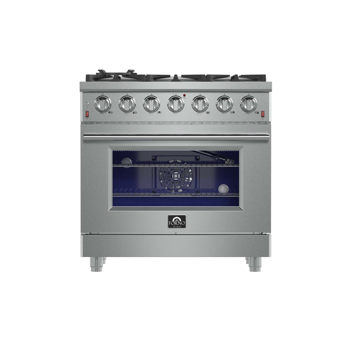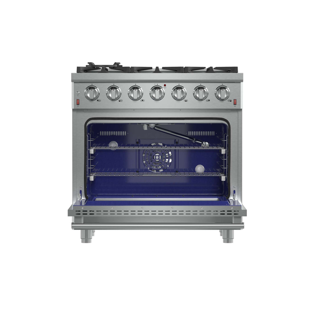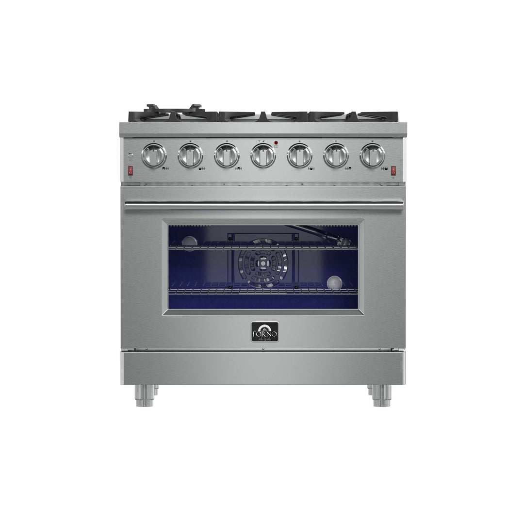 The Forno Massimo 36 Inch Gas Range harmonizes professional style and 304-grade stainless steel durability. Its 6 sealed burners, totaling 83,000 BTU, include a precision 20,000 BTU dual-ring burner that can simmer at 1,000 BTU. Continuous cast iron grates ensure stability on the enamel surface. The 5.36 cu.ft. convection oven, with a blue enamel interior and 3-layer glass window, reaches 30,000 BTU for versatile cooking. It features 2 telescopic racks, an air fryer kit, a wok support, a reversible griddle, an LP conversion kit, and durable zinc-coated metal knobs. Elevate your kitchen with performance, convenience, and enduring elegance.