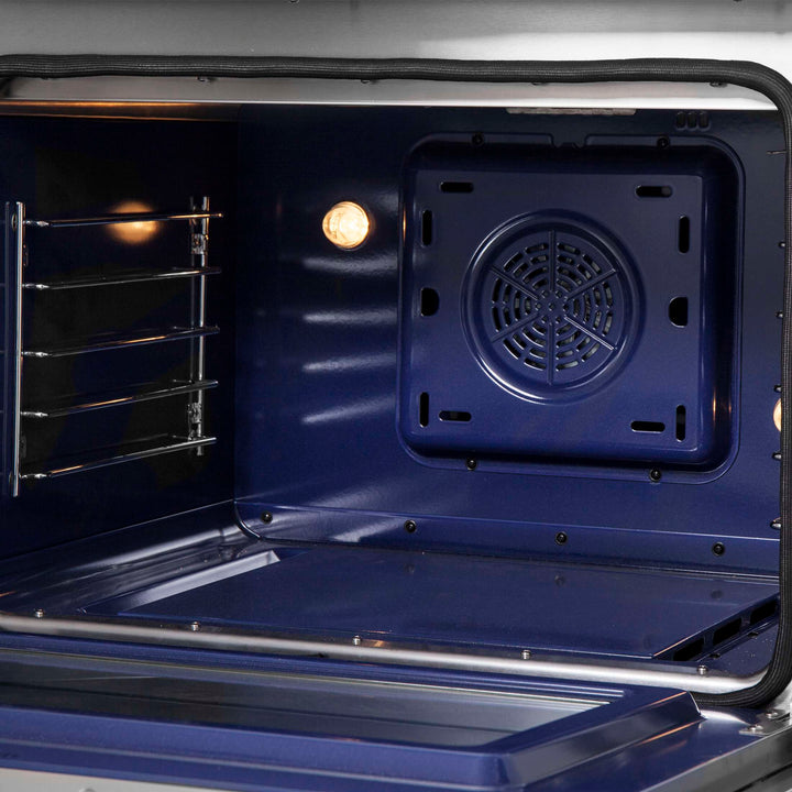 * 4.32 cu.ft. speckled blue oven with True Convection and a total broil and bake output of 6,300 Watts