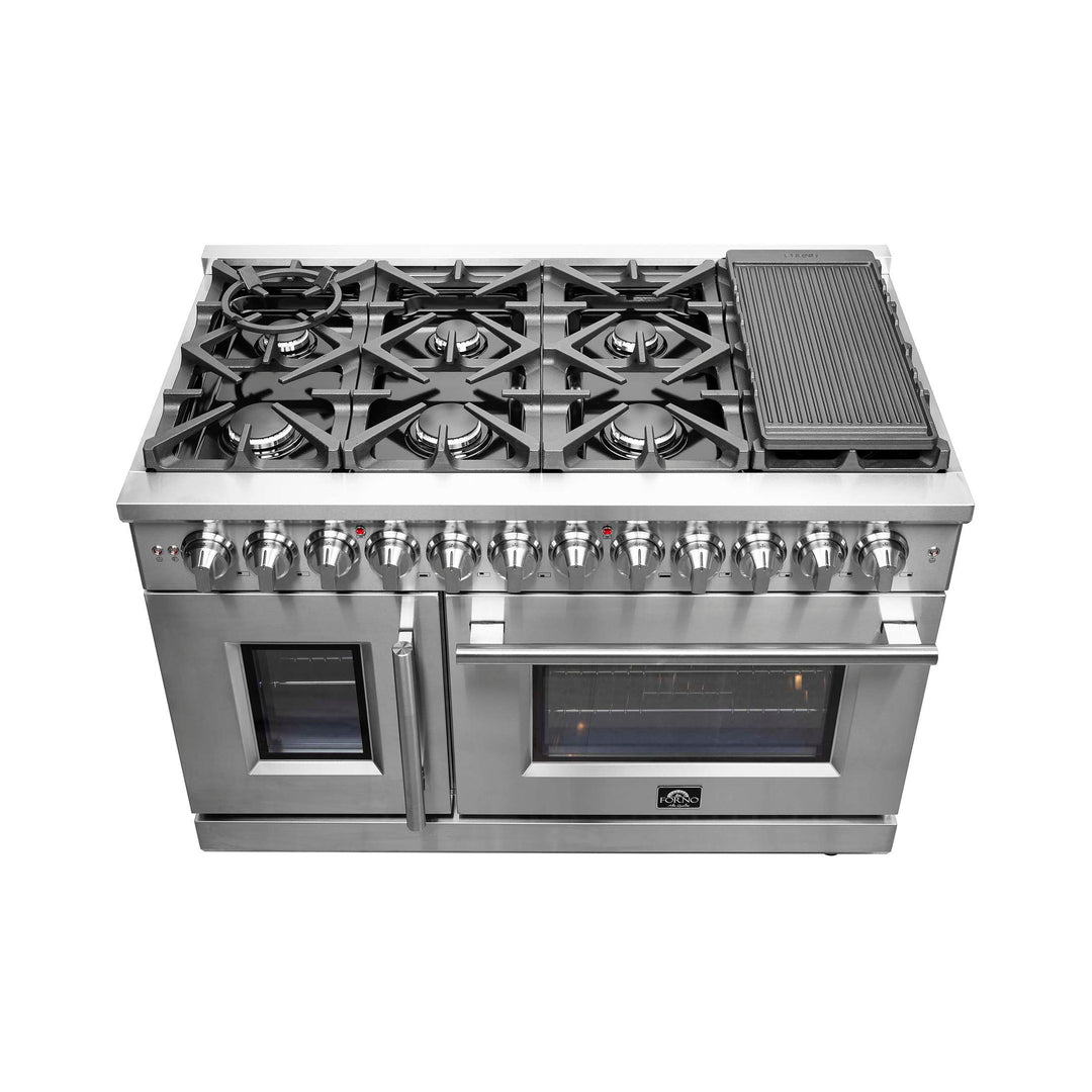 Introducing the Massimo 48 Inch French Door Dual Fuel Range, expertly combining professional style and durability in your home kitchen with its robust stainless-steel construction. The rangetop boasts eight sealed burners, delivering a total of 107,000 BTU, including a 20,000 BTU dual-ring brass burner that achieves a precise 1,000 BTU simmer. Continuous cast iron grates offer stability and contain spills on the enamel cooktop for easy cleaning. The ovens provide a combined capacity of 6.58 cu.ft. and a total power output of 9,700 Watts, suitable for baking, roasting, and broiling. The interiors feature impressive blue enamel for easy maintenance, and the three-layer glass oven doors ensure heat retention and visibility. The main oven includes a true convection fan. Accessories include four telescopic oven racks, wok support, two griddles, an air-fryer kit with drip pan, a NEMA 14-50P power cord, and an LP conversion kit. The high-grade stainless steel body and illuminated zinc knobs make the Massimo a stylish, lasting addition to your kitchen.