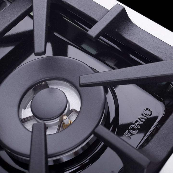 The Forno Massimo 48 Inch Gas Range harmonizes professional style and 304-grade stainless steel durability. Its 8 sealed burners, totaling 107,000 BTU, include a precision 20,000 BTU dual-ring burner that can simmer at 1,000 BTU. Continuous cast iron grates ensure stability on the enamel surface. The main oven of 4.32 Cu.Ft has a convection fan with 30,000 BTU Total Broil and Bake output. The secondary oven has a capacity of 2.26 Cu.Ft. with a 14,000 BTU Bake output. Both ovens have an impressive blue enamel interiors allowing for easy cleaning and 3-layer glass oven door window provides both heat retention and an unobstructed view. It features 2 telescopic racks per oven, an air fryer kit, a wok support, two reversible griddle, an LP conversion kit, and durable zinc-coated metal knobs. Elevate your kitchen with performance, convenience, and enduring elegance.