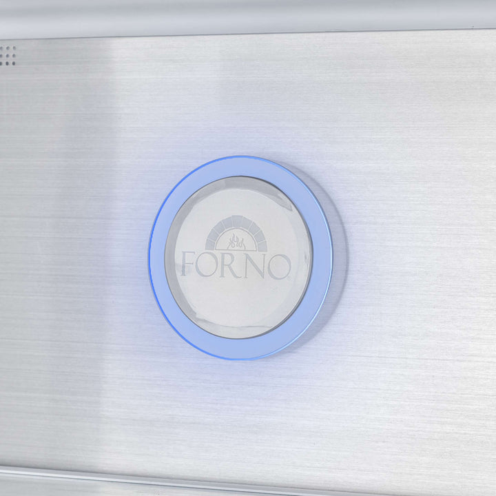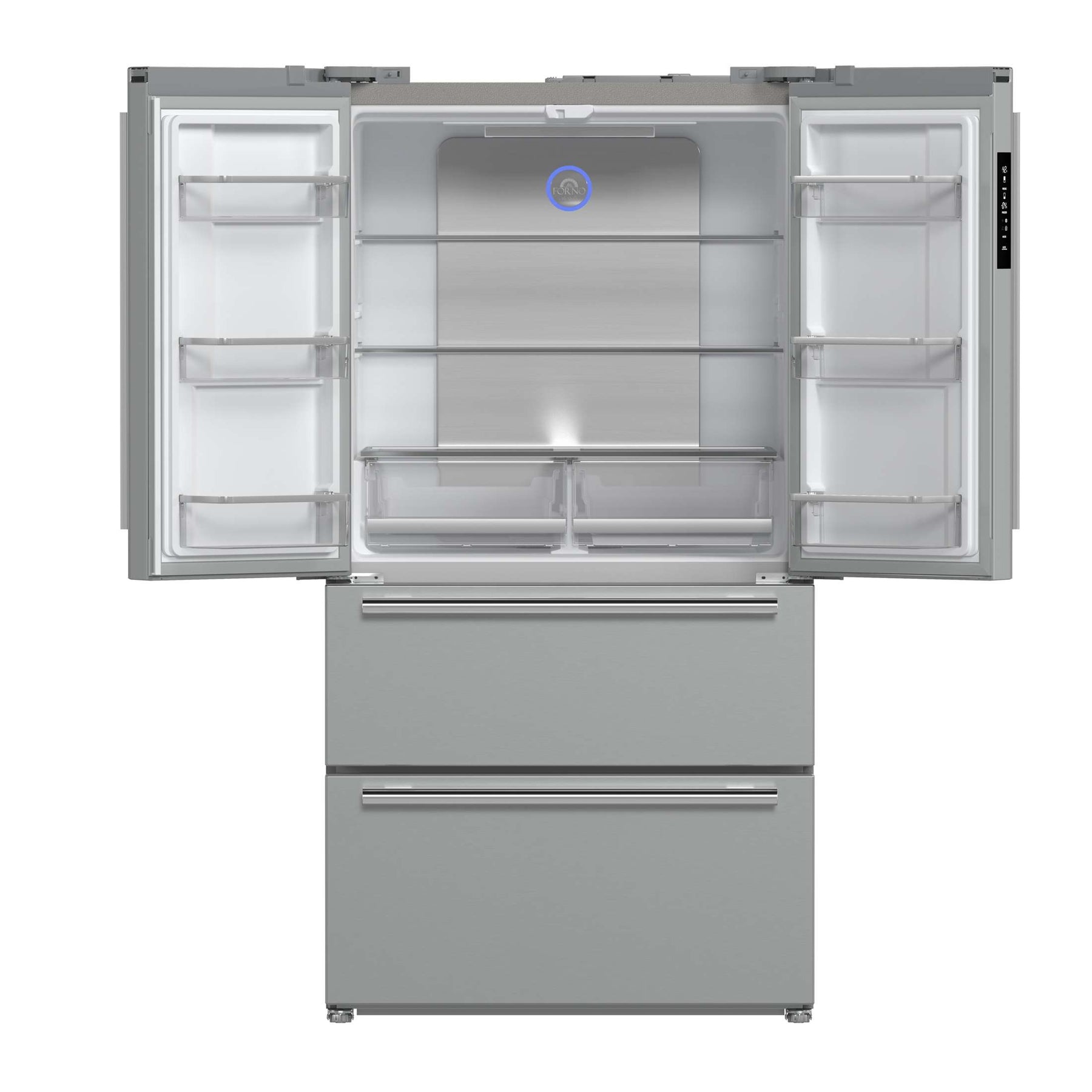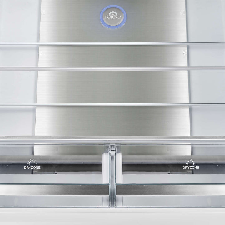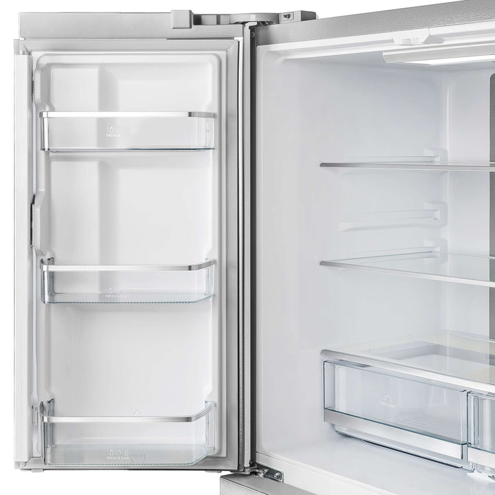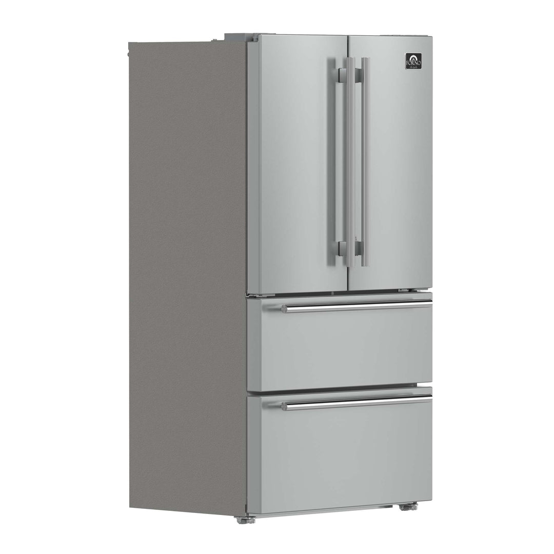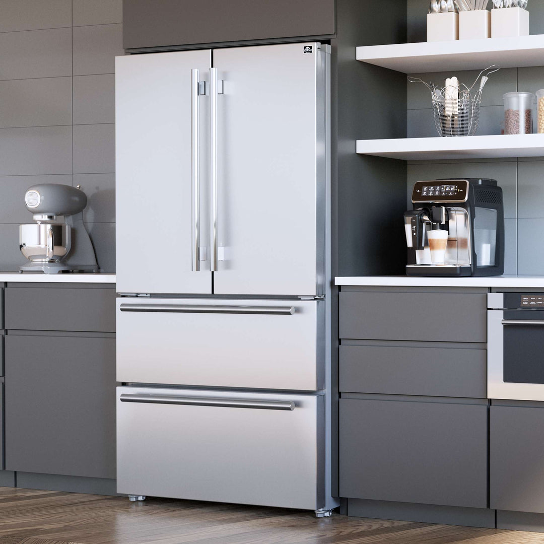 The Forno Alta Moena 36 Inch Stainless-Steel French Door refrigerator combines style and functionality with its frost-free multi-air flow cooling system, offering a spacious 19.2 cu.ft. capacity. Adjustable shelving ensures versatile grocery storage, complemented by a compressor inverter for energy efficiency, quiet operation, and precise temperature control. The LED touch panel provides convenient access and control. The fresh food storage (12.1 cu.ft.) features a premium stainless-steel back panel, three glass shelves (two adjustable), two crisper drawers, and ample door storage, all elegantly finished with sleek silver trim. The 7.14 cu.ft. freezer boasts organized storage with two pull-out drawers, a slide-out tray, and a high-capacity automatic ice maker producing up to 4 pounds of ice daily. This counter depth unit also includes a stainless-steel interior panel and silver trim shelves and door bins for a modern touch. ENERGY STAR Certified, it incorporates high-efficiency LED lighting to minimize food spoilage.