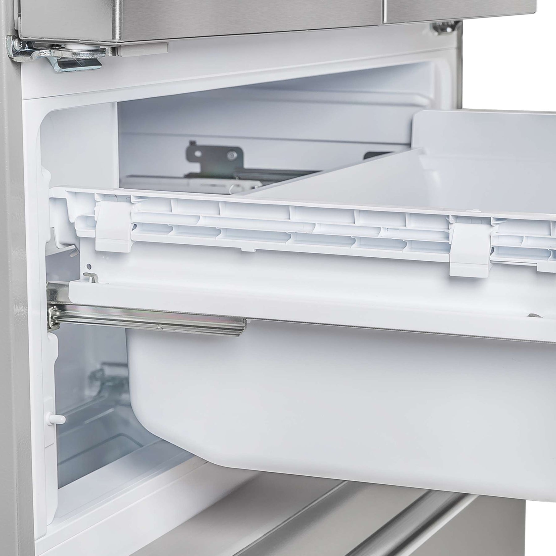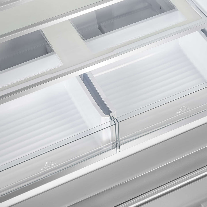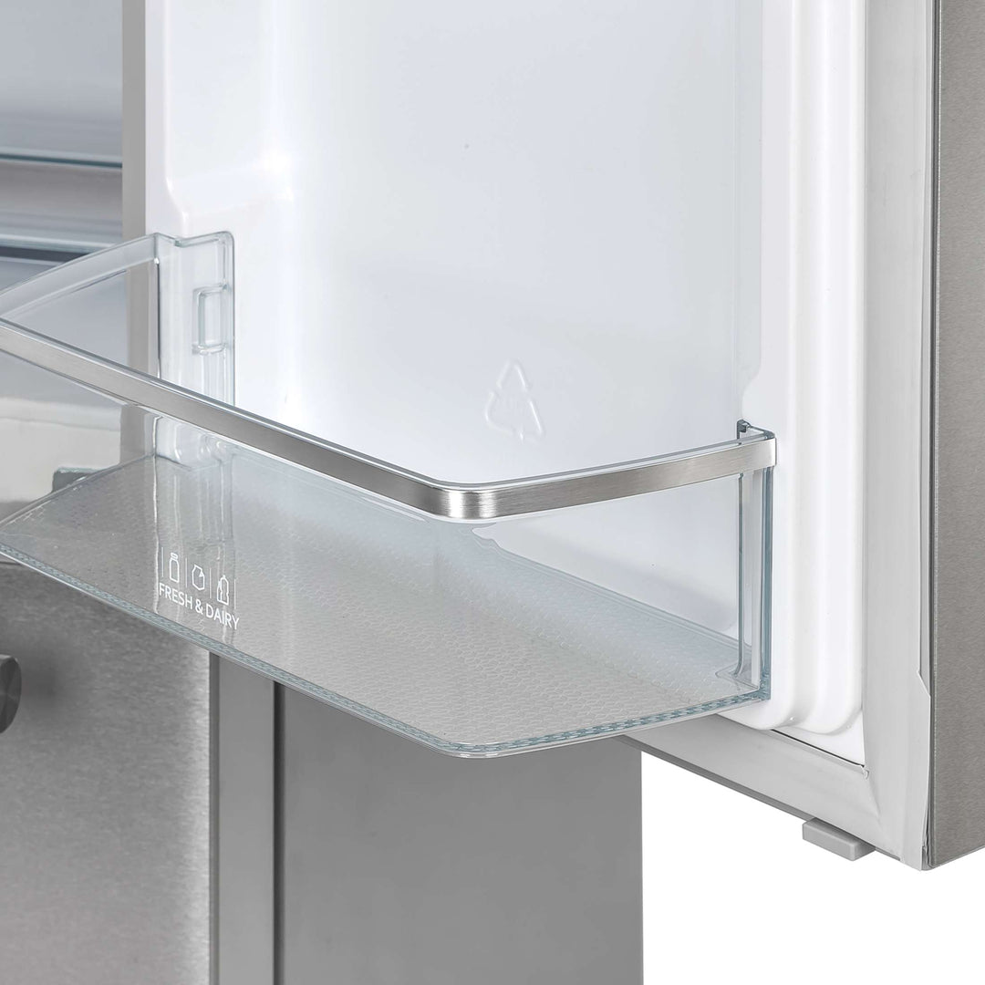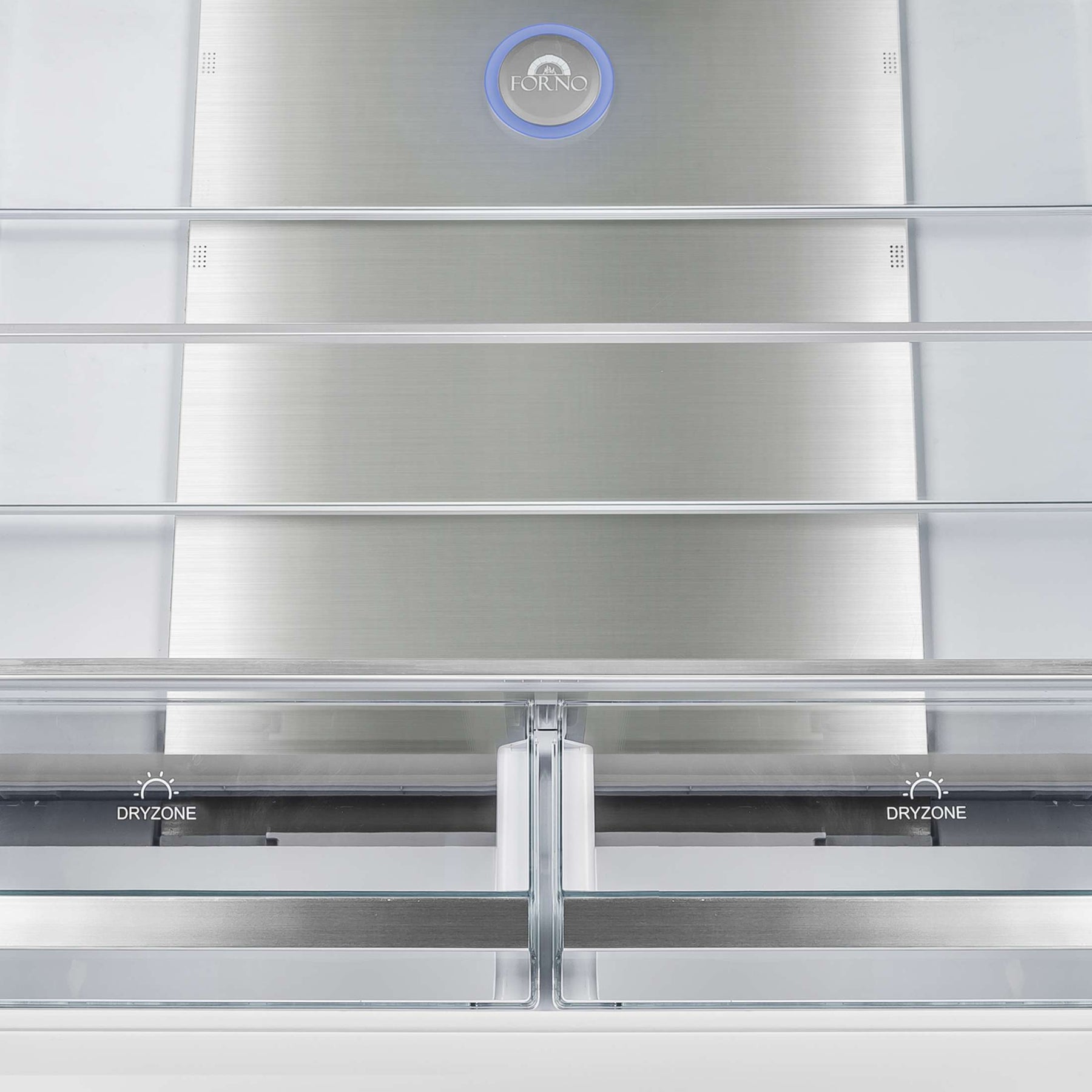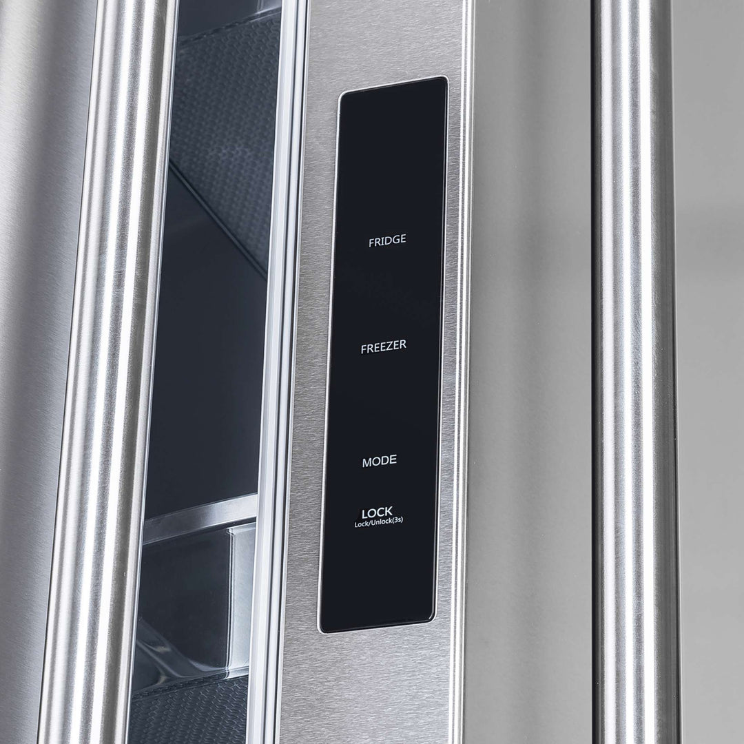 The Forno Alta Moena 36 Inch Stainless-Steel French Door refrigerator combines style and functionality with its frost-free multi-air flow cooling system, offering a spacious 19.2 cu.ft. capacity. Adjustable shelving ensures versatile grocery storage, complemented by a compressor inverter for energy efficiency, quiet operation, and precise temperature control. The LED touch panel provides convenient access and control. The fresh food storage (12.1 cu.ft.) features a premium stainless-steel back panel, three glass shelves (two adjustable), two crisper drawers, and ample door storage, all elegantly finished with sleek silver trim. The 7.14 cu.ft. freezer boasts organized storage with two pull-out drawers, a slide-out tray, and a high-capacity automatic ice maker producing up to 4 pounds of ice daily. This counter depth unit also includes a stainless-steel interior panel and silver trim shelves and door bins for a modern touch. ENERGY STAR Certified, it incorporates high-efficiency LED lighting to minimize food spoilage.