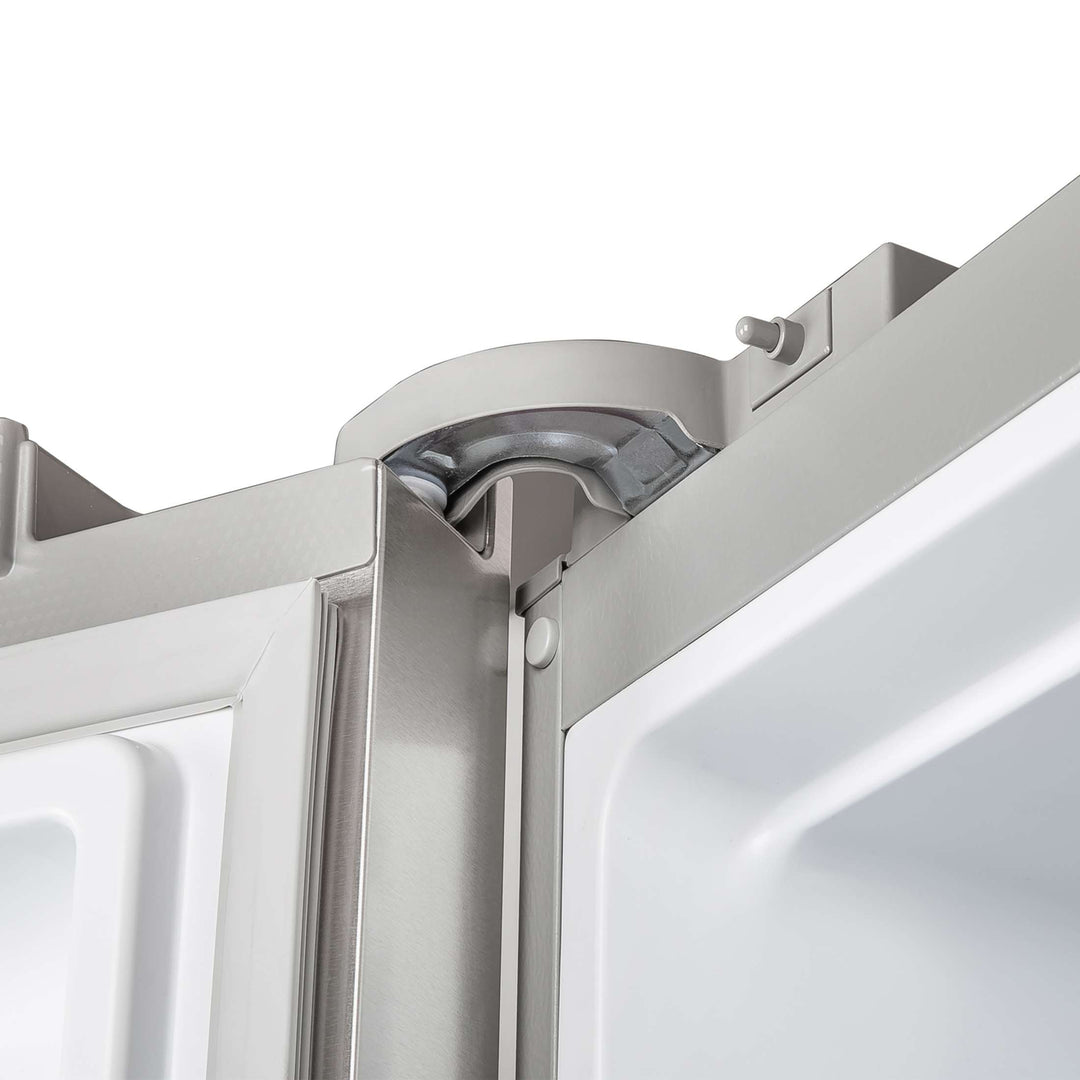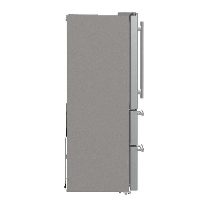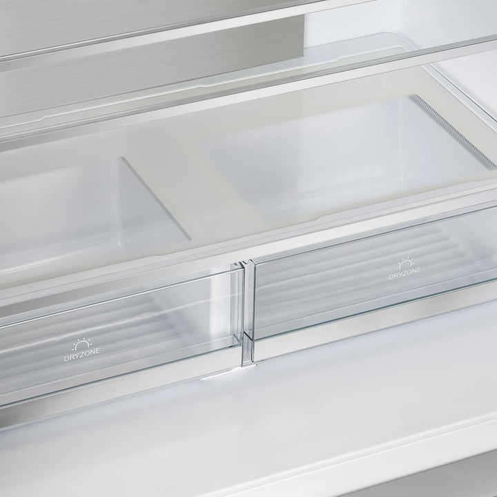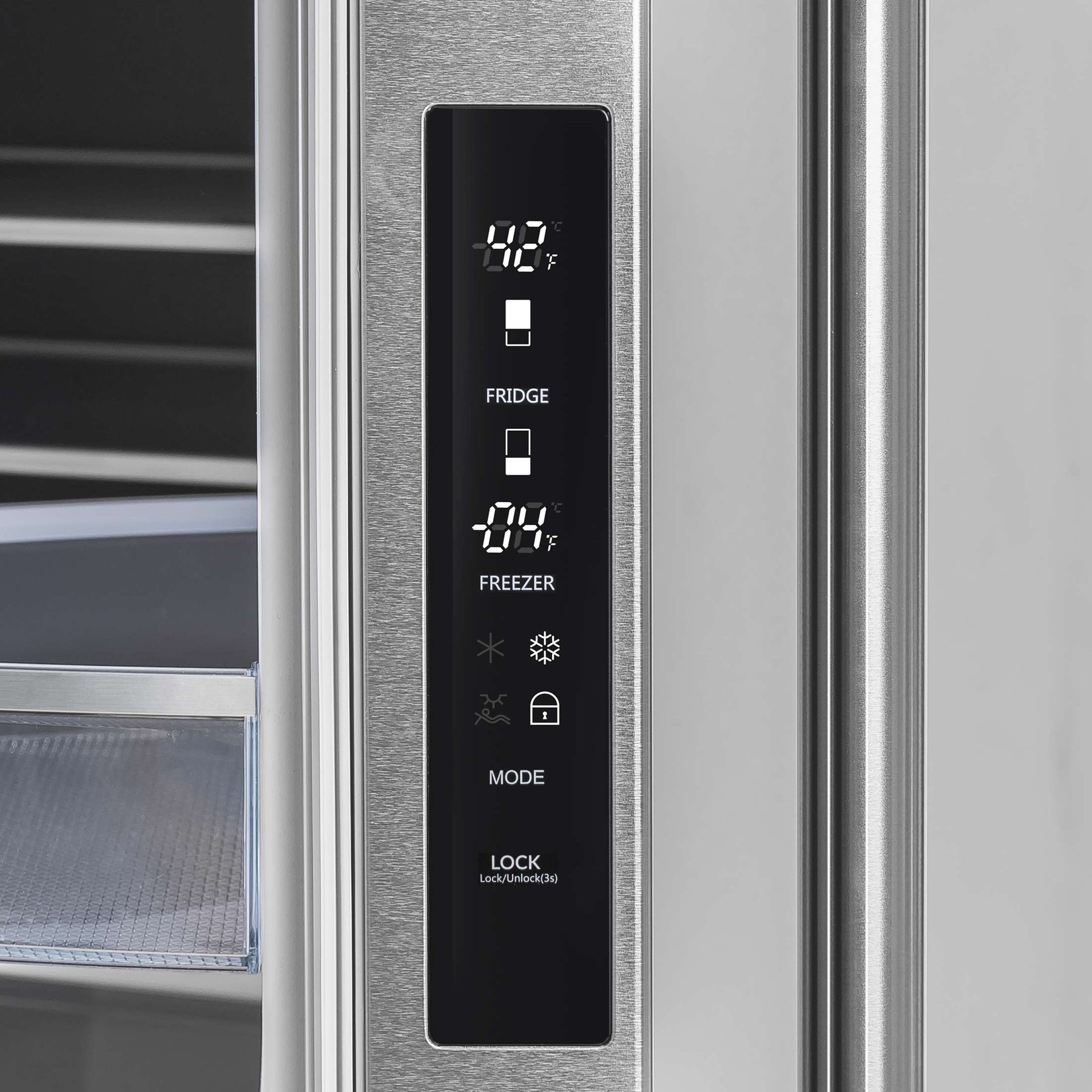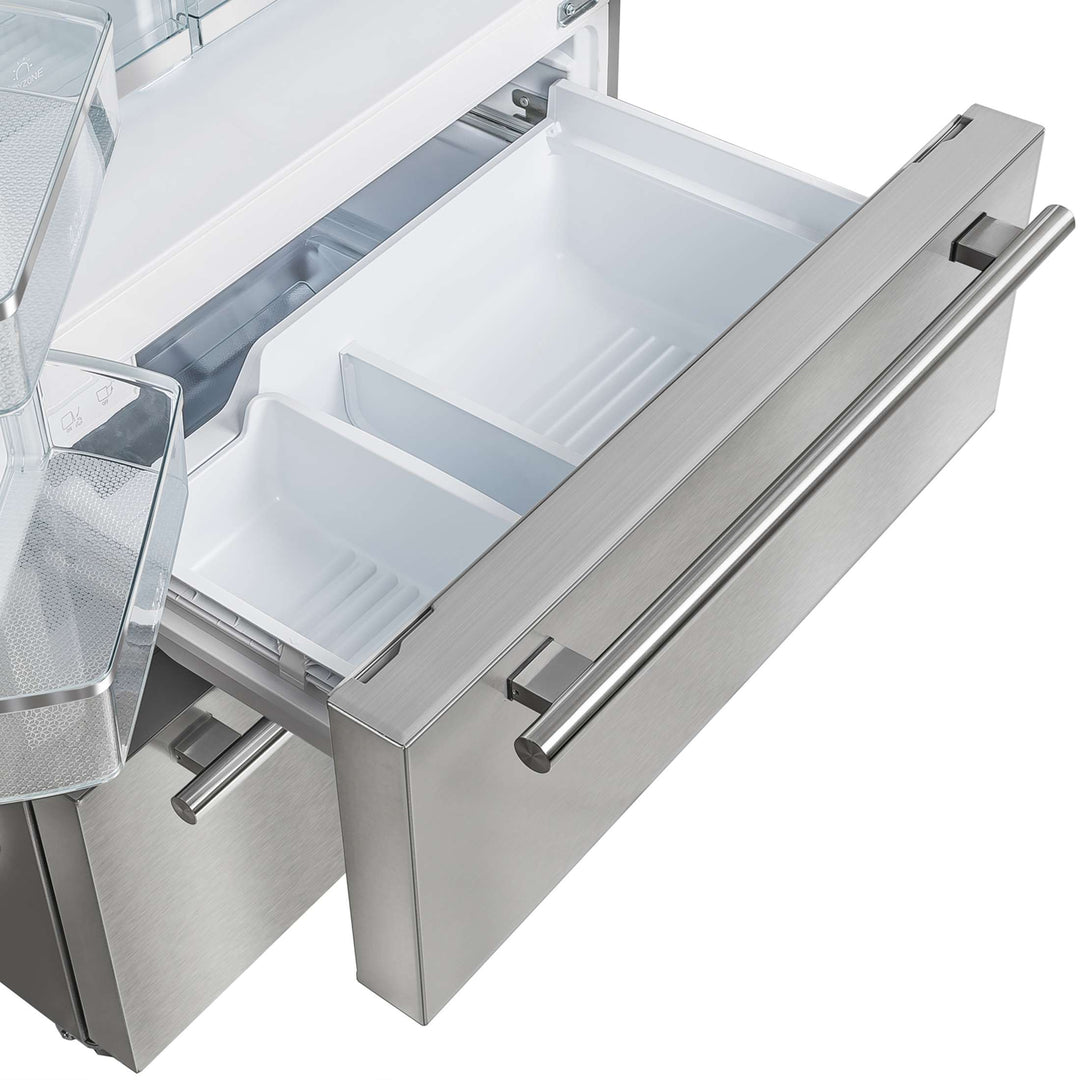 The Forno Alta Moena 36 Inch Stainless-Steel French Door refrigerator combines style and functionality with its frost-free multi-air flow cooling system, offering a spacious 19.2 cu.ft. capacity. Adjustable shelving ensures versatile grocery storage, complemented by a compressor inverter for energy efficiency, quiet operation, and precise temperature control. The LED touch panel provides convenient access and control. The fresh food storage (12.1 cu.ft.) features a premium stainless-steel back panel, three glass shelves (two adjustable), two crisper drawers, and ample door storage, all elegantly finished with sleek silver trim. The 7.14 cu.ft. freezer boasts organized storage with two pull-out drawers, a slide-out tray, and a high-capacity automatic ice maker producing up to 4 pounds of ice daily. This counter depth unit also includes a stainless-steel interior panel and silver trim shelves and door bins for a modern touch. ENERGY STAR Certified, it incorporates high-efficiency LED lighting to minimize food spoilage.