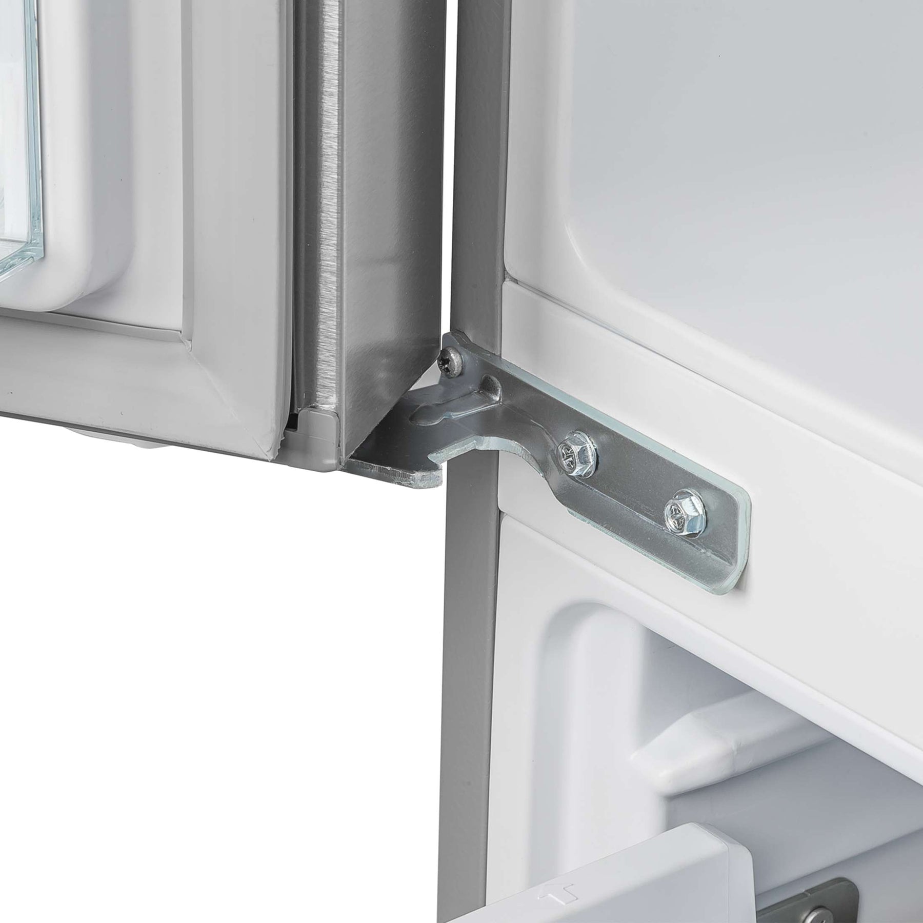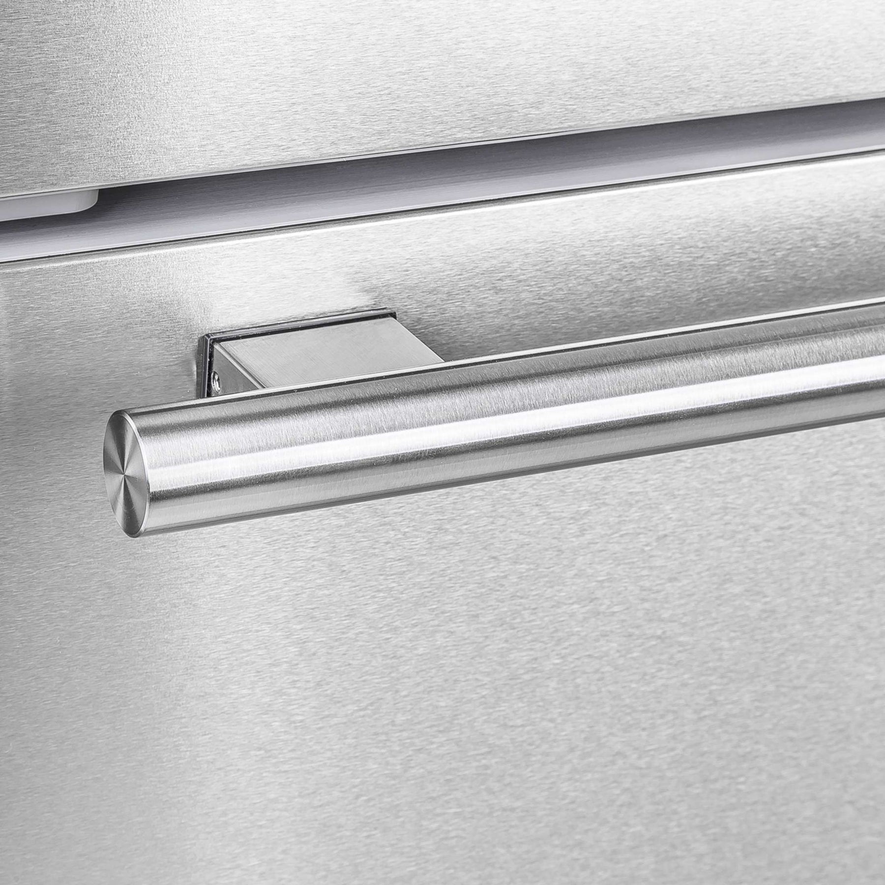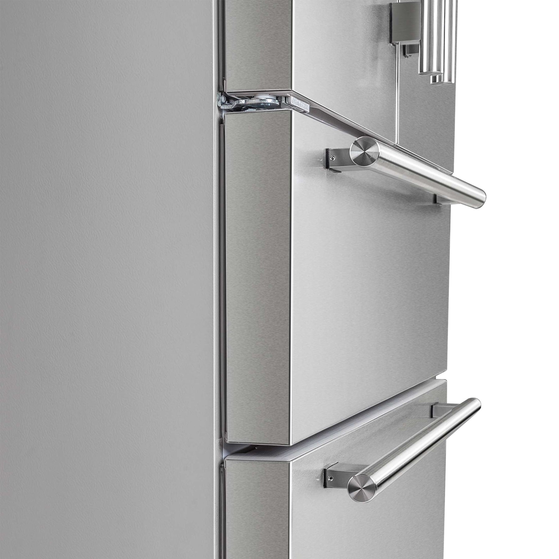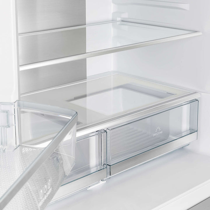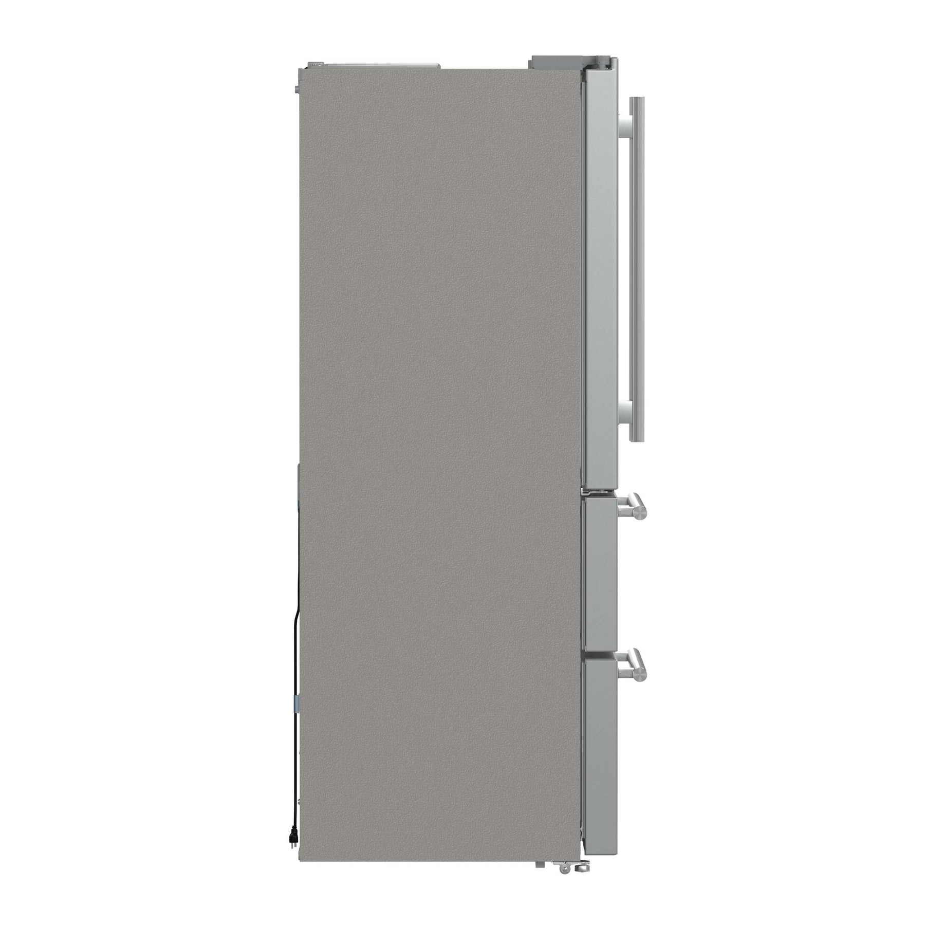 The Forno Alta Moena 36 Inch Stainless-Steel French Door refrigerator combines style and functionality with its frost-free multi-air flow cooling system, offering a spacious 19.2 cu.ft. capacity. Adjustable shelving ensures versatile grocery storage, complemented by a compressor inverter for energy efficiency, quiet operation, and precise temperature control. The LED touch panel provides convenient access and control. The fresh food storage (12.1 cu.ft.) features a premium stainless-steel back panel, three glass shelves (two adjustable), two crisper drawers, and ample door storage, all elegantly finished with sleek silver trim. The 7.14 cu.ft. freezer boasts organized storage with two pull-out drawers, a slide-out tray, and a high-capacity automatic ice maker producing up to 4 pounds of ice daily. This counter depth unit also includes a stainless-steel interior panel and silver trim shelves and door bins for a modern touch. ENERGY STAR Certified, it incorporates high-efficiency LED lighting to minimize food spoilage.
