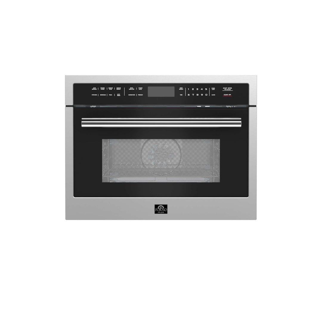 The Forno Oliena 24" Microwave & Convection Oven combines sleek design with versatile functionality, making it an essential addition to any modern kitchen. Its durable stainless-steel interior ensures easy cleaning, while intuitive glass touch controls and an LCD display provide effortless navigation. With 1,000 watts of microwave power, it heats food quickly, boiling water in just 1 minute and 50 seconds. Switch to convection mode for even cooking with 1,700 watts of true convection, or utilize the 1,750-watt broil and 600-watt bake functions for perfectly cooked meals without using your main oven. Sensor cooking, auto menu options, and specialized modes like defrost, popcorn, and beverage heating enhance convenience. The rapid preheat feature minimizes wait times, so your dishes are ready faster. Designed for performance and efficiency, this combination microwave oven elevates your cooking experience with precision and speed.
