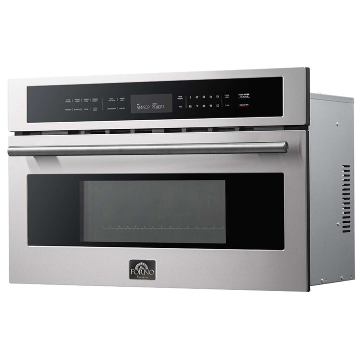 The Forno Oliena 30" Microwave & Convection Oven combines sleek design with versatile functionality, making it an essential addition to any modern kitchen. Its durable stainless-steel interior ensures easy cleaning, while intuitive glass touch controls and an LCD display provide effortless navigation. With 1,000 watts of microwave power, it heats food quickly, boiling water in just 1 minute and 50 seconds. Switch to convection mode for even cooking with 1,700 watts of true convection, or utilize the 1,750-watt broil and 600-watt bake functions for perfectly cooked meals without using your main oven. Sensor cooking, auto menu options, and specialized modes like defrost, popcorn, and beverage heating enhance convenience. The rapid preheat feature minimizes wait times, so your dishes are ready faster. Designed for performance and efficiency, this combination microwave oven elevates your cooking experience with precision and speed.