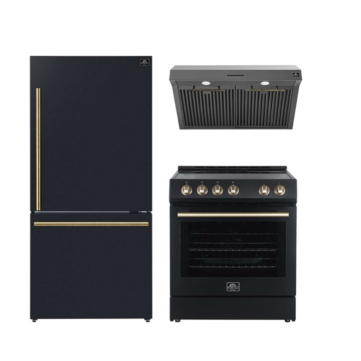 Upgrade your kitchen with the FORNO Premium 3-Piece Kitchen Bundle. This bundle includes the Leonardo Espresso 30" Black Electric Range, the 30" Black Under Cabinet Range Hood, and the 31" Black Bottom Freezer Refrigerator. Each appliance features a sleek black finish, combining elegance and high performance.
