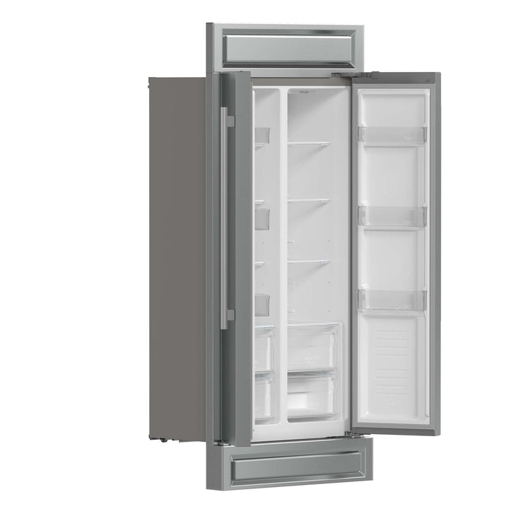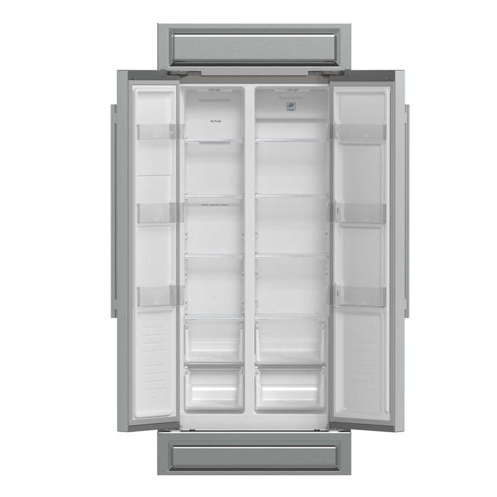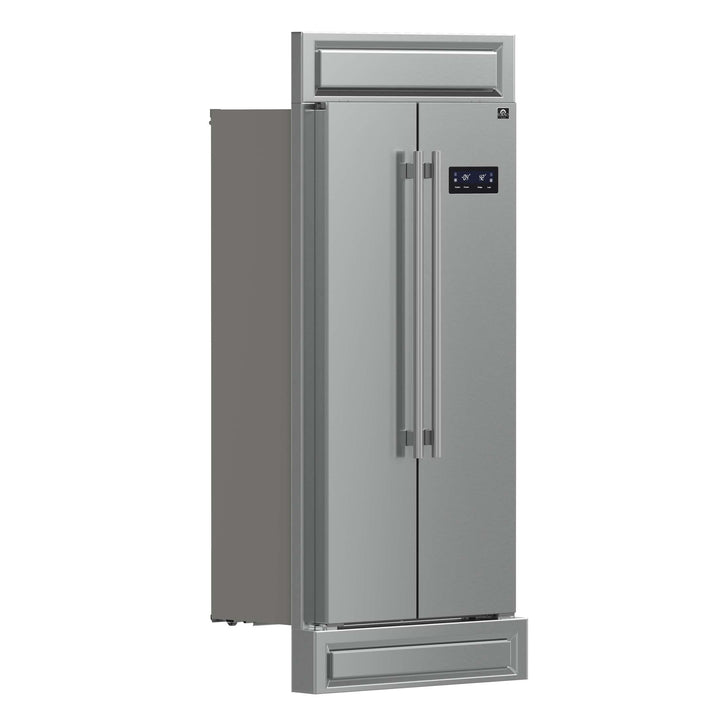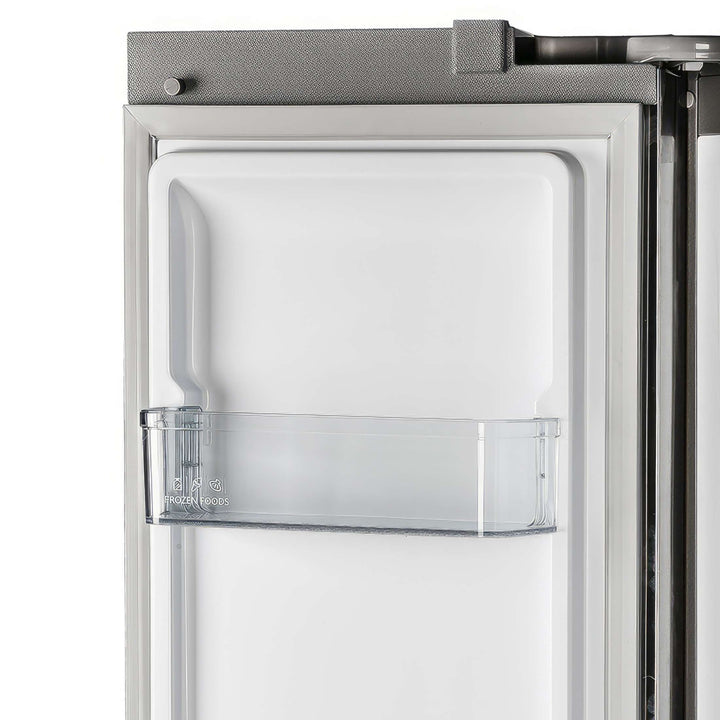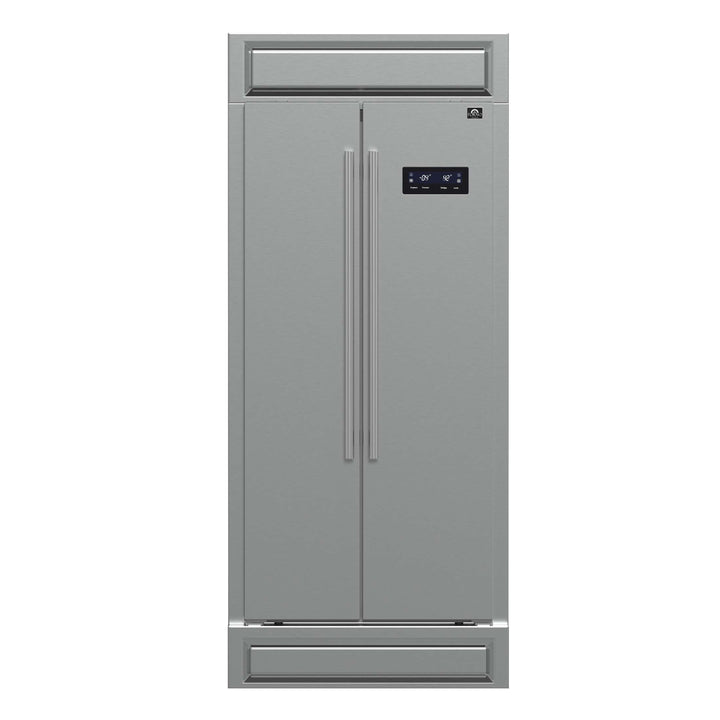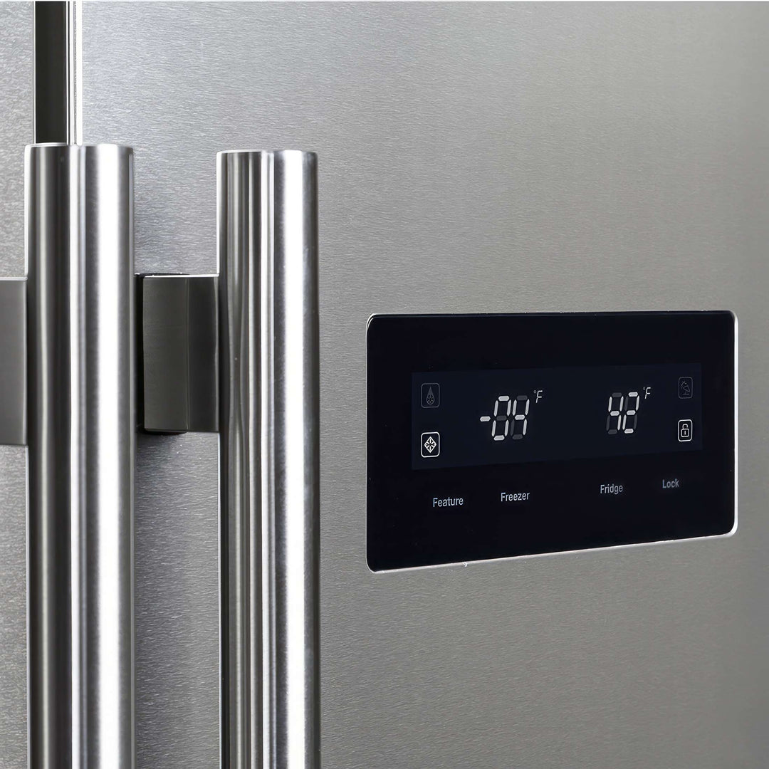 Upgrade your kitchen with the Forno Salerno 33" Side-by-Side Refrigerator, designed for functionality and energy-efficient performance. With a 15.6 cu. ft. total capacity, this frost-free refrigerator ensures hassle-free maintenance while keeping your food fresh. The decorative grill trim adds a touch of elegance, as well as 4 inches, making it a stylish addition to any kitchen. Equipped with an advanced temperature control system, this refrigerator maintains optimal cooling levels to preserve food and beverages. The intuitive LED touch panel offers effortless access to settings and controls. The fresh food compartment provides 9.54 cu. ft. of storage space, featuring three adjustable glass shelves, two crisper drawers, and three door bins for organized food storage. The freezer section offers 6.08 cu. ft. of capacity, complete with three adjustable shelves, two pull-out drawers, and three door bins, ensuring easy access to frozen essentials. With Energy Star Certification, the Forno Salerno delivers reliable performance while reducing energy consumption.