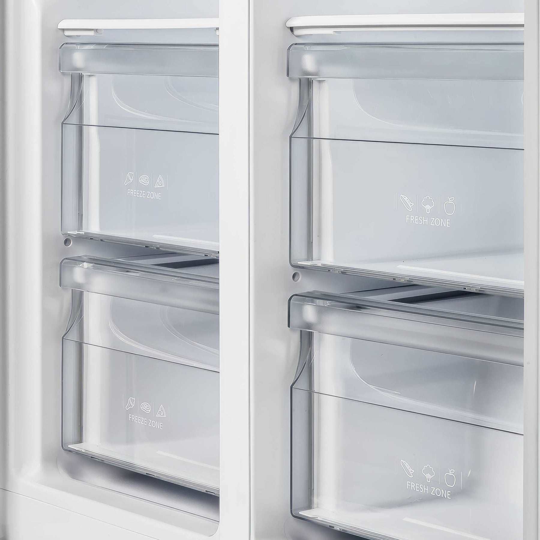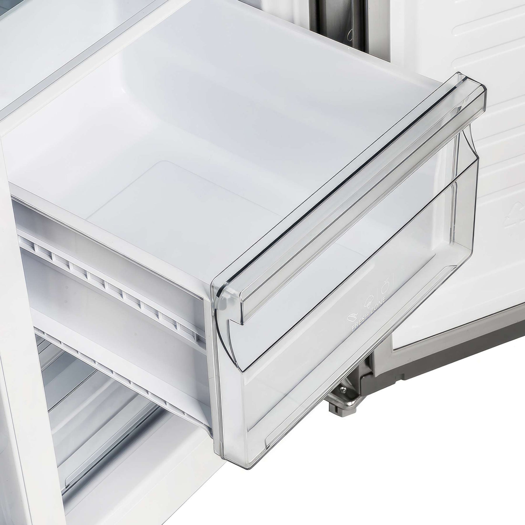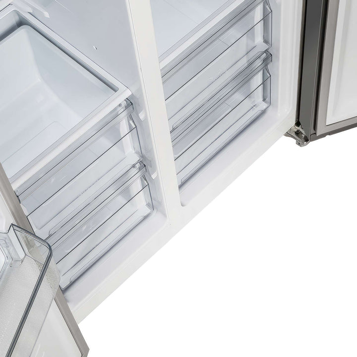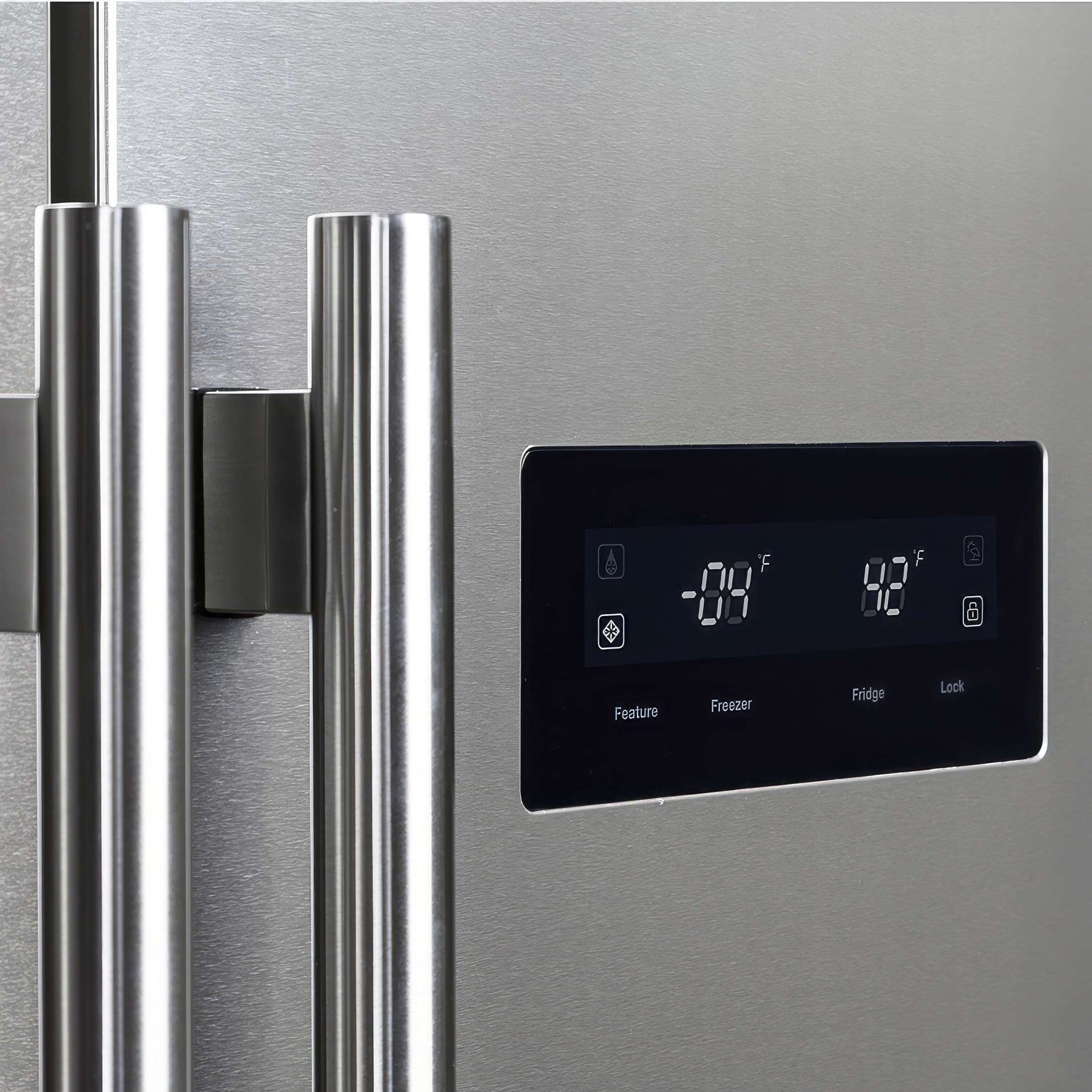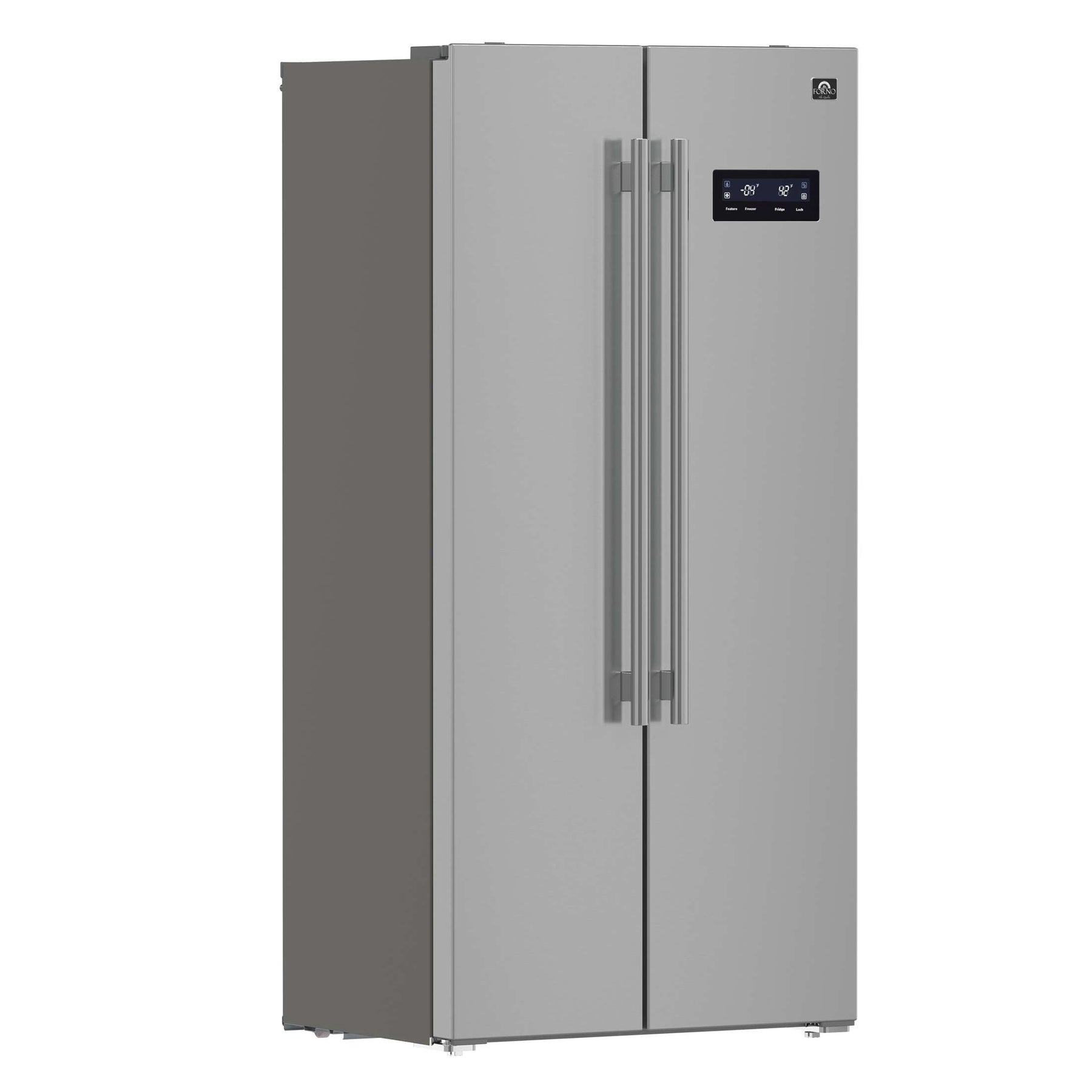 Upgrade your kitchen with the Forno Salerno 33" Side-by-Side Refrigerator, designed for functionality and energy-efficient performance. With a 15.6 cu. ft. total capacity, this frost-free refrigerator ensures hassle-free maintenance while keeping your food fresh. Equipped with an advanced temperature control system, this refrigerator maintains optimal cooling levels to preserve food and beverages. The intuitive LED touch panel offers effortless access to settings and controls. The fresh food compartment provides 9.54 cu. ft. of storage space, featuring three adjustable glass shelves, two crisper drawers, and three door bins for organized food storage. The freezer section offers 6.08 cu. ft. of capacity, complete with three adjustable shelves, two pull-out drawers, and three door bins, ensuring easy access to frozen essentials. With Energy Star Certification, the Forno Salerno delivers reliable performance while reducing energy consumption.