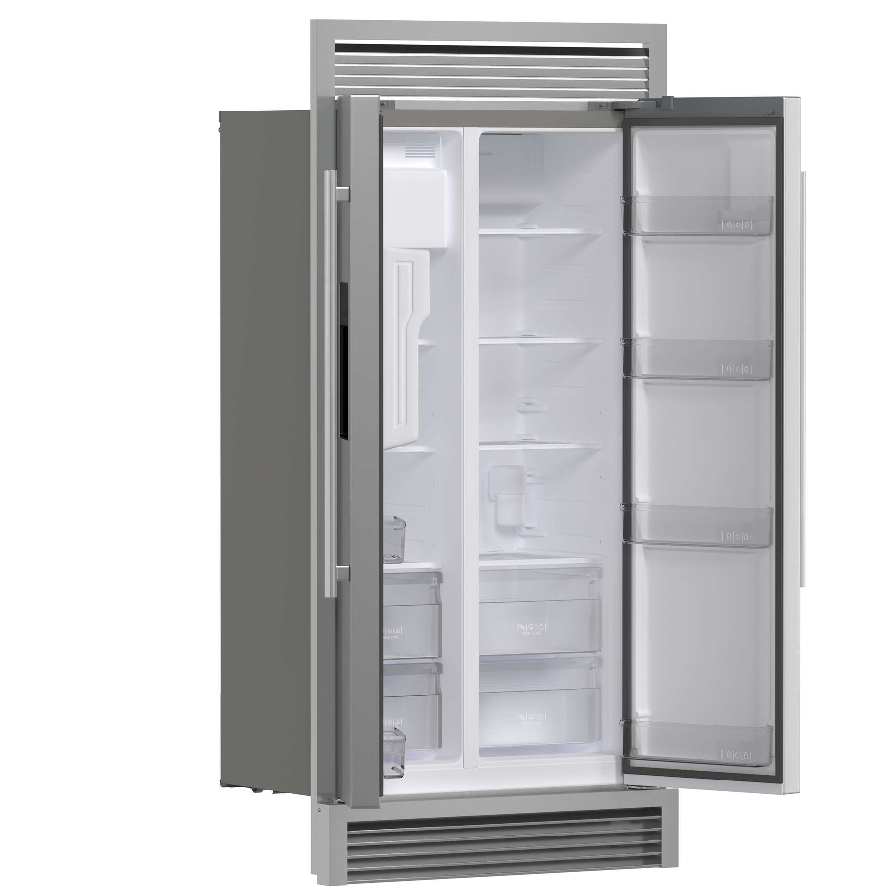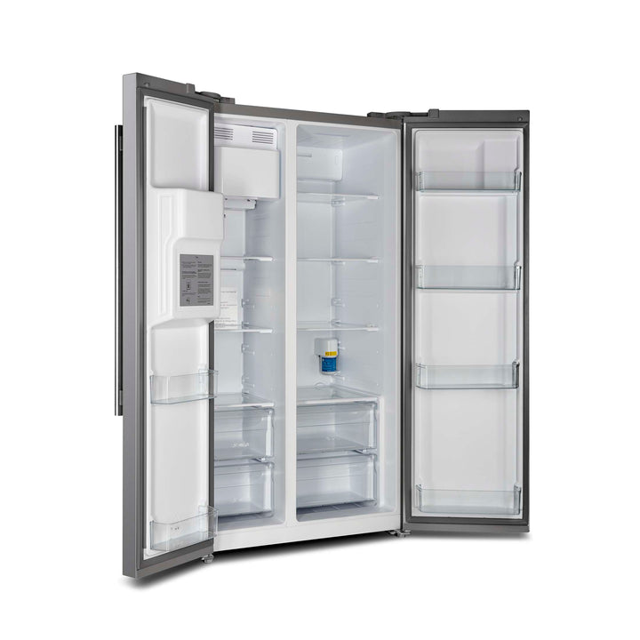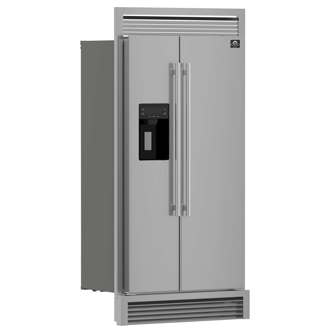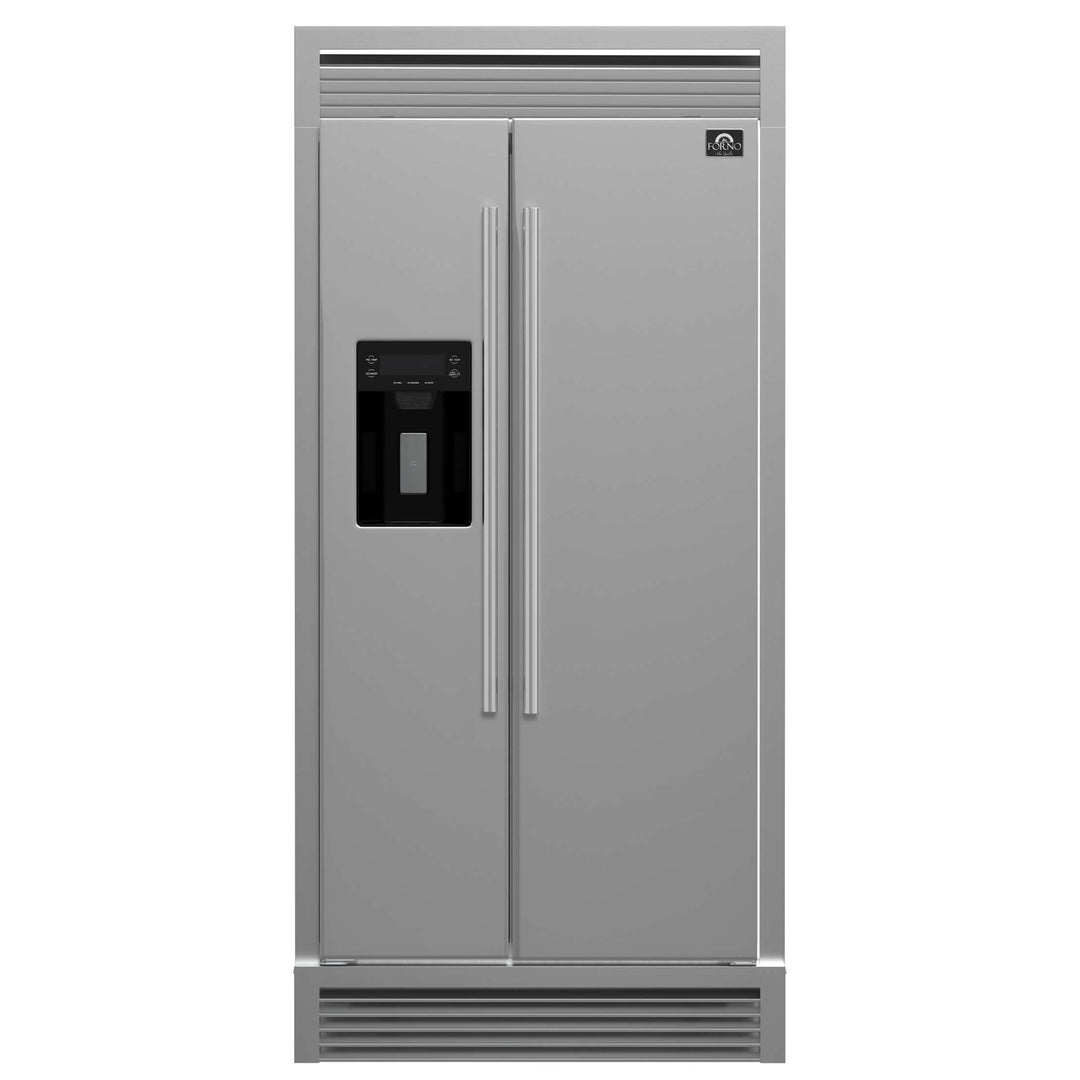 The Forno Salerno 40" Built-In Side-by-Side Refrigerator combines seamless integration with modern functionality. Designed for efficiency, its inverter compressor ensures quiet operation and precise temperature control, while the frost-free multi-air flow system keeps groceries fresh. With a spacious 20 cu. ft. capacity, this Energy Star Certified refrigerator features adjustable shelving, a 13.48 cu. ft. fresh food section with spill-proof shelves, storage drawers, and substantial door storage. The 6.53 cu. ft. freezer includes multiple shelves, bins, and drawers for easy organization. A built-in water and ice dispenser with a touchscreen panel offers effortless access to ice and temperature settings. Bright LED lighting enhances visibility while minimizing spoilage, making this refrigerator a stylish, high-performance addition to any kitchen.