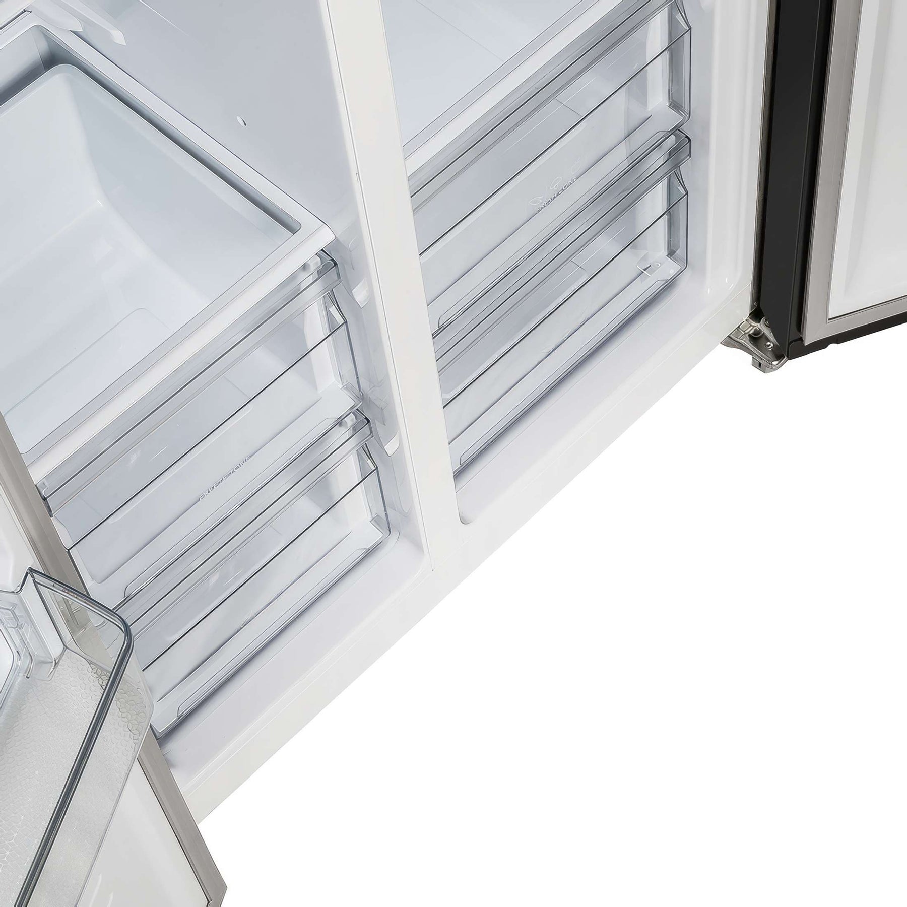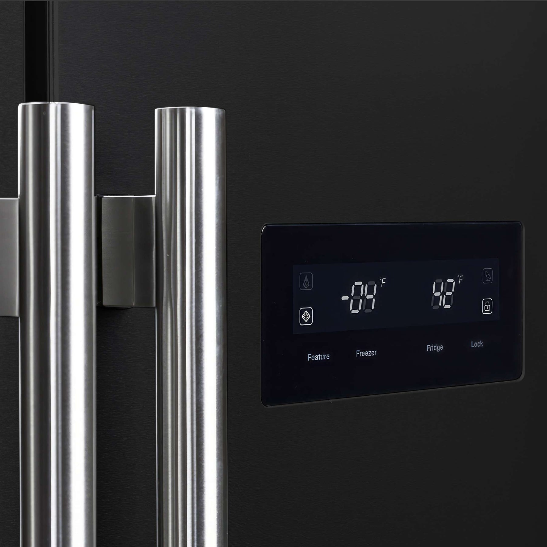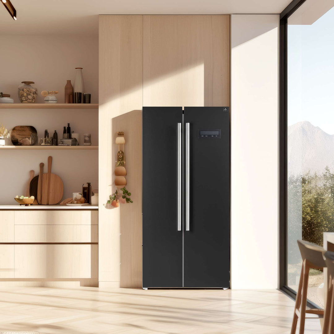 Upgrade your kitchen with the Forno Salerno 33" Side-by-Side Refrigerator, designed for functionality and energy-efficient performance. With a 15.6 cu. ft. total capacity, this frost-free refrigerator ensures hassle-free maintenance while keeping your food fresh. Equipped with an advanced temperature control system, this refrigerator maintains optimal cooling levels to preserve food and beverages. The intuitive LED touch panel offers effortless access to settings and controls. The fresh food compartment provides 9.54 cu. ft. of storage space, featuring three adjustable glass shelves, two crisper drawers, and three door bins for organized food storage. The freezer section offers 6.08 cu. ft. of capacity, complete with three adjustable shelves, two pull-out drawers, and three door bins, ensuring easy access to frozen essentials. With Energy Star Certification, the Forno Salerno delivers reliable performance while reducing energy consumption.