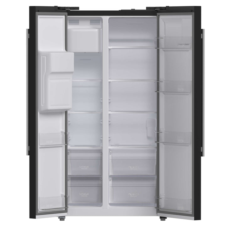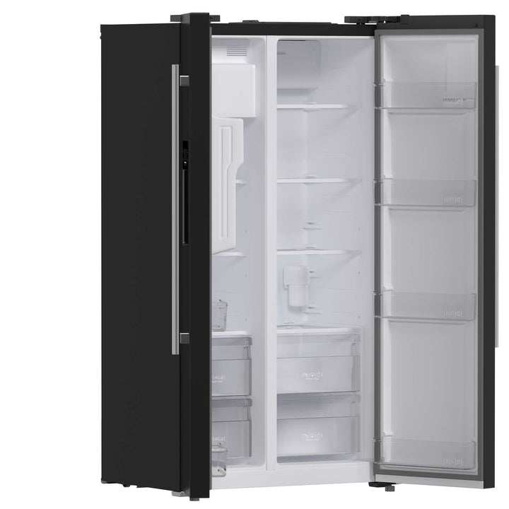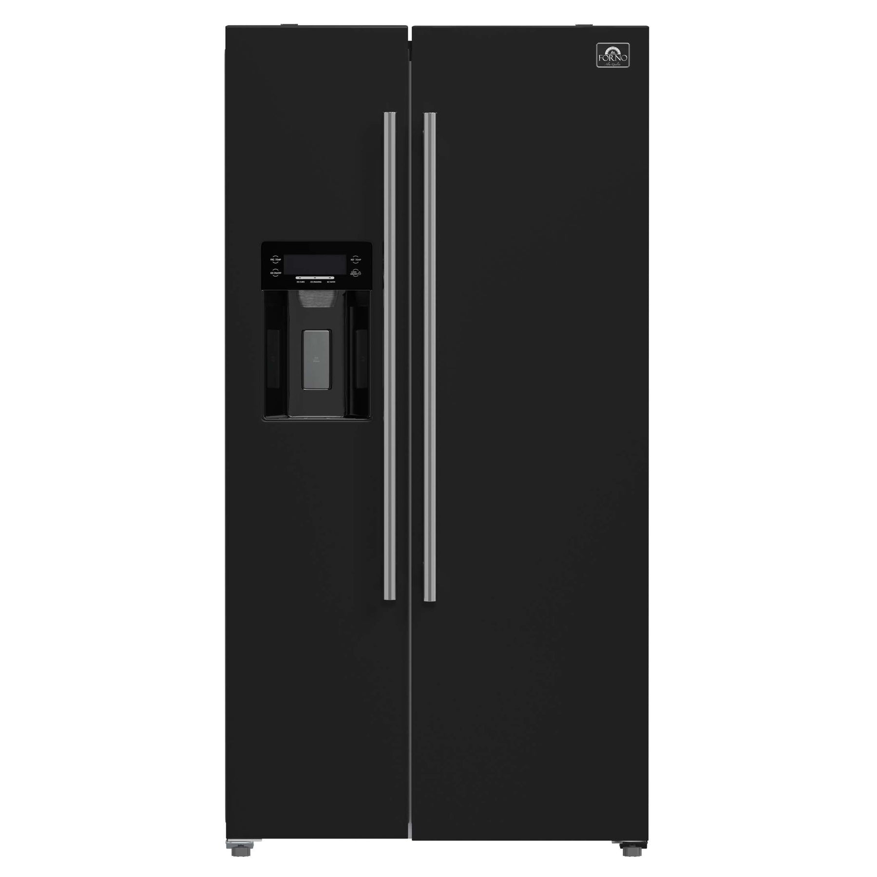 The Forno Salerno 36" Side-by-Side Refrigerator in black combines seamless integration with modern functionality. Designed for efficiency, its inverter compressor ensures quiet operation and precise temperature control, while the frost-free multi-air flow system keeps groceries fresh. With a spacious 20 cu. ft. capacity, this Energy Star Certified refrigerator features adjustable shelving, a 13.48 cu. ft. fresh food section with spill-proof shelves, storage drawers, and substantial door storage. The 6.53 cu. ft. freezer includes multiple shelves, bins, and drawers for easy organization. A built-in water and ice dispenser with a touchscreen panel offers effortless access to ice and temperature settings. Bright LED lighting enhances visibility while minimizing spoilage, making this refrigerator a stylish, high-performance addition to any kitchen.