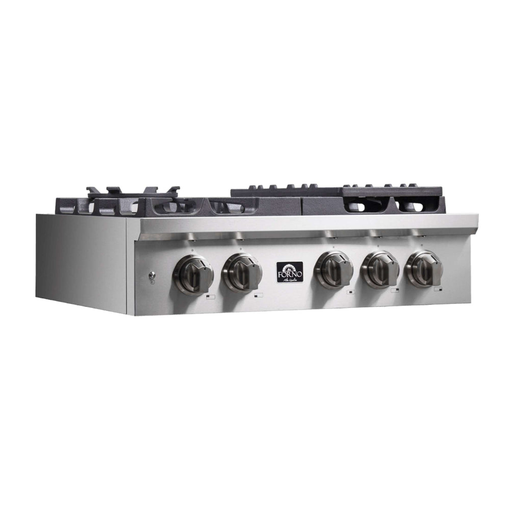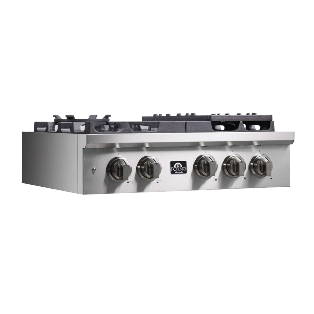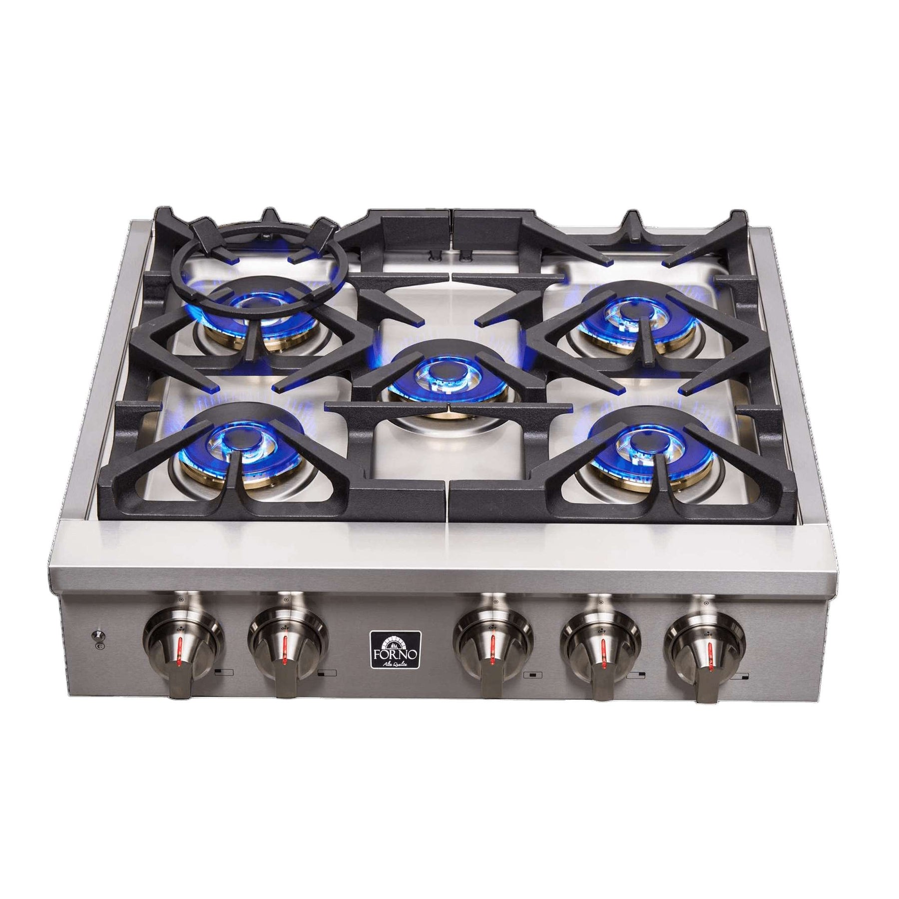 The Forno Spezia 30 Inch gas rangetop features 5 sealed dual brass burners totaling 100,000 BTUs for versatile cooking. Continuous cast iron grates simplify pan movement, while illuminated zinc control knobs offer precise gas cooking control. Includes auto-ignition, griddle, wok-ring, and LP conversion kit. Crafted from heavy-duty 304 stainless steel for easy cleaning, complementing any kitchen design alongside other Forno appliances.