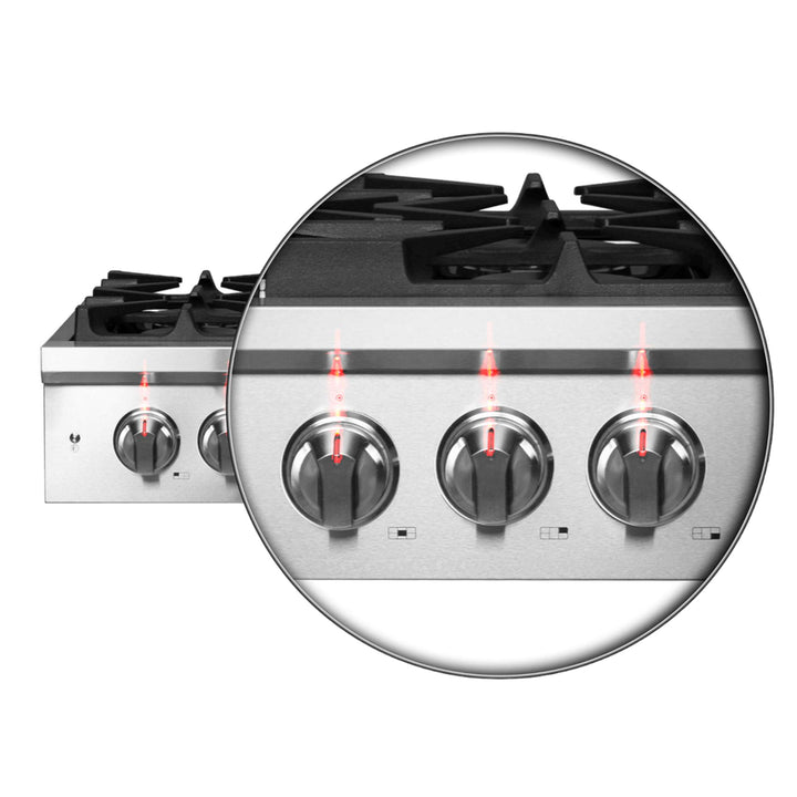 * Sealed dual-ring brass burners offer precise control for high-heat searing or delicate simmering.