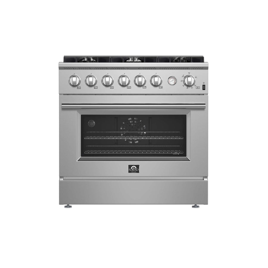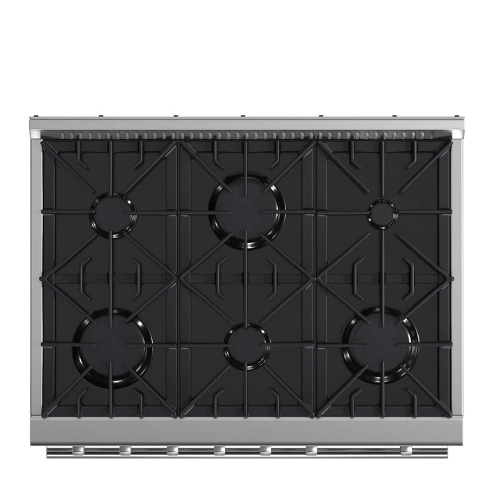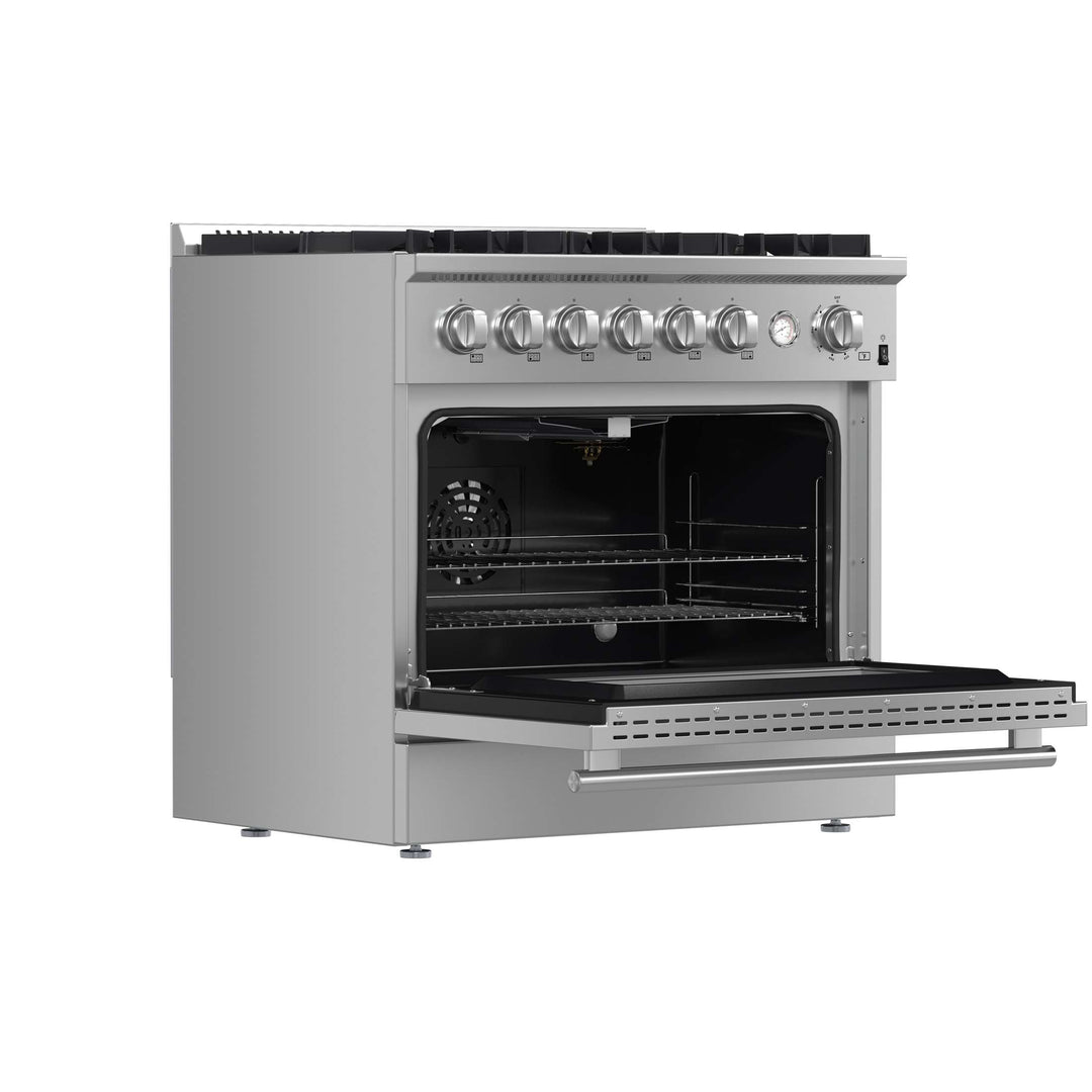 Upgrade your cooking with the Marco 36" Alta Qualita Gas Range – designed for home chefs who value performance and reliability. This 36" gas range features six sealed burners, including a 67,000 BTU dual-ring burner, perfect for rapid boiling, searing, or delicate simmering. The 5.36 cu. ft. convection oven, equipped with a powerful 26,000 BTU output, ensures even baking and roasting for every meal, from quick weeknight dinners to gourmet dishes. Durable cast iron grates provide stable cookware support and smooth movement, while the black enamel oven interior resists stains for easy cleanup.