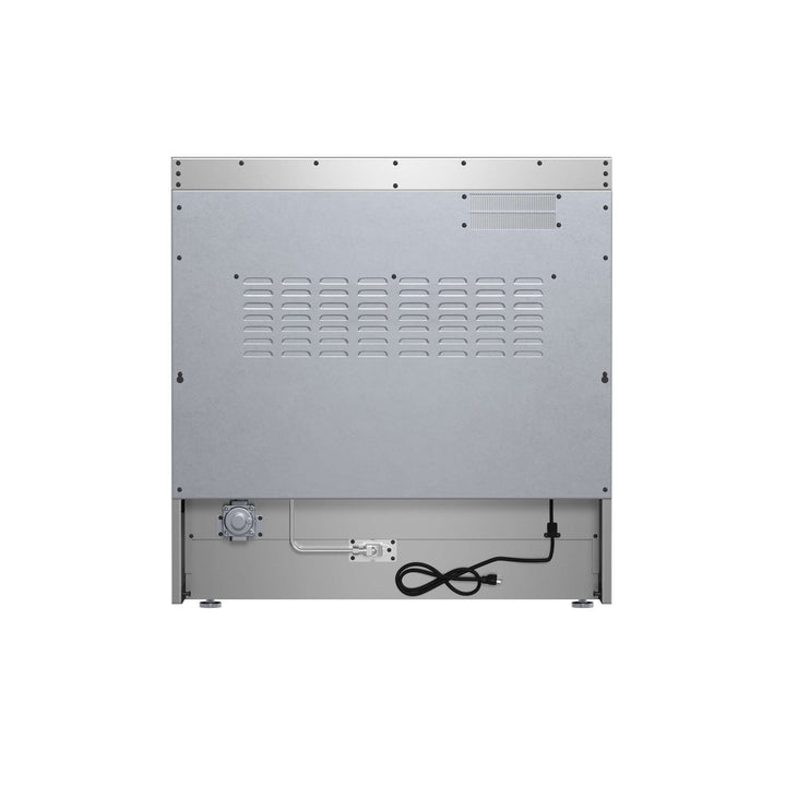 * The all-stainless steel finish, paired with a pro-style handle and zinc-coated metal knobs featuring decorative bezel rings, offers a sleek, professional look.