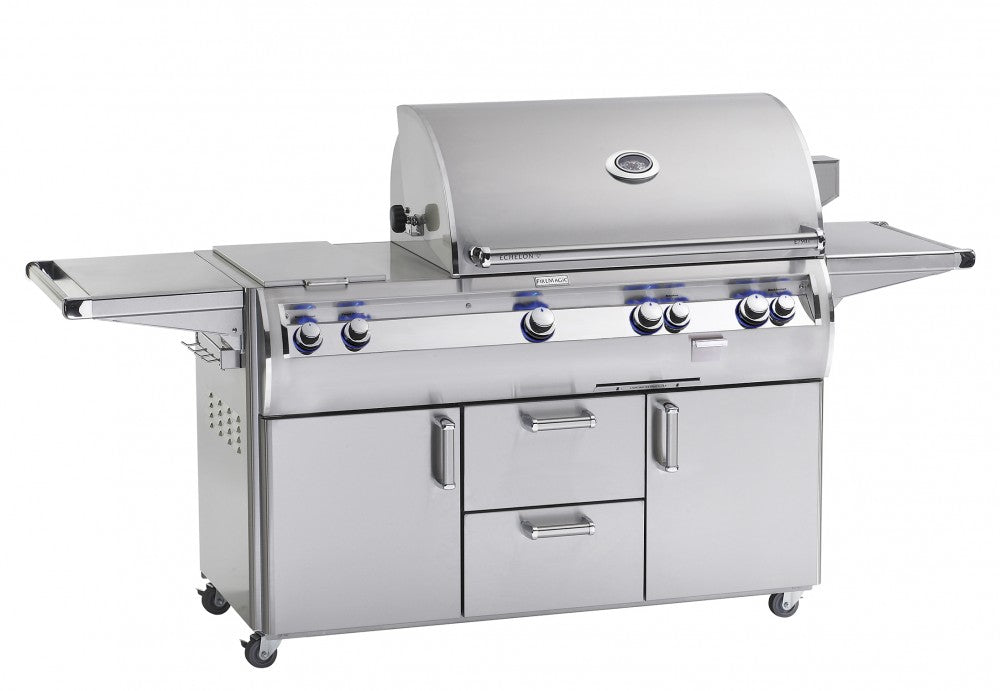 Exclusive Features of The ECHELON DIAMOND E790 include a builtin paper towel holder, backlit safety knobs, contoured control panel, heat zone separators, hot surface electronic ignition, cart has two 110V plug-in electrical outlets with 12V transformer (builtin requires hard wire, cart requires extension cord), dual internal halogen lamps in hood for easier evening grilling, manual tubes for match lighting, builtin analog thermometer, water tight wood chip smoker drawer with dedicated burner, new cast stainless steel "E" burners and stainless steel valve manifold. The newest addition to the Firemagic line. The second largest cooking surface across the line! This grill offers a true 36" across the cooking surface, not the FRAME of the grill like others measure. A total whopping BTU rating of 99,000 on the main cooking surface and a full-length backburner rated at 23,000 BTU's. The total cooking area is almost 800 sq. inches so it can hold just about anything you want to load up!The stainless steel cart features dual storage doors below, a stainless steel prep shelf on the right side, and heavy-duty cart casters for ease of portability. This unit also includes a dual side burner on the left side. Echelon Slide Show.