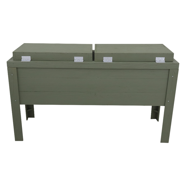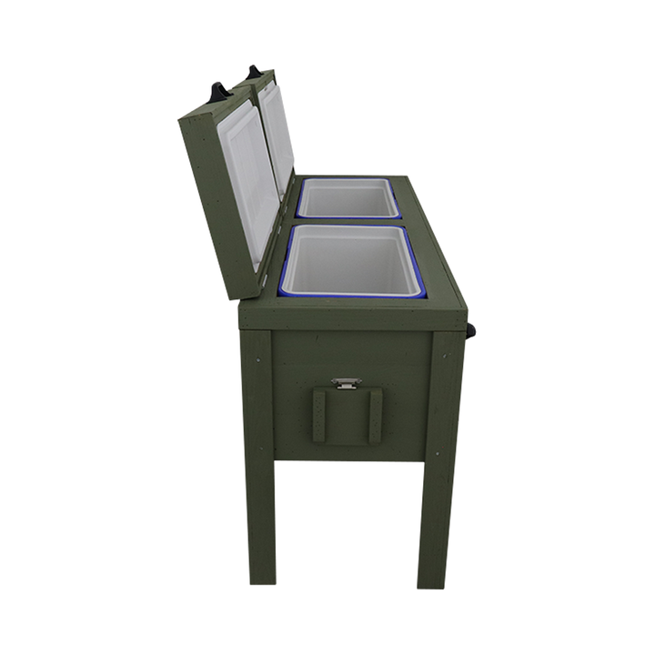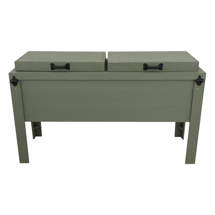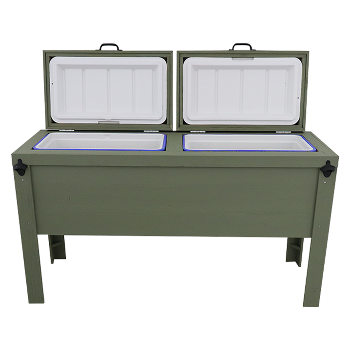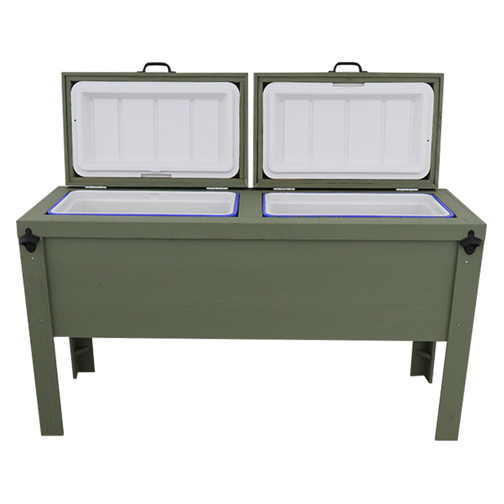Made in Texas from weathered “barn wood” allowing the product to maintain its rustic look for years to come. This cooler contains two Coleman brand 48 quart coolers. The large capacity interior holds up to 63 cans in each cooler and also has a convenient drain. This cooler has two separate coolers installed for great use at big or small events.